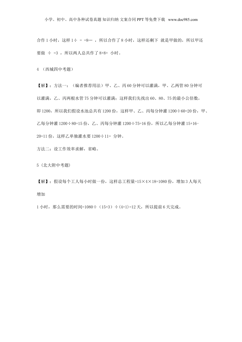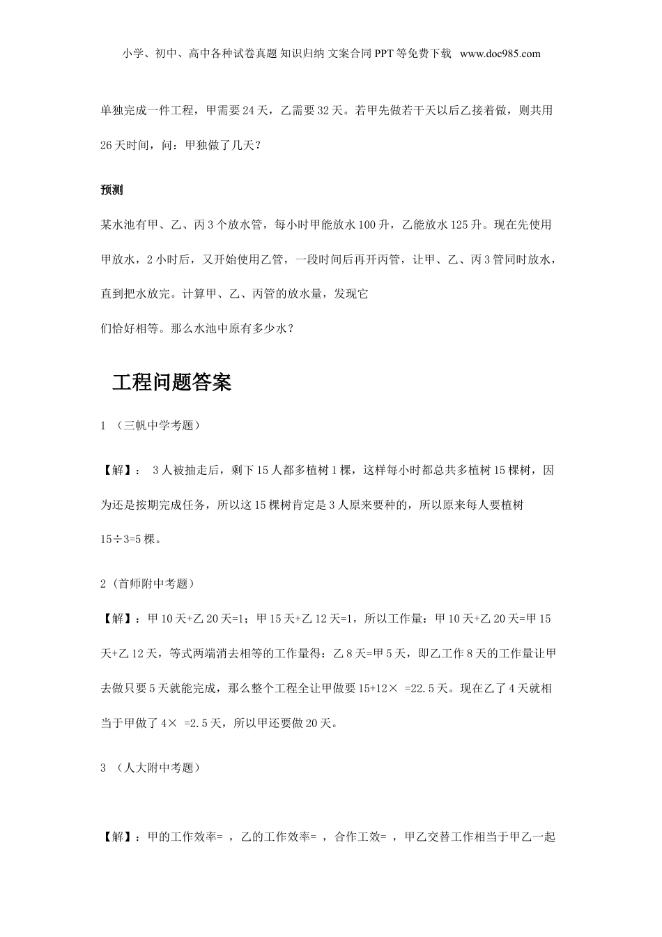 小学、初中、高中各种试卷真题知识归纳文案合同PPT等免费下载www.doc985.com小升初重点中学真题之工程问题篇1(三帆中学考题)原计划18个人植树,按计划工作了2小时后,有3个人被抽走了,于是剩下的人每小时比原计划多种1棵树,还是按期完成了任务.原计划每人每小时植______棵树.2(首师附中考题)一项工程,甲做10天乙20天完成,甲15天乙12也能完成。现乙先做4天,问甲还要多少天完成?3(人大附中考题)一部书稿,甲单独打字要14小时完成,乙单独打字要20小时完成。如果先由甲打1小时,然后由乙接替甲打1小时,再由甲接替乙打1小时,……两人如此交替工作。那么,打完这部书稿时,甲、乙二人共用了多少小时?4(西城四中考题)如果用甲、乙、丙三那根水管同时在一个空水池里灌水,1小时可以灌满;如果用甲、乙两管,1小时20分钟可以灌满;如果用乙、丙两根水管,1小时15分钟可以灌满,那么,用乙管单独灌水的话,灌满这一池的水需要______小时。预测有A,B两堆同样多的煤,如果只装运一堆煤,那么甲车需要20时,乙车需要24时,丙车需要30时。现在甲车装运A堆煤,乙车装运B堆煤,丙车开始先装运A堆煤,中途转向装运B堆煤,三车同时开始,同时结束装完这两堆煤。丙车装运A堆煤用了多少时间?预测小学、初中、高中各种试卷真题知识归纳文案合同PPT等免费下载www.doc985.com单独完成一件工程,甲需要24天,乙需要32天。若甲先做若干天以后乙接着做,则共用26天时间,问:甲独做了几天?预测某水池有甲、乙、丙3个放水管,每小时甲能放水100升,乙能放水125升。现在先使用甲放水,2小时后,又开始使用乙管,一段时间后再开丙管,让甲、乙、丙3管同时放水,直到把水放完。计算甲、乙、丙管的放水量,发现它们恰好相等。那么水池中原有多少水?工程问题答案1(三帆中学考题)【解】:3人被抽走后,剩下15人都多植树1棵,这样每小时都总共多植树15棵树,因为还是按期完成任务,所以这15棵树肯定是3人原来要种的,所以原来每人要植树15÷3=5棵。2(首师附中考题)【解】:甲10天+乙20天=1;甲15天+乙12天=1,所以工作量:甲10天+乙20天=甲15天+乙12天,等式两端消去相等的工作量得:乙8天=甲5天,即乙工作8天的工作量让甲去做只要5天就能完成,那么整个工程全让甲做要15+12×=22.5天。现在乙了4天就相当于甲做了4×=2.5天,所以甲还要做20天。3(人大附中考题)【解】:甲的工作效率=,乙的工作效率=,合作工效=,甲乙交替工作相当于甲乙一起小学、初中、高中各种试卷真题知识归纳文案合同PPT等免费下载www.doc985.com合作1小时,这样1÷==8…,所以合作了8小时,这样还剩下就是甲做的,所以甲还要做÷=3,所以两人总共作了8+8+小时。4(西城四中考题)【解】:方法一:(编者推荐用法)甲、乙、丙60分钟可以灌满,甲、乙两管80分钟可以灌满,乙、丙两根水管75分钟可以灌满;这样我们先找出60、80、75的最小公倍数,即1200,所以我们假设水池总共有1200份,这样甲、乙、丙每分钟灌1200÷60=20份,甲、乙每分钟灌1200÷80=15份,乙、丙每分钟灌1200÷75=16份,所以乙每分钟灌15+16-20=11份,这样乙单独灌水要1200÷11=分钟。方法二:设工作效率求解,省略。5(北大附中考题)【解】:假设每个工人每小时做一份,这样总工程量=15×4×18=1080份,增加3人每天增加1小时,那么需要的时间=1080÷(15+3)÷(4+1)=12天,所以提前6天完成。小学、初中、高中各种试卷真题知识归纳文案合同PPT等免费下载www.doc985.com北大附中辅导班试题之:工程问题(一)小学、初中、高中各种试卷真题知识归纳文案合同PPT等免费下载www.doc985.com小学、初中、高中各种试卷真题知识归纳文案合同PPT等免费下载www.doc985.com北大附中辅导班试题之:工程问题(二)小学、初中、高中各种试卷真题知识归纳文案合同PPT等免费下载www.doc985.com小学、初中、高中各种试卷真题知识归纳文案合同PPT等免费下载www.doc985.com小学、初中、高中各种试卷真题知识归纳文案合同PPT等免费下载www.doc985.com小学、初中、高中各种试卷真题知识归纳文案合同PPT等免费下载www.doc985.com北大附中培训试题系列之:工程问题(一)小学、...