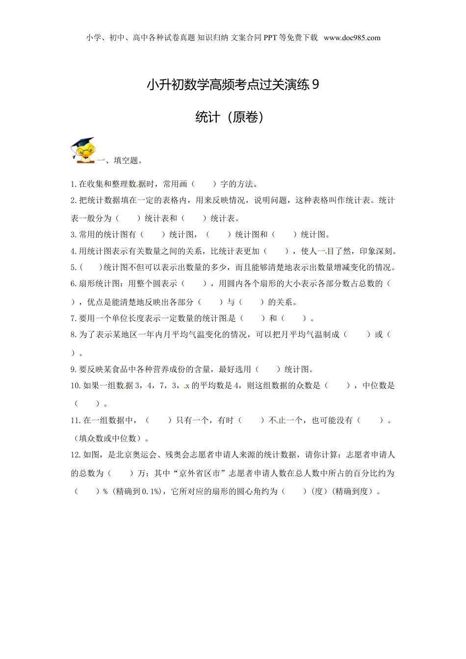 小学、初中、高中各种试卷真题知识归纳文案合同PPT等免费下载www.doc985.com小升初数学高频考点过关演练9统计(原卷)一、填空题。1.在收集和整理数据时,常用画()字的方法。2.把统计数据填在一定的表格内,用来反映情况,说明问题,这种表格叫作统计表。统计表一般分为()统计表和()统计表。3.常用的统计图有()统计图,()统计图和()统计图。4.用统计图表示有关数量之间的关系,比统计表更加(),使人一目了然,印象深刻。5.()统计图不但可以表示出数量的多少,而且能够清楚地表示出数量增减变化的情况。6.扇形统计图:用整个圆表示(),用圆内各个扇形的大小表示各部分数占总数的(),优点是能清楚地反映出各部分()与()的关系。7.要用一个单位长度表示一定数量的统计图是()和()。8.为了表示某地区一年内月平均气温变化的情况,可以把月平均气温制成()或()。9.要反映某食品中各种营养成份的含量,最好选用()统计图。10.如果一组数据3,4,7,3,x的平均数是4,则这组数据的众数是(),中位数是()。11.在一组数据中,()只有一个,有时()不止一个,也可能没有()。(填众数或中位数)。12.如图,是北京奥运会、残奥会志愿者申请人来源的统计数据,请你计算:志愿者申请人的总数为()万;其中“京外省区市”志愿者申请人数在总人数中所占的百分比约为()%(精确到0.1%),它所对应的扇形的圆心角约为()(度)(精确到度)。小学、初中、高中各种试卷真题知识归纳文案合同PPT等免费下载www.doc985.com二、选择题。1.计算机上,为了让使用者清楚、直观地看出磁盘“已用空间”与“可用空间”占“整个磁盘空间”的百分比,使用的统计图是()。A.条形统计图B.折线统计图[来源:Z|xx|k.Com]C.扇形统计图D.条形统计图或折线统计图2.对于数据2、4、4、5、3、9、4、5、1、8,其众数、中位数与平均数分别为()。A.4,4,6B.4,6,4.5C.4,4,4.5D.5,6,4.5三、制图。1.下面记录的是六(2)班女生1分钟仰卧起坐测验的成绩。(单位:次)3432302831302526342739373429262131273428(1)根据上面的成绩制一张统计表,再算出该班女生1分钟做仰卧起坐的平均次数。(2)根据统计表制成条形统计图。小学、初中、高中各种试卷真题知识归纳文案合同PPT等免费下载www.doc985.com2.某市无线电一厂、二厂2009—2013年的产值增长情况如下表。根据下表中的数据,制成复式折线统计图。四、解决问题。1.某市六年(4)班50名女学生进行一分钟仰卧起坐次数测试,测试情况绘制成表格如下:(1)求这次抽样测试数据的平均数、众数和中位数;(2)根据这一样本数据的特点,你认为该班女生一分钟仰卧起坐项目测试的合格标准应定为多少次较为合适?简要说明理由。2.某食品公司2013年上半年生产情况如下面的绣计图。年份产值20092010201120122013无线电一厂4000600095001200018000无线电二厂40004500550065009100小学、初中、高中各种试卷真题知识归纳文案合同PPT等免费下载www.doc985.com[来源:学.科.网](1)几月份产量最高?几月份产量最低?(2)上半年平均月产量为多少吨?(3)3月份产量比1月份产量增加了百分之几?[来源:Zxxk.Com]3.下面是两架模型飞机在一次飞行中飞行时间和飞行髙度的记录。[来源:学&科&网Z&X&X&K](1)起飞后第10秒时两架飞机的高度各是多少米?(2)起飞后第几秒两架飞机的飞行髙度相同?(3)起飞后第几秒两架飞机的飞行髙度相差最大?小学、初中、高中各种试卷真题知识归纳文案合同PPT等免费下载www.doc985.com4.下面是六年级学生最喜欢的体育活动统计图。[来源:学.科.网](1)若学校六年级共有学生450人,则喜欢跳绳的有多少人?喜欢足球的有多少人?(2)喜欢羽毛球的比喜欢排球的多多少人?5.五位裁判员给一名体操运动员评分后,去掉一个最高分和一个最低分,平均得9.58分;只去掉一个最高分,平均得9.46分;只去掉一个最低分,平均得9.66分。这个运动员的最高分与最低分相差多少?参考答案:一、1.正2.单式复式3.条形折线扇形4.形象具体5.折线6.总线百分比数量总数之间7.条形统计图折线统计图8.折线统计图条形统计图9.扇形10.3311.中位数众数众数12.1...