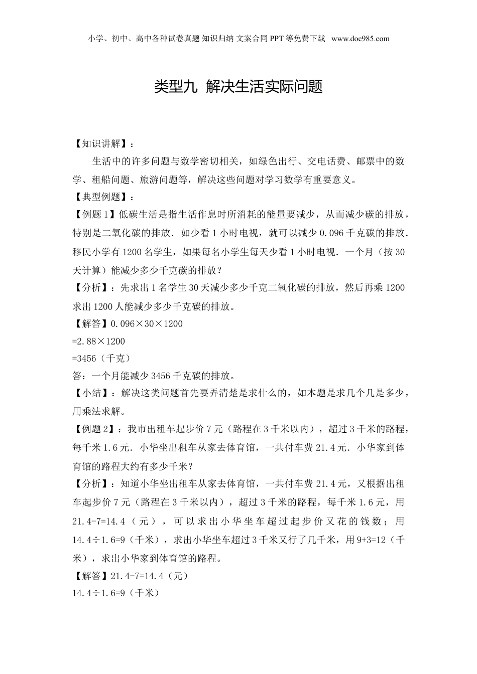 小学、初中、高中各种试卷真题知识归纳文案合同PPT等免费下载www.doc985.com类型九解决生活实际问题【知识讲解】:生活中的许多问题与数学密切相关,如绿色出行、交电话费、邮票中的数学、租船问题、旅游问题等,解决这些问题对学习数学有重要意义。【典型例题】:【例题1】低碳生活是指生活作息时所消耗的能量要减少,从而减少碳的排放,特别是二氧化碳的排放.如少看1小时电视,就可以减少0.096千克碳的排放.移民小学有1200名学生,如果每名小学生每天少看1小时电视.一个月(按30天计算)能减少多少千克碳的排放?【分析】:先求出1名学生30天减少多少千克二氧化碳的排放,然后再乘1200求出1200人能减少多少千克碳的排放。【解答】0.096×30×1200=2.88×1200=3456(千克)答:一个月能减少3456千克碳的排放。【小结】:解决这类问题首先要弄清楚是求什么的,如本题是求几个几是多少,用乘法求解。【例题2】:我市出租车起步价7元(路程在3千米以内),超过3千米的路程,每千米1.6元.小华坐出租车从家去体育馆,一共付车费21.4元.小华家到体育馆的路程大约有多少千米?【分析】:知道小华坐出租车从家去体育馆,一共付车费21.4元,又根据出租车起步价7元(路程在3千米以内),超过3千米的路程,每千米1.6元,用21.4-7=14.4(元),可以求出小华坐车超过起步价又花的钱数;用14.4÷1.6=9(千米),求出小华坐车超过3千米又行了几千米,用9+3=12(千米),求出小华家到体育馆的路程。【解答】21.4-7=14.4(元)14.4÷1.6=9(千米)[来源:Z。xx。k.Com]小学、初中、高中各种试卷真题知识归纳文案合同PPT等免费下载www.doc985.com9+3=12(千米)答:小华家到体育馆的路程大约有12千米。[来源:学#科#网Z#X#X#K]【小结】:解答此类问题的关键是:将车费分成两部分,3千米以内的花费和3千米以外的花费,问题即可得解。【巩固练习】1.低碳生活是指生活作息时所消耗的能量要尽力减少,从而减少碳特别是二氧化碳的排放,从而减少对大气的污染,减缓生态恶化.如少看l0分钟电视,就可以减少l.6克碳的排放,如果每天少看l小时40分钟电视能减少多少克碳的排放?2.低碳生活是指生活作息时要减少所耗能量,从而减少碳的排放,特别是减少二氧化碳的排放.少丢1千克垃圾,就可以减少2.06千克碳的排放。小浩家7月份丢弃垃圾28千克,比6月份少丢弃20%,6月份小浩家丢弃垃圾排放了多少千克的碳?3.某市出租车起步价为7元(路程在3千米以内),超过3千米的路程,按1.2元/千米计费.小华坐出租车从家去体育馆,一共付车费21.4元.小华家到体育馆的路程大约有多少千米?4.盐城市区出租车的计费标准是:起步价(3千米以内,包括3千米)7元,以后每超过1千米(不足1千米的按1千米计算)另加价1.6元。(1)请你算一算,乘车7千米要付多少钱?小学、初中、高中各种试卷真题知识归纳文案合同PPT等免费下载www.doc985.com(2)如果你有20元钱,最多可以乘车多少千米?5.某城市进行水费调整,居民每月每户用水缴费标准如下:用水量20吨及20吨以下20吨以上的部分收费标准每吨2.5元每吨4元小明家本月交了90元,他家用了多少吨水?6.(清河区)某市居民每月每户用水缴费原来每立方米1.90元,现作如下调整:用水量20立方米及以下20立方米以上的部分收费标准每立方米2.30元每立方米3.45元根据以上有关信息完成:王大伯家今年5月份的水费,按新的收费标准比原来多缴20.4元,王大伯家这个月用水量是多少立方米?[来源:学科网]7.(云阳县)张兰、郑欢、谢玲3名同学合坐一辆出租车,他们一共应付车费多少元?(结果保留整数)小学、初中、高中各种试卷真题知识归纳文案合同PPT等免费下载www.doc985.com8.小明家(三口人)因旧房拆迁,获拆迁补偿款32万元,家中原有存款10万元。计划在以下几个楼盘中选购一套住房。请帮助小明合理设计购房方案。有多少种购房方案?小明家现在有的资金能够买哪套房子?[来源:Z§xx§k.Com]9.阳光旅行社推出A、B两种优惠方案。A:长征浓缩景点一日游大人,130元/位小孩,50元/位B:长征浓缩景点一日游团体(5人以上,包含5人),90元/位(1)4个大人和1个小孩,选哪种方案较省钱?(...