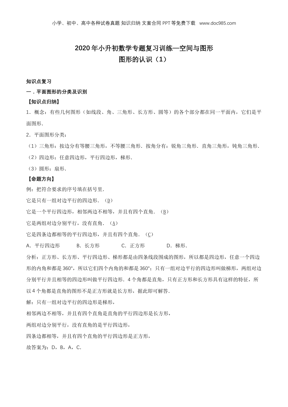 小学、初中、高中各种试卷真题知识归纳文案合同PPT等免费下载www.doc985.com2020年小升初数学专题复习训练—空间与图形图形的认识(1)知识点复习一.平面图形的分类及识别【知识点归纳】1.概念:有些几何图形(如线段、角、三角形、长方形、圆等)的各个部分都在同一平面内,它们是平面图形.2.平面图形分类:(1)三角形:按边分有等腰三角形,不等腰三角形.按角分有:锐角三角形.直角三角形,钝角三角形.(2)四边形:任意四边形,平行四边形,梯形.(3)圆形:扇形.【命题方向】例:把符合要求的序号填在括号里.它是只有一组对边平行的四边形.(D)它是一个平行四边形,相邻两边不相等,并且有四个直角.(B)它是两组对边分别平行,没有直角.(A)它是四条边都相等的平行四边形,并且有四个直角.(C)A.平行四边形B.长方形C.正方形D.梯形.分析:正方形、长方形、平行四边形、梯形都是由四条线段围成的图形,所以都是四边形,任意一个四边形的内角和都是360°,所以它们四个内角的和都是360°;只有一组对边平行的四边形叫做梯形,两组对边分别平行并且相等的四边形叫做平行四边形.4个角都是直角,只有正方形和长方形具有这样的特征,所以4个角都是直角的图形不是正方形就是长方形,据此即可解答.解:只有一组对边平行的四边形是梯形,相邻两边不相等,并且有四个直角是直角的平行四边形是长方形,两组对边分别平行,没有直角的是平行四边形,四条边都相等,并且有四个直角的平行四边形是正方形,故答案为:D,B,A,C.小学、初中、高中各种试卷真题知识归纳文案合同PPT等免费下载www.doc985.com点评:本题主要考查平面图形的分类及识别,熟练掌握正方形、长方形、平行四边形、梯形的特征是解答本题的关键.二.图形的拼组【知识点归纳】1.平面镶嵌的概念:用形状、大小完全相同的一种或几种平面图形进行拼接,彼此之间不留空隙,不重叠地拼接在一起,这就是平面镶嵌.2.规律:用相同的正多边形镶嵌:只用一种多边形时,可以进行镶嵌的是三角形、四边形或正六边形.用不同的正多边形镶嵌:(1)用正三角形和正六边形能够进行平面镶嵌;(2)用正十二边形、正六边形,正方形能够进行平面镶嵌.【命题方向】例:把9个边长是2厘米的小正方形排成一个大的正方形,这个大正方形的周长是()A、24厘米B、36厘米C、38厘米分析:把9个边长是2厘米的小正方形排成一个大的正方形,这个大正方形有边长就是(3×2)厘米,根据正方形有周长公式可列式解答.解:根据题意画图如下,正方形的周长:(3×2)×4,=6×4,=24(厘米).小学、初中、高中各种试卷真题知识归纳文案合同PPT等免费下载www.doc985.com答:周长是24厘米.故选:A.点评:本题考查了学生对拼组图形周长的计算能力.画图可更好的帮助学生理解.三.四边形的特点、分类及识别【知识点归纳】1.四边形的特点:四边形就是四条线段围成的图形,有四条边,四个角,且内角和是360°.2.四边形的分类:任意四边形:图形没有平行的边平行四边形:图形两组平行的边梯形:图形只有一组平行的边3.四边形的识别:根据分类特地进行识别即可.【命题方向】例1:把符合要求的图形序号填在横线里.A、正方形B、长方形C、平形四边形D、梯形①两组对边分别平行,有四个直角.A、B②只有一组对边平行.D③两组对边分别平行,没有直角C.分析:①长方形的特征是:两组对边分别平行且相等,四个角都是直角;②正方形的特征:四条边都相等,四个角都是直角;③平行四边形的特征:两组对边分别平行;④梯形的特征:只有一组对边平行,据此解答.解:由分析可知:①两组对边分别平行,有四个直角的是正方形和长方形;②只有一组对边平行的四边形是梯形;③两组对边分别平行,没有直角的是平行四边形;故答案为:①A、B,②D,③C.点评:此题根据正方形、长方形、平行四边形、梯形的特征进行解答.例2:正方形、长方形是特殊的平行四边形.√.(判断对错)分析:四个角都为直角的平行四边形是长方形,四条边都相等的长方形是正方形;也就是说正方形和长方小学、初中、高中各种试卷真题知识归纳文案合同PPT等免费下载www.d...