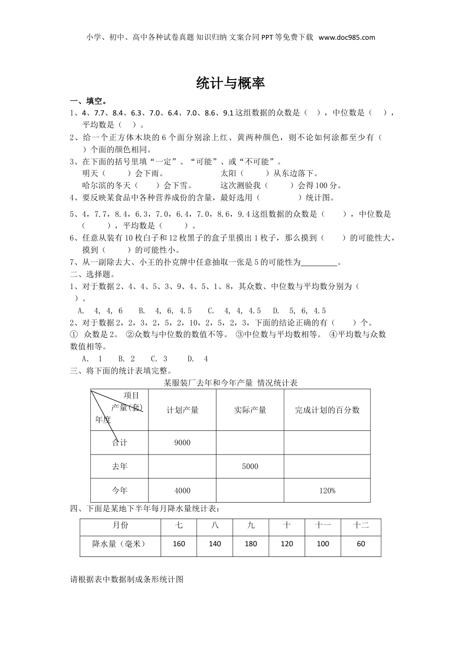 小学、初中、高中各种试卷真题知识归纳文案合同PPT等免费下载www.doc985.com统计与概率一、填空。1、4、7.7、8.4、6.3、7.0、6.4、7.0、8.6、9.1这组数据的众数是(),中位数是(),平均数是()。2、给一个正方体木块的6个面分别涂上红、黄两种颜色,则不论如何涂都至少有()个面的颜色相同。3、在下面的括号里填“一定”、“可能”、或“不可能”。明天()会下雨。太阳()从东边落下。哈尔滨的冬天()会下雪。这次测验我()会得100分。4、要反映某食品中各种营养成份的含量,最好选用()统计图。5、4,7.7,8.4,6.3,7.0,6.4,7.0,8.6,9.4这组数据的众数是(),中位数是(),平均数是()。6、任意从装有10枚白子和12枚黑子的盒子里摸出1枚子,那么摸到()的可能性大,摸到()的可能性小。7、从一副除去大、小王的扑克牌中任意抽取一张是5的可能性为。二、选择题。1、对于数据2、4、4、5、3、9、4、5、1、8,其众数、中位数与平均数分别为()。A.4,4,6B.4,6,4.5C.4,4,4.5D.5,6,4.52、对于数据2,2,3,2,5,2,10,2,5,2,3,下面的结论正确的有()个。①众数是2。②众数与中位数的数值不等。③中位数与平均数相等。④平均数与众数数值相等。A.1B.2C.3D.4三、将下面的统计表填完整。某服装厂去年和今年产量情况统计表项目产量(套)年度计划产量实际产量完成计划的百分数合计9000去年5000今年4000120%四、下面是某地下半年每月降水量统计表:月份七八九十十一十二降水量(毫米)16014018012010060请根据表中数据制成条形统计图小学、初中、高中各种试卷真题知识归纳文案合同PPT等免费下载www.doc985.com某地下半年每月降水量统计图3月制五、应用题1、六(2)班第一组有6名男同学,他们的身高分别是148厘米、139厘米、146厘米、153厘米、156厘米、149厘米。这组男同学的平均身高是多少厘米?2、一段上坡路,往返路程共120千米,小林骑车上坡每小时行10千米,下坡每小时行15千米,求自行车的平均速度。3、甲、乙、丙三数的平均数为184,丁数为64,四个数的平均数是多少?4、5个裁判员给一名体操运动员评分,去掉一个最高分和一个最低分平均得分9.58分。如果只去掉一个最高分,平均得分为9.46分,如果只去掉一个最低分,平均得分9.66分。最高分和最低分各是多少分?5、利用右边的空白转盘设计一个实验,使指针停在蓝色区域的可能性分别是停在绿色、黄七月八月九月十月十一月十二月050100150200单位:毫米单位:月小学、初中、高中各种试卷真题知识归纳文案合同PPT等免费下载www.doc985.com色和红色区域的3倍。6、甲、乙、丙三人中只有1人会开汽车,甲说:“我会开。”乙说:“我不会开。”丙说:“甲不会开。”三人的话只有一句是真话,会开车的是谁?为什么?7、阳光小学红领巾广播站每周播音时间为120分钟,右下图是每个栏目的时间分配图。(1)哪种栏目播音的时间最多?每周多少分钟?(2)《每日英语》每周播音的时间是《精品习作》的百分之几?(3)你还能提出什么数学问题,并解答出来。8、前进小学六年级学生喜欢的运动项目统计如右图,其中喜欢足球的有40人。(1)前进小学六年级喜欢跳绳的有多少人?故事天地35%每日英语15%校园新闻20%精品习作30%小学、初中、高中各种试卷真题知识归纳文案合同PPT等免费下载www.doc985.com(2)喜欢乒乓球的人数比喜欢踢毽的多多少人?(3)通过观察和分析这些数据,你能判断出前进小学六年级学生最喜欢的是哪种运动吗?能判断哪种运动喜欢的人数是最少的吗?请说明理由。参考答案一、1、7.07.07.172、23、可能不可能一定可能4、扇形5、7.07.07.26、黑子白子。7、二、1、C.2、A五、1、148.5厘米2、每小时行12千米3、1544、最高分是9.9分,最低分是9.1分。6、会开车的是乙。7、(1)故事天地42分钟(2)50%8、(1)30人(2)35人