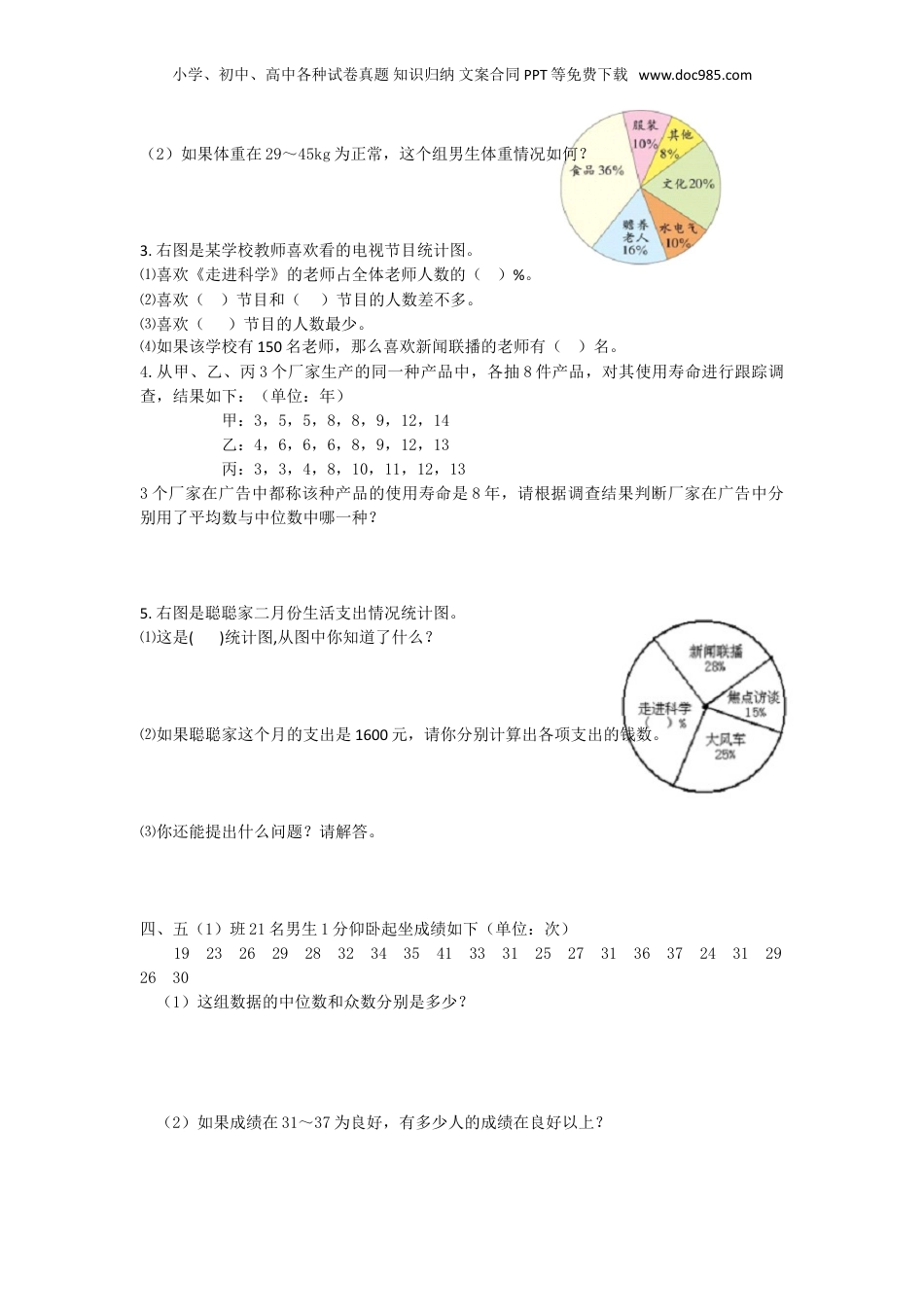小学、初中、高中各种试卷真题知识归纳文案合同PPT等免费下载www.doc985.com统计一、想一想,填一填。1.数据58,57,42,45,50,54的平均数是(),中位数是()。2.已知数据1,2,x,5的平均数为2.5,则这组数据的中位数是()。3.常用的统计图有()统计图,()统计图,()统计图。4.如果只表示各种数量的多少,可以选用()统计图;如果想要表示出数量增减变化的情况,可以选用()统计图;如果要清楚地了解各部分数量同总数之间的关系,可以用()统计图。5.下面是鸡蛋各部分质量统计图。从图中我们可以看出:一个鸡蛋中蛋壳的质量约占(),蛋黄的质量约占()。如果一个鸡蛋重80克,那么这个鸡蛋中的蛋白重()克。6.下面数据分别用哪种统计图表示比较合适?A.人离不开水,成年人每天体内47%的水靠喝水获得,39%来自食物含的水,14%来自体内氧化时释放出来的水。B.某校五年级学生最喜欢的课外活动统计表如下。C.小强从一年级到五年级每年体检的身高记录如下。年级一年级二年级三年级四年级五年级六年级身高/cm125129135140150153A用()统计图B用()统计图C用()统计图7.看图:中国人口约占世界人口的()%。全世界有70亿人口,中国约有()亿人口。8.在10、16、48、20、17、50、40中,中位数是()。9.在52、60、48、60、41、72中,众数是()。二、选择符合要求的答案,把题号填在括号里。1.下面的数据第()个用扇形统计图比较合适。①本班学生的年龄统计②本班学生一年来的身高变化统计③本班学生同时参加各种活动小组的比例统计④本班学生穿鞋型号的统计2.下面第()条信息不是统计图中的直接信息。①语文图书占图书总量的25%看电视打球听音乐看小说其他人数8068745623小学、初中、高中各种试卷真题知识归纳文案合同PPT等免费下载www.doc985.com②数学图书占图书总量的21%③科技书比故事书多总量的6%④科技、语文、数学和故事书的总量是一个整体三、按要求完成下面各题。1.下表是小丽一家三口一天各类食物的摄入量。根据统计图完成表格。2.下面是五年级(3)班11名男同学的体重记录单。(1)分别求出这组数据的平均数(保留一位小数)、中位数和众数。种类摄入量/克占总摄入量的百分比油脂类50奶类和豆类450鱼、禽、肉、蛋等类600蔬菜和水果900谷类1800姓名李明马杰王刚张飞郑伟刘欣姚远孙超赵兴杜平刘军体重/kg3429372631303432524028小学、初中、高中各种试卷真题知识归纳文案合同PPT等免费下载www.doc985.com(2)如果体重在29~45kg为正常,这个组男生体重情况如何?3.右图是某学校教师喜欢看的电视节目统计图。⑴喜欢《走进科学》的老师占全体老师人数的()%。⑵喜欢()节目和()节目的人数差不多。⑶喜欢()节目的人数最少。⑷如果该学校有150名老师,那么喜欢新闻联播的老师有()名。4.从甲、乙、丙3个厂家生产的同一种产品中,各抽8件产品,对其使用寿命进行跟踪调查,结果如下:(单位:年)甲:3,5,5,8,8,9,12,14乙:4,6,6,6,8,9,12,13丙:3,3,4,8,10,11,12,133个厂家在广告中都称该种产品的使用寿命是8年,请根据调查结果判断厂家在广告中分别用了平均数与中位数中哪一种?5.右图是聪聪家二月份生活支出情况统计图。⑴这是()统计图,从图中你知道了什么?⑵如果聪聪家这个月的支出是1600元,请你分别计算出各项支出的钱数。⑶你还能提出什么问题?请解答。四、五(1)班21名男生1分仰卧起坐成绩如下(单位:次)192326292832343541333125273136372431292630(1)这组数据的中位数和众数分别是多少?(2)如果成绩在31~37为良好,有多少人的成绩在良好以上?小学、初中、高中各种试卷真题知识归纳文案合同PPT等免费下载www.doc985.com五、一个射击队要从两名运动员中选拔一名参加比赛。在选拔赛上两个人各打了10发子弹,成绩如下:甲:9.5109.39.59.69.59.49.59.29.5乙:109108.39.89.5109.88.79.9(1)甲、乙成绩的平均数、中位数、众数分别是多少?(2)你认为谁去参加比赛更合适?为什么?六、某公司全体员工工资情况如下表。(1)这组数据的平均数、中位数和众数各是多少?(2)你认为哪个数据代表这个公司员工工资的一般水平比较...