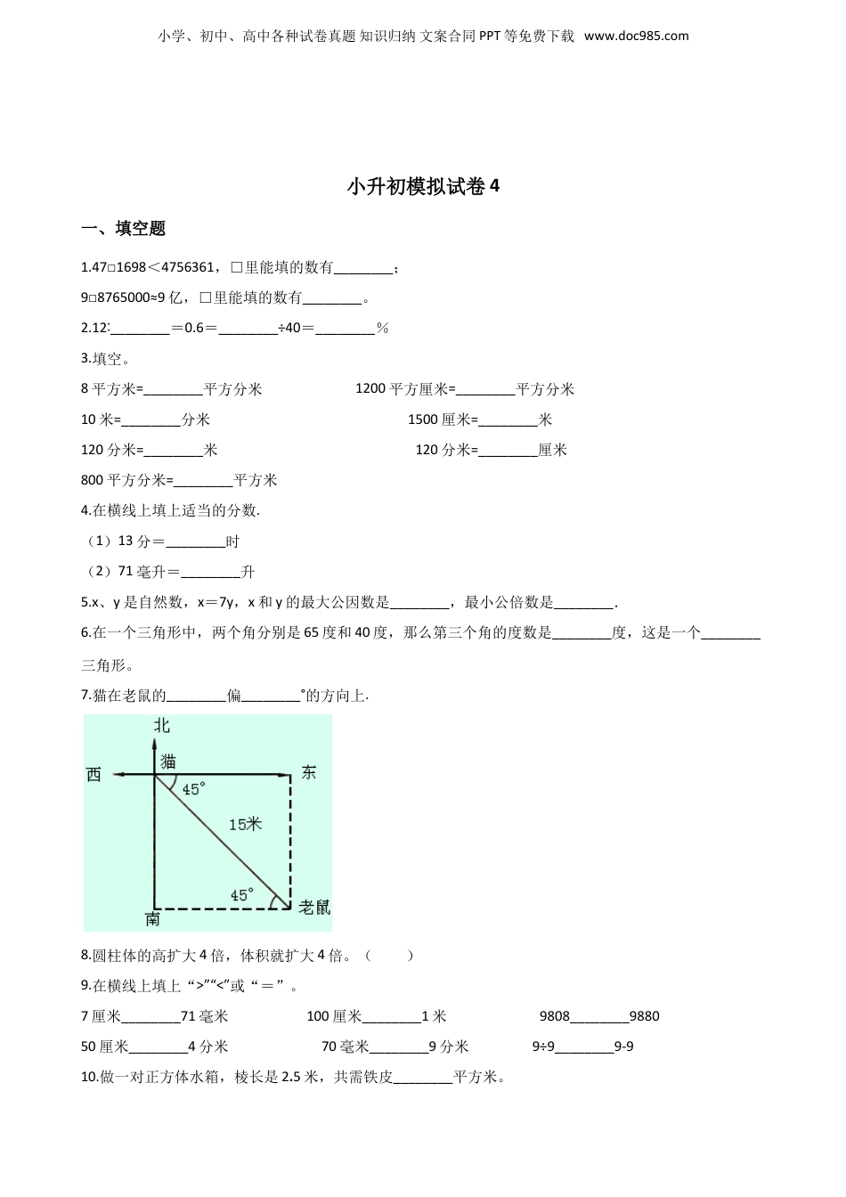 小学、初中、高中各种试卷真题知识归纳文案合同PPT等免费下载www.doc985.com小升初模拟试卷4一、填空题1.47□1698<4756361,□里能填的数有________;9□8765000≈9亿,□里能填的数有________。2.12________∶=0.6=________÷40=________%3.填空。8平方米=________平方分米1200平方厘米=________平方分米10米=________分米1500厘米=________米120分米=________米120分米=________厘米800平方分米=________平方米4.在横线上填上适当的分数.(1)13分=________时(2)71毫升=________升5.x、y是自然数,x=7y,x和y的最大公因数是________,最小公倍数是________.6.在一个三角形中,两个角分别是65度和40度,那么第三个角的度数是________度,这是一个________三角形。7.猫在老鼠的________偏________°的方向上.8.圆柱体的高扩大4倍,体积就扩大4倍。()9.在横线上填上“>”“<”或“=”。7厘米________71毫米100厘米________1米9808________988050厘米________4分米70毫米________9分米9÷9________9-910.做一对正方体水箱,棱长是2.5米,共需铁皮________平方米。小学、初中、高中各种试卷真题知识归纳文案合同PPT等免费下载www.doc985.com11.把360本书平均放到4层书架上,每层书架放的书是这些书的________,每本书占每层书架中书的总数的________。12.一个圆环形,内圆的半径是4厘米,外圆的半径是6厘米,那么这个圆环的面积是________。二、判断题13.一个自然数(0除外)不是质数就是合数。14.一批零件100个合格,10个不合格,不合格率是10%。()15.两个面积相等的三角形可以拼成一个平行四边形。()16.一个直角三角形的两条直角边分别是3m,4m,把这个三角形按1:2缩小,得到的图形面积是原三角形面积的倍。()17.一种商品打七五折销售,表示现价是原价的75%。()18.把25克盐放入100克水中,盐水含盐率是25%.()19.复式条形统计图用不同颜色的直条来表示几组数据是为了使统计图看起来更美观,更漂亮。()20.周长相等的长方形正方形和圆,正方形的面积最大。()三、选择题21.如图的平行四边形中,以36cm为底的高是()cm.A.20B.24C.30D.3622.一辆车的车轮转动的圈数和所行的路程()A.不成比例B.成正比例C.成反比例23.110克的糖水中含糖30克,糖与水的比是()A.3:11B.3:10C.3:9D.3:824.如下图,以大圆的半径为直径画一小圆,大圆的周长是小圆周长的()倍。A.2B.4C.6D.8小学、初中、高中各种试卷真题知识归纳文案合同PPT等免费下载www.doc985.com25.24个铁圆锥,可以熔铸成等底等高的圆柱体的个数是()A.12B.8个C.36个D.72个26.盒子里有18个红球,12个白球,摸到()的可能性大。A.白球B.红球C.一样大27.如x×=y×=z×,(x、y、z均不为0),那么()。A.z>y>xB.y>x>ZC.x>y>zD.z>x>y28.被乒乓球拍盖住的一面写有数字()。A.1B.5C.6四、计算题29.能简便计算的简便计算(1)(2)(3)30.解方程。(1)x-x=(2)42∶=x∶五、操作题31.画出三角形向右平移3格后的图形,画出平行四边行向下平移4格后的图形。小学、初中、高中各种试卷真题知识归纳文案合同PPT等免费下载www.doc985.com六、解决问题32.笑笑家到淘气家的路程是1320米,两人同时从家出发,相对而行。笑笑每分钟走56米,淘气每分钟走64米。(1)估计两人在何处相遇,在图中用“△”标出。(2)两人多长时间相遇?33.一辆卡车以每小时54千米的速度上坡行了小时,以每小时76千米的速度下坡行了小时,卡车上、下坡平均每小时行多少千米?34.某工人九月份加工完成360个零件,比八月份多加工,八月份加工多少个零件?(画图表示数量关系,再解答)35.图“蒙古包”是由一个近似的圆柱形和一个近似的圆锥形组成,这个蒙古包的空间大约是多少立方米?36.小芳看一本450页的故事书,前3天看了150页。照这样计算,她看完剩下的页数需要多少天?(用比例解答)小学、初中、高中各种试卷真题知识归纳文案合同PPT等免费下载www.doc985.com答案解析一、填空题1.【答案】0~5;0~4【解析】:47□1698<4756361,□里能填的数有0~5;9□8765000≈9亿,□里能填的数有0~4。故答案为:0~5;0~4。【分析...
