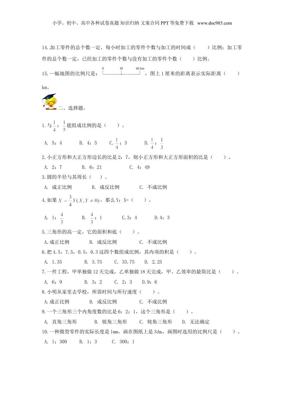 小学、初中、高中各种试卷真题知识归纳文案合同PPT等免费下载www.doc985.com小升初数学高频考点过关演练4比和比例(原卷)一、填空题。1.,当x等于()时,才能组成比例。2.():()=()24===0.753.在6:5=1.2中,6是比的(),5是比的(),1.2是比的()。在4:7=48:84中,4和84是比例的(),7和48是比例的()。4.一个比例的两个内项互为倒数,它的一个外项是0.8,另一个外项是()。5.若xy=13,则x与y成()比例;若=3,则x与y成()比例。6.12的因数有(),选择其中的4个因数,把它们组成一个比例是()。选择其中的因数写出两个比值是6的比()、()。7.男生比女生多,男生与女生人数的比是():()。8.甲数的与乙数的相等,并且甲、乙两数均不为0,甲数:乙数=():()。9.一件工程,甲要20天完成,乙要25天完成,甲与乙所用时间的比是(),甲与乙的工效比是()。10.两个正方体的棱长分别是2cm和3cm,小正方体和大正方体的棱长和的比是(),表面积的比是(),体积的比是()。11.把甲数的给乙,甲、乙两数相等,甲数与乙数的比是(),甲数比乙数多()。12.():=2.5:1.2:=():13.一种盐水是由盐和水按1:30的重量配制而成的。其中,盐的重量占盐水的(),水的重量占盐水的()。小学、初中、高中各种试卷真题知识归纳文案合同PPT等免费下载www.doc985.com14.加工零件的总个数一定,每小时加工的零件个数与加工的时间成()比例;加工零件的总个数一定,已经加工的零件个数与没有加工的零件个数()比例。15.—幅地图的比例尺是:,图上1厘米的距离表示实际距离()km。二、选择题。1.与:能组成比例的是()。A.5:4B.4:5C.:3D.:2.小正方形和大正方形边长的比是2:7,则小正方形和大正方形面积的比是()。A.2:7B.6:21C.4:493.圆的半径与其周长()。A.成正比例B.成反比例C.不成比例4.如果,那么Y:X=()。A.1:B.:1C.3:4D.4:35.三角形的高一定,它的面积和底()。A.成正比例B.成反比例C.不成比例6.把4.5,7.5,0.5,0.3这四个数组成比例,其内项的积是()。A.1.35B.3.75C.33.75D.2.257.一件工程,甲单独做12天完成,乙单独做18天完成,甲、乙效率的最简比是()。A.6:9B.3:2C.2:3D.9:68.小明从家里去学校,所需时间与所行速度()。A.成正比例B.成反比例C.不成比例9.一个三角形三个内角度数的比是6:2:1,这个三角形是()。A.直角三角形B.锐角三角形C.钝角三角形D.无法确定10.一种微型零件的实际长度是1mm,画在图纸上是3dm,画图时选用的比例尺是()。A.1:300B.1:3C.300:1小学、初中、高中各种试卷真题知识归纳文案合同PPT等免费下载www.doc985.com三、判断题。1.由两个比组成的式子叫作比例。()2.实际距离一定大于图上距离。()[来源:学。科。网Z。X。X。K]3.如果8A=9B(A,B≠0),那么B:A=8:9。()4.比例尺一定,图上距离和实际距离成正比例。()5.一家水果店有120千克苹果,已知卖出的与剩下的比是2:1,那么剩下的苹果是60千克。()[来源:学科网ZXXK]四、计算题。1.求比值。(1)0.25:0.75(2):0.7(3):2.化简比。(1):(2)12.6:0.4(3):0.24五、根据下面的条件列出比例,并解比例。[来源:Zxxk.Com]1.45与x的比等于25与8的比。2.96与x的比等于16与5的比。3.两个外项是24和18,两个内项是x和36。小学、初中、高中各种试卷真题知识归纳文案合同PPT等免费下载www.doc985.com六、解决问题。1.用84厘米长的铜丝围成一个三角形,这个三角形三条边长度的比是3:4:5,则这个三角形的三条边各是多少厘米?2.装订一批书,计划每天装订2500本,20天完成,实际每天比计划少装订500本,实际多少天完成?3.甲、乙、丙三个数的平均数是84,甲、乙、丙三个数的比是3:4:5,甲、乙、并三个数各是多少?4.在一幅比例尺是1:3000的地图上,量得甲乙两地相距8厘米,如果在另一幅地图上,量得甲乙两地相距3厘米,则另一幅地图的比例尺是多少?5.纸箱里有红、绿、黄三色球,红色球的个数是绿色球的,绿色球的个数与黄色球个数的比是4:5,已知绿色球与黄色球共81个,问三色球各有多少个?6.一个长方体的棱长总和是136厘...
