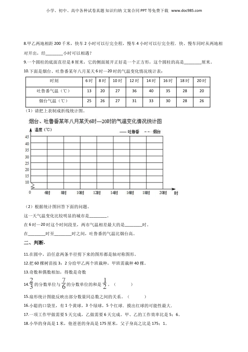 小学、初中、高中各种试卷真题知识归纳文案合同PPT等免费下载www.doc985.com小升初模拟试卷2一、填一填1.在一幅比例尺是1:5000的学校平面图上,量校门口到教学楼的距离是4cm,校门口到教学楼的实际距离________米.2.根据15×★=360直接写出下面算式中的数。5×★=________×________★=7203.甲、乙两数的比是5:6,甲数是10,乙数是________。4.一个圆柱形实心光锭,可以铸成________个与它等底等高的实心圆锥形零件.5.一个圆柱,如果把它的高截短3厘米(如图1),表面积就减少了94.2平方厘米,这个圆柱的半径是________厘米;如果把原圆柱平均分成16份后拼成一个近似的长方体(如图2),表面积就比原来增加了100平方厘米,那么原来圆柱的体积是________立方厘米。6.以直角三角形的长直角边为轴旋转一周(如图)得到几何体是________,体积是________cm3.(单位:cm)7.根据图回答下列问题:(1)这个统计图叫做________统计图,可以看出它有一个明显的特点,能清楚地在图上表示出________和________之间的关系.(2)本月饮食预算为1200元,则总预算是________元,用在购买衣服与文化教育的钱比用在饮食上的钱少________元.(3)若本月的总预算增加200元,那么饮食的经费增加________元.小学、初中、高中各种试卷真题知识归纳文案合同PPT等免费下载www.doc985.com8.甲乙两地相距200千米,快车2小时可以行完全程,慢车4小时可以行完全程.快、慢车同时从两地相对开出,经________小时可以相遇?9.一个圆柱的底面直径是8厘米,它的侧面展开正好是一个正方形,这个圆柱的高是________厘米。10.下面是烟台、吐鲁番某年八月某天6时—20时的气温变化情况统计表:时刻6时8时10时12时14时16时18时20时吐鲁番气温(℃)1320273640352820烟台气温(℃)2526273133302826(1)请把上表制成折线统计图。(2)根据统计图回答下面的问题。这一天气温变化比较明显的城市是________。在6时—20时这个时间段里,两市气温相差最大的是________时。在________时至________时之间,吐鲁番的气温比烟台高。二、判断.11.在圆中,沿任意两条半径剪下来的图形都是轴对称图形。12.把60棵树苗按3:2分给甲乙两个班栽种,甲班需栽种40棵。13.奇数和偶数相加,得数是奇数14.的分数单位与的分数单位的和是。()15.扇形统计图能反映出部分数量同总数之间的关系。()16.小聪的口袋里,有1个黄球,3个绿球,5个红球.摸出红球的可能性最大.17.一项工作甲做需要5天完成,乙做需要6天完成。甲、乙的工作效率比是5:6。18.小华的身高是1米,他爸爸的身高是175厘米,父子身高之比是175:1。小学、初中、高中各种试卷真题知识归纳文案合同PPT等免费下载www.doc985.com三、选择19.两个正方形边长的比是1:3,它们周长的比是()A.1:3B.1:6C.1:820.小红、小华和小明都是集邮爱好者,小红的邮票与其他两人邮票总数的比是5:19,若小华送12张奥运纪念邮票给小红,则他们三人的邮票张数一样多,他们一共集了()张邮票。A.80B.96C.12021.已知△□,△□□□,那么△A.4B.6C.1822.一个立体图形是由7个小正方体摆成的,从正面看到的形状是,从左面看到的是,从上面看到的是,这个立体图形是()。A.B.C.23.下列现象是旋转现象的是()。A.把书从书包里拿出来B.转动汽车方向盘C.擦玻璃D.火车在铁轨上行驶24.如果丫丫家在聪聪家南偏西35°,那么聪聪家在丫丫家()A.北偏西55°B.北偏东55°C.北偏东35°D.北偏西35°25.一件衣服原价100元,先提价10%,后又降价10%,现价与原价相比,结果是()。A.提高了B.降低了C.不变26.三个内角的度数比是1:3:5的三角形是()A.锐角三角形B.直角三角形C.钝角三角形D.不能确定四、算一算27.计算题。小学、初中、高中各种试卷真题知识归纳文案合同PPT等免费下载www.doc985.com(1)+÷(1)(2)(﹣0.05)×(3)3+×(4)(0.9+1)÷[(4)×0.8]28.解方程。(1)6:0.8=x:1.2(2)25%x-1.6×2=0.4五、拓展应用29.按要求画图。(1)将图中的三角形①绕O点顺时针旋转90°,画出旋转后的图形②。(2)将图中的三角形①平移,使平移后的三角形顶点O的位置在(9,5),画出平移...