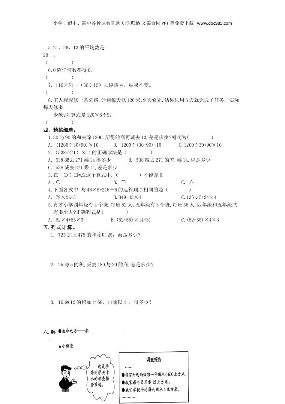 小学、初中、高中各种试卷真题知识归纳文案合同PPT等免费下载www.doc985.com四则混合运算一.知识游乐园里开心填一填。1.加法、减法、乘法、除法统称()。一个数加上()还得原数。2.在计算(2000-36×47)÷44时,先算(),再算(),最后算()法。3.在没有余数的除法里,除数×商-被除数=()被减数,减数,差相加的和是432,被减数是()4.在算式630-180÷9中,如果要改变它的运算顺序,想先算减法,就需要给算式加(),这样算式就要变成:(),结果也由原来的()变成()。5.5人4小时做了80朵纸花,平均每人4小时做()朵纸花,平均每人每小时做()朵纸花。6.在一个没有括号的等式里,如果只有加减法,或者只有乘除法,要按()的顺序计算,如果既有加减法,又有乘除法,要先算(),后算()。7.267除以最大的两位数减去最小的两位数的差,商是()。8如果把(35+50)×(28-16)的两个小括号去掉,要先算(),再算(),最后算()。二.我来算一算。1.口算。25×4=7×7÷7×7=52+25-52+25=180+20=125×8=100-50×2=70×10-400=64÷64×7=310-90=180-80+20=100+100×0=72÷9×48÷8=2.计算。125+25×6(135+75)÷(14×5)735÷5-17205÷5×3(135+415)÷5+161200-20×18三.我是公正的小法官。1.1-(0÷1)+1=2()2.25×25÷25×25=1()3.比90少2的数的2倍是176。()4.“860-135×3”读作“860与135差的3倍”。()小学、初中、高中各种试卷真题知识归纳文案合同PPT等免费下载www.doc985.com5.21、26、13的平均数是20。()6.0除任何数都得0。()7.(16×5)+(36÷12)去掉括号,结果不变。()8.工人叔叔修一条公路,计划每天修120米,9天修完,结果只用6天就完成了任务。实际每天修多少米?列算式是120×6÷9。()四.精挑细选。1.30与90的和去除1200,所得的商再减去10,差是多少?列式为()A.(1200÷30+90)×10B.1200÷(30+90)-10C.1200÷30+90×102.(538-271)×14的正确读法是()A.538减去271乘14得多少B.538减去271的差,乘14,积是多少C.538减去271乘14,差是多少3.在“○÷□=△这个算式中,()不能是0A.○B.□C.△4.下面各式中,与46×8-216÷6的运算顺序相同的是()A.78×2÷3B.349-43×4C.135÷5+24×45.育才小学四年级有4个班,每班52人,五年级有3个班,每班55人,四年级和五年级共有多少人?正确列式是()A.52×4+55×3B.(52+55)×(4+3)C.(52+55)×4×3五.列式计算。1.725加上475的和除以25,商是多少?2.25与5的积,减去480与20的商,差是多少?3.16乘12的积加上68,再除以4,得多少?六.解决问题。1.小学、初中、高中各种试卷真题知识归纳文案合同PPT等免费下载www.doc985.com3.一架飞机6小时飞行10800千米,一辆小汽车5小时行驶360千米。飞机的速度是小汽车速度的多少倍?4.要装配210台电脑,已经装了6天,每天装配15台。剩下的每天装配20台,还要几天才能装完?5.比一比,算一算。2、小学、初中、高中各种试卷真题知识归纳文案合同PPT等免费下载www.doc985.com(1)如果小红和妈妈游黄山,带3000元去旅行社交钱,够吗?(2)小明一家三口人游杭州共需多少元?参考答案一.1.四则运算02.乘法减法除3.02164.括号(630-180)÷9610505.1646.从左往右乘除法加减法7.38.50×2835+14001435-16二.2.2753130123126840三.1.√2.×3.√4.×5.√6.×7.√8.×四.1.B2.B3.B4.C5.A五.1.(725+475)÷25=482.25×5-480÷20=1013.(16×12+68)÷4=65六.1.(1)15×12=180(立方米)(2)6600÷12=550(立方米)2.(1)30+31+30+31+24=146(天)3.(10800÷6)÷(360÷5)=25游杭州每人2600元。游黄山每人1900元。两地旅游,儿童都是半价。小学、初中、高中各种试卷真题知识归纳文案合同PPT等免费下载www.doc985.com4.(210-15×6)÷20=6(天)5.(1)1900÷2+1900=2850(元)2850<3000够(2)2600÷2+2600×2=6500(元)