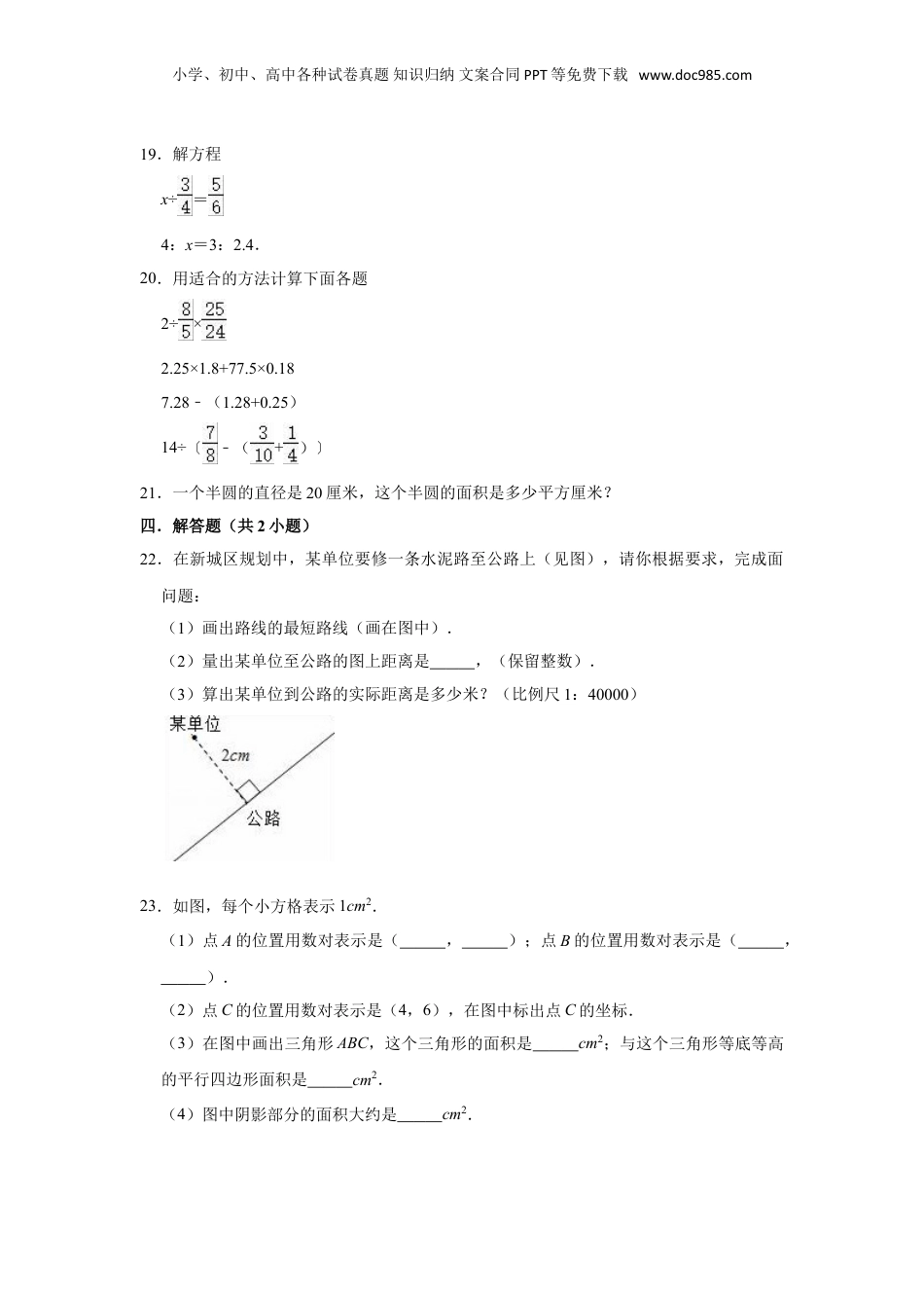 小学、初中、高中各种试卷真题知识归纳文案合同PPT等免费下载www.doc985.com2020年人教版小学六年级下册小升初数学预测卷一.选择题(共6小题,满分12分,每小题2分)1.相邻两个自然数(零除外)的积一定是()A.质数B.合数C.偶数2.焊工做一节圆柱体的通风管,底面半径3分米,长4分米.至少需要铁皮多少平方分米?就是求它的()A.底面积B.表面积C.体积D.侧面积3.一箱饮料有6瓶,买了3箱共用72元,求平均每瓶饮料多少钱,列式正确的是()A.72÷3×6B.72÷3+6C.72÷3÷64.x和y是两种相关联的量,下面四个等式中,x和y不成比例的是()A.x﹣2y=0B.C.0.6x=D.(x+y)×2=105.甲乙两人做游戏,同时掷两枚相同的硬币,双方约定:同面朝上甲胜,异面朝上则乙胜,则这个游戏()A.对双方公平B.对甲有利C.对乙有利D.无法确定6.观察如图这个立体图形,从()面看到的是.A.左B.上C.正二.填空题(共11小题,满分19分)7.与最小的八位数相邻的两个数是和.8.公顷=平方米2.04升=毫升3.25小时=小时分2吨50千克=吨9.0.75====12÷.小学、初中、高中各种试卷真题知识归纳文案合同PPT等免费下载www.doc985.com10.小明小时走了km,他毎小时走千米,走1千米需要小时.11.“双十一”期间,某套儿童图书打六折出售,这就是说这套图书实际售价比原价便宜%.12.(1分)小明到商店买了a支钢笔,每支8.5元,一共要花元,付给售货员50元,应找回元.13.(1分)数一数,图中一共有个三角形.14.第8个点阵有个点,第n个点阵有个点.15.一个长方体底面积是63平方厘米,高是7厘米,体积是.16.数一数,各有几个正方体.17.一个正方体底面积是25m2,它的体积是.三.计算题(共4小题,满分8分)18.直接写得数.①2.5×0.1=②2.7÷0.09=③200×0.03=④6.6÷11=⑤12.5×8=⑥0.56÷0.8=⑦0.3×0.3=⑧3.2﹣1.8=小学、初中、高中各种试卷真题知识归纳文案合同PPT等免费下载www.doc985.com19.解方程x÷=4:x=3:2.4.20.用适合的方法计算下面各题2÷×2.25×1.8+77.5×0.187.28﹣(1.28+0.25)14÷〔﹣(+)〕21.一个半圆的直径是20厘米,这个半圆的面积是多少平方厘米?四.解答题(共2小题)22.在新城区规划中,某单位要修一条水泥路至公路上(见图),请你根据要求,完成面问题:(1)画出路线的最短路线(画在图中).(2)量出某单位至公路的图上距离是,(保留整数).(3)算出某单位到公路的实际距离是多少米?(比例尺1:40000)23.如图,每个小方格表示1cm2.(1)点A的位置用数对表示是(,);点B的位置用数对表示是(,).(2)点C的位置用数对表示是(4,6),在图中标出点C的坐标.(3)在图中画出三角形ABC,这个三角形的面积是cm2;与这个三角形等底等高的平行四边形面积是cm2.(4)图中阴影部分的面积大约是cm2.小学、初中、高中各种试卷真题知识归纳文案合同PPT等免费下载www.doc985.com五.解答题(共6小题)24.看统计图回答问题(只把结果填写在括号里)(1)喜欢跳绳的有人.(2)喜欢踢毽的比喜欢游泳的多人25.男孩一般每千克体重内含血液0.077kg,小明体重34kg,他体内含血液多少千克?(得数保留两位小数)26.农场收割小麦,前3天收割了165公顷.照这样计算,8天可以收割多少公顷?(用比例的知识解答)27.小明读一本故事书,第一天读了24页,占全书的,第二天读了全书的25%,还剩多少页没有读?28.学校食堂买来240千克大米,如果再买72千克就够吃8天了.平均每天吃多少千克?29.把棱长是18厘米的正方体削成一个最大的圆锥体,削下部分的体积是多少立方厘米?小学、初中、高中各种试卷真题知识归纳文案合同PPT等免费下载www.doc985.com参考答案与试题解析一.选择题(共6小题,满分12分,每小题2分)1.解:由分析知:两个相邻的自然数一个是奇数,一个是偶数,因为:奇数+偶数=奇数,奇数×偶数=偶数;所以两个相邻的自然数(0除外)的积一定是偶数.故选:C.2.解:做一节通风管,需要多少铁皮是求侧面积.故选:D.3.解:72÷3÷6=24÷6=4(元)答:平均每瓶饮料4元钱.故选:B.4.解:A、x﹣2y=0,即...