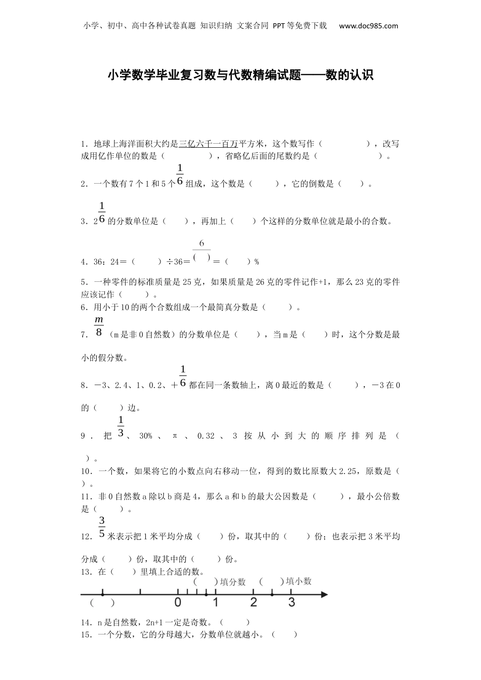 小学、初中、高中各种试卷真题知识归纳文案合同PPT等免费下载www.doc985.com小学数学毕业复习数与代数精编试题——数的认识1.地球上海洋面积大约是三亿六千一百万平方米,这个数写作(),改写成用亿作单位的数是(),省略亿后面的尾数约是()。2.一个数有7个1和5个16组成,这个数是(),它的倒数是()。3.216的分数单位是(),再加上()个这样的分数单位就是最小的合数。4.36:24=()÷36==()%5.一种零件的标准质量是25克,如果质量是26克的零件记作+1,那么23克的零件应该记作()。6.用小于10的两个合数组成一个最简真分数是()。7.m8(m是非0自然数)的分数单位是(),当m是()时,这个分数是最小的假分数。8.-3、2.4、1、0.2、+16都在同一条数轴上,离0最近的数是(),-3在0的()边。9.把13、30%、π、0.32、3按从小到大的顺序排列是()。10.一个数,如果将它的小数点向右移动一位,得到的数比原数大2.25,原数是()。11.非0自然数a除以b商是4,那么a和b的最大公因数是(),最小公倍数是()。12.35米表示把1米平均分成()份,取其中的()份;也表示把3米平均分成()份,取其中的()份。13.在()里填上合适的数。14.n是自然数,2n+1一定是奇数。()15.一个分数,它的分母越大,分数单位就越小。()小学、初中、高中各种试卷真题知识归纳文案合同PPT等免费下载www.doc985.com16.0.5和0.50的大小相等,意义相同。()17.一个非0自然数不是合数就是质数。()18.5千克苹果平均分给6个小朋友,每个小朋友分得这些苹果的56。()19.3.0101010101是一个循环小数。()20.512、721、915都不能化成有限小数。()21.一个数不是正数就是负数。()22.一个数的因数都比它的倍数小。()23.下面各数能改成百分数的是()。A、绳长3米B、白糖重45千克C、女生人数是男生的34D、每分钟行0.75千米24.35的分母增加15,要分数的大小不变,分子应()。A、扩大4倍B、扩大3倍C、增加15D、增加1025.下列说法错误的是()。A、把7.8%的百分号去掉,这个数就扩大100倍B、负数都比正数小C、1既不是质数也不是合数D、假分数的倒数都小于126.下列各数中,去掉所有的0大小不变的数是()。A、600B、12.00C、10.0D、102.027.如果a=b×c,b、c为两个不同的质数,那么a有()个因数。28.下面的说法中,错误的是()。A、真分数一定比假分数小B、O既不是正数,也不是负数C、两位小数表示百分之几D、45的分数单位比34的分数单位大29.把一根绳子剪成两段,第一段长49米,第二段占全长的49,那么两段比较,()。A、第一段长B、第二段长C、两段一样长D、不能确定30.如果a×b=c(a、b、c都是不等于0的自然数),那么()。A、a是b的倍数B、b和c都是a的倍数C、a和b都是c的因数D、c是a、b的最小公倍数31.古希腊认为:如果一个数恰好等于它的所有因数(本身除外)相加之和,那么这个数就是“完全数”。例如:6有四个因数1、2、3、6,除本身6以外,还有1、2、3三个因数。6=1+2+3,恰好是所有因数之和,所以6就是“完全数”。下面的数中是小学、初中、高中各种试卷真题知识归纳文案合同PPT等免费下载www.doc985.com“完全数”的是()。A、12B、28C、36D、4832.某种物质装在下面三个容器中,甲容器大约装有6亿颗,丙容器大约装有10亿颗,估一估,乙容器大约装有()颗。A、70000000B、8000000000C、610000000D、85000000033.两个连续自然数的积一定是()。A、奇数B、偶数C、质数D、合数34.甲数是777777677777777,乙数是99999989999999,那么甲、乙两个数比较()A、甲>乙B、甲<乙C、甲=乙D、不能确定35.组数。用3个0、2个5和2个8组成一个七位数,使这个七位数读出两个零();用这7个数字组成一个最大的七位数是()。36.填数。把12、5、1、8、15、26、9、11、2填在下图中合适的位置上。37.比数。比较49和58的大小,你能想到哪些不同的方法?38.读故事想问题。在数学上也不乏“此时无声胜有声”的小故事。1903年,在纽约的一次数学报告会上,数学家科勒上了讲台,他没说一句话,知识用粉笔在黑板上写了两个算式,一个是67个2相乘减1,另一个是...