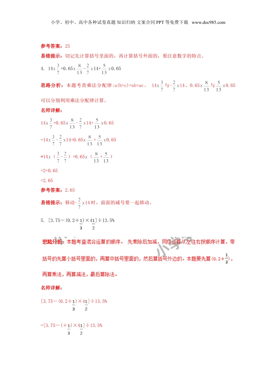 小学、初中、高中各种试卷真题知识归纳文案合同PPT等免费下载www.doc985.com小升初数学高频考点过关演练2数的运算(解析版)一、直接写出得数。53-17=32×0.5=4×=÷0.4=0.9-=0.8×1.5=9.8+0.2=1.5÷0.6=×3=5×0.7=2.1+2=×=3.5-=-=8×=1.5+1=思路分析:本题考查整数的加减计算、小数的加减计算、分数的加减计算、整数与小数、分数的乘除计算及分数与小数的乘除计算。名师详解:直接计算即可。参考答案:3616740.71.2102.144.623362.94易错提示:计算时要仔细认真。二、计算,能简算的要简算。1.897-37.5%+1040.375思路分析:本题考查乘法分配律:a(b+c)=ab+ac。本题中=0.375,37.5%=0.375,897-37.5%+1040.375=(897-1+104)×0.375,进而再计算就解决了。小学、初中、高中各种试卷真题知识归纳文案合同PPT等免费下载www.doc985.com名师详解:897-37.5%+1040.375=8970.375-0.375+1040.375=(897-1+104)×0.375=1000×0.375=375参考答案:375易错提示:要注意题目中数字的特点,重点找出共同的数字0.375.2.3.5×1.25+1.25+3.5÷0.8思路分析:本题考查乘法分配律:a(b+c)=ab+ac。本题中3.5÷0.8=3.5×1.25进而就可以利用乘法分配律了。名师详解:3.5×1.25+1.25+3.5÷0.8=3.5×1.25+1.25+3.5×1.25=(3.5+1+3.5)×1.25=8×1.25=10参考答案:10易错提示:本题要先对“3.5÷0.8”变形,才能运用乘法分配律。3.+-)×12思路分析:本题考查乘法分配律:a(b+c)=ab+ac。本题要先用括号里的每一个数字与12相乘,再进行加减计算。名师详解:+-)×12[来源:学科网]=×12+×12-×12=4+26-5=25小学、初中、高中各种试卷真题知识归纳文案合同PPT等免费下载www.doc985.com参考答案:25易错提示:切记先计算括号里面的,再计算括号外面的,要注意数字的特点。4.14+0.65-14+0.65思路分析:本题考查乘法分配律:a(b+c)=ab+ac。14与-14、0.65与0.65可以分别利用乘法分配律计算。名师详解:14+0.65-14+0.65=14-14+0.65+0.65=14(-)+0.65(+)=2+0.65=2.65参考答案:2.65易错提示:移动-14时,前面的减号要一起移动。5.[3.75-(0.2+)×4]÷13.5%名师详解:[3.75-(0.2+)×4]÷13.5%=[3.75-(+)×4]÷13.5%小学、初中、高中各种试卷真题知识归纳文案合同PPT等免费下载www.doc985.com=[3.75-×4]÷13.5%=[3.75-×]÷13.5%=[3.75-]÷13.5%=[3.75-2.4]÷13.5%=1.35÷13.5%=10参考答案:10易错提示:要熟练掌握“混合运算的顺序”,是解决此题的关键。6.++思路分析:本题考查乘法分配律:a(b+c)=ab+ac。本题需要把++变形,才能运用乘法分配律,即++=×++×名师详解:++=×++×=×(++)=×=×=参考答案:易错提示:要仔细分析本题中数字的特点。7.9.8110%+98.1+0.049981小学、初中、高中各种试卷真题知识归纳文案合同PPT等免费下载www.doc985.com思路分析:本题考查乘法分配律:a(b+c)=ab+ac。要先把9.8110%+98.1+0.049981变形,即9.8110%+98.1+0.049981=9.81×0.1+×10×9.81+0.049×1009.81,再利用乘法分配律。名师详解:9.8110%+98.1+0.049981=9.81×0.1+×10×9.81+0.049×1009.81=9.81×0.1+5×9.81+4.99.81=9.81×(0.1+5+4.9)=9.81×10=98.1参考答案:98.1易错提示:本题要仔细分析本题中数字的特点,先变形,再运用乘法分配律。8.999×222+333×334思路分析:本题考查乘法分配律:a(b+c)=ab+ac。要先把999×222+333×334变形,即999×222+333×334=333×3×222+333×334=333×666+333×334,再利用乘法分配律。名师详解:999×222+333×334=333×3×222+333×334=333×666+333×334=333×(666+334)=333×1000=333000参考答案:333000易错提示:本题要仔细分析本题中数字的特点,先变形,再运用乘法分配律。9.2-2.86×(6.25-6)思路分析:本题考查混合运算的顺序。先乘除后加减,同级运算从左往右按顺序计算,带小学、初中、高中各种试卷真题知识归纳文案合同PPT等免费下载www.doc985.com括号的先算小括号里面的,再算中括号里面的,然后算括号外边的。本题中6.25=6,即6.25-6=0名师详解:2-2.86×(6.25-6)=2-2.86×0=2参考答案:2易...