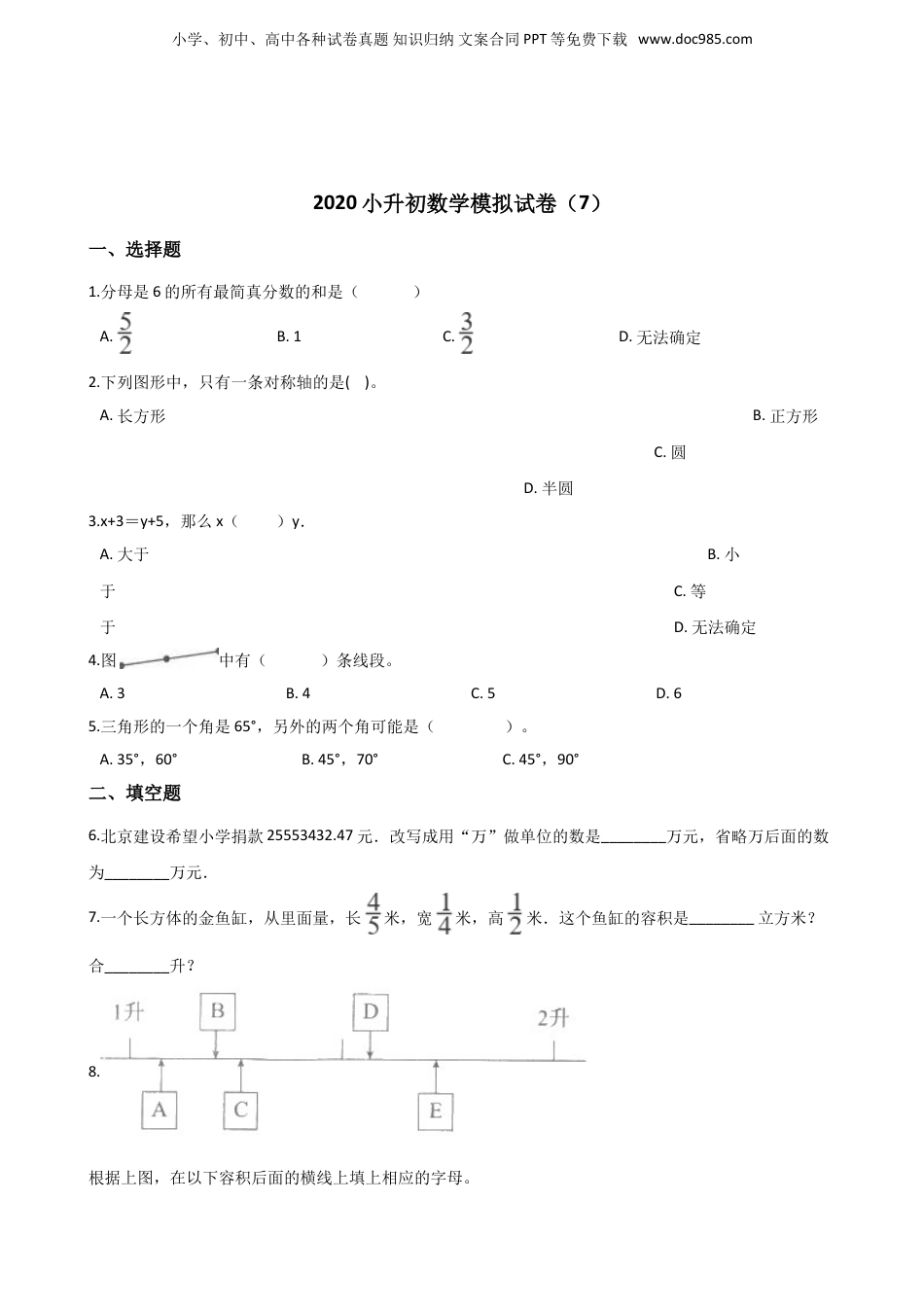 小学、初中、高中各种试卷真题知识归纳文案合同PPT等免费下载www.doc985.com2020小升初数学模拟试卷(7)一、选择题1.分母是6的所有最简真分数的和是()A.B.1C.D.无法确定2.下列图形中,只有一条对称轴的是()。A.长方形B.正方形C.圆D.半圆3.x+3=y+5,那么x()y.A.大于B.小于C.等于D.无法确定4.图中有()条线段。A.3B.4C.5D.65.三角形的一个角是65°,另外的两个角可能是()。A.35°,60°B.45°,70°C.45°,90°二、填空题6.北京建设希望小学捐款25553432.47元.改写成用“万”做单位的数是________万元,省略万后面的数为________万元.7.一个长方体的金鱼缸,从里面量,长米,宽米,高米.这个鱼缸的容积是________立方米?合________升?8.根据上图,在以下容积后面的横线上填上相应的字母。小学、初中、高中各种试卷真题知识归纳文案合同PPT等免费下载www.doc985.com1560毫升________,1.7升________,1200毫升________,1.07升________,1升________。9.甜甜看一本故事书,已看页数与未看页数的比是5:7,她已看了全书的________。10.一个棱长是2cm的正方体,锯成2个长方体,它的表面积增加了________cm2。11.六(1)班有29名男同学,21名女同学,女同学占全班人数的________%,男同学占全班人数的________%。12.把一个长4mm的精密零件绘制在图纸上,图纸上零件的长是6cm,这幅图的比例尺是________。13.六年二班共有学生40人,今天参加活动的出席率为90%,共有________名学生来参加活动。14.一张纸平均分成8份,每份是它的________,6份是________个________,就是________。15.下面的模型是用棱长1厘米的正方体堆成的.求出各模型的表面积________.16.小圆的直径是4厘米,大圆的直径是6厘米,大圆的面积是小圆面积的________倍。17.在一张比例尺是的建筑图纸上,量得一座楼的长是6分米,这座楼的实际长与宽的比是31∶,这座楼实际占地面积是________平方米.三、判断题。18.用数对表示位置(3,6)和(6,3)是同一位置。()19.因为=60%,所以米=60%米.()20.三角形的内角和是180°,四边形的内角和也是180°。()21.把一个圆柱削成一个最大的圆锥,圆柱体积是削去部分的.()22.全班同学同做一道数学题,做对的有40人,做错的有人。这道题的错误率是10%。()小学、初中、高中各种试卷真题知识归纳文案合同PPT等免费下载www.doc985.com四、计算题23.计算题.(1)+÷(2)12.7﹣+17.3﹣(3)99×﹣×4(4)(+)÷+24.解方程(1)4x+0.4x=1.32(2)3x27﹣=14.1(3)(x8﹣)÷2.4=12五、操作题。25.根据下面的播述,在平面图上标出各场所的位置。①小彬家在广场西偏南45°方向1200米处;②小丽家在广场北偏西20°方向600米处;③柳柳家在广场东偏北30°方向900米处;④明明家在广场南偏东40°方向1500米处。小学、初中、高中各种试卷真题知识归纳文案合同PPT等免费下载www.doc985.com26.将图形A绕点O按逆时针方向旋转90度得到图形B,在将图形B向左平移5格得到图形C,最后将图形C按2:1放大得到图形D.六、解决问题27.有两个底面半径分别为6厘米、8厘米且高度相等的圆柱形容器甲和乙,把装满甲容器里的水倒入空的乙容器中,水深比容器乙的高度的低1厘米,求两个容器的高度.28.学校购进一套教学设备,商家按八五折优惠后,比原价便宜了300元,这套设备的原价是多少钱?29.一间房子要用面积是9平方分米的方砖铺地,需要96块。如果改用边长是4分米的方砖,需要多少块?(用比例解答)30.某校六年级数学竞赛活动中,一共有126人获奖。其中获得一、二、三等奖的人数比是1:2:3。获得一、二等奖的各有多少人?31.学校食堂运来60袋大米,比运来的面粉多15袋。运来面粉多少袋?(用方程解)小学、初中、高中各种试卷真题知识归纳文案合同PPT等免费下载www.doc985.com答案解析一、选择题。1.【答案】B【解析】=1。故答案为:B。【分析】分母是6的最简真分数有,,要求它们的和,用加法计算,据此列式解答。2.【答案】D【解析】:长方形的对称轴有两条,正方形的对称轴有4条,圆的对称轴有无数条,半圆的对称轴有一条。故答案为:D。【分析】如果一个图形沿着一条...