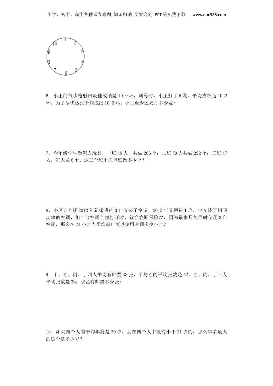 小学、初中、高中各种试卷真题知识归纳文案合同PPT等免费下载www.doc985.com小学数学小升初平均数与和差倍应用题闯关1.从1开始,按1,2,3,4,5,…,的顺序在黑板上写到某数为止,把其中一个数擦掉后,剩下的数的平均数是,擦掉的数是多少?2.在学校组织的数学竞赛中,六(1)班5名男生的总分是405分,7名女生的平均成绩是87分,本次竞赛中全班的平均成绩是多少分?3.王小华上学期语文,数学,英语三科的平均成绩是92分,其中语文,外语两科的平均成绩是89.5分,数学,外语两科平均成绩是95分,他外语成绩是多少?4.老师在黑板上写了十三个自然数,让同学计算它们的平均数(保留两位小数)。小明计算出的答案是40.24。老师说最后一位数字错了,其他数字都对。正确答案是多少?5.10个人坐成一个圆圈做游戏。游戏的规则是:每个人心里都想好一个数,并把自己想好的数如实告诉相邻的两个人,然后每个人将他相邻的两个人告诉他的数的平均数报出来,若报出来的数如图所示,问报5的人心里想的数是多少?小学、初中、高中各种试卷真题知识归纳文案合同PPT等免费下载www.doc985.com6.小王的气步枪射击最佳成绩是10.9环,训练时,小王打了5发,平均成绩是10.2环。为了尽快达到平均成绩10.6环。小王至少还要打多少发?7.六年级学生做泥人玩具,一班48人,共做266个;二班50人共做292个;三班47人,每人做6个。这三个班平均每班做多少个?8.小区5号楼2012年新搬进的3户安装了空调,2013年又搬进1户,也安装了相同功率的空调,但4台空调全部打开时,就会烧断保险丝,因为最多只能同时使用3台空调,那么在24小时内平均每户可以使用空调多少小时?9.甲、乙、丙、丁四人平均有邮票38张,甲与乙的平均张数是42,乙、丙、丁三人平均张数是36,求乙有邮票多少张?10.如果四个人的平均年龄是30岁,且在四个人中没有小于21岁的,那么年龄最大的这个是多少岁?小学、初中、高中各种试卷真题知识归纳文案合同PPT等免费下载www.doc985.com11.甲、乙、丙三人,平均体重63千克,甲与乙的平均体重比丙的体重多3千克,甲比丙重2千克,求乙的体重。12.爷爷和爸爸在1994年的年龄和是127岁,十年前爷爷比爸爸大37岁,爷爷2014年多大?爸爸2016年呢?13.一个修路队,修筑一段公路,前3天修了360米,后5天修筑150米,这个修路队平均每天修筑公路多少米?14.丁丁和妈妈在餐馆吃饭,平均每人餐费是70元。碰上妈妈的同事张阿姨,于是3人一起用餐,还加了两个菜,加菜后平均每人餐费增加了6元,新加的两个菜总价是多少元?15.五年级一班有42人,在一次数学竞赛中,全班的平均成绩是92分,已知女生的平均分是92.5分,男生的平均分是91.45分。女生比男生多几人?16.为了响应“十年树木,百年树人”的号召,深圳市某小学四(1)班42个学生和三位老师去公园里植树,共植树150棵。平均每个学生植树多少棵?(列方程解答)小学、初中、高中各种试卷真题知识归纳文案合同PPT等免费下载www.doc985.com17.四个同样的杯子,杯中装水高度分别为4cm,5cm,7cm,8cm。求这四个杯子中水面的平均高度。18.沃尔玛超市去年第三季度共卖出电视机192台,第四季度卖出电视机216台。这个超市去年下半年平均每月卖出电视机多少台?19.少年歌手大奖赛的裁判小组由若干人组成,每名裁判员给歌手的最高分不超过10分。第一名歌手演唱后的得分情况是:全体裁判员所给分数的平均分是9.64分;如果只去掉一个最高分,则其余裁判员所给分数的平均分是9.60分;如果只去掉一个最低分,则其余裁判员所给分数的平均分是9.68分。求所有裁判员所给分数中的最低分最少可以是多少分?这时大奖赛的裁判员共有多少名?小学、初中、高中各种试卷真题知识归纳文案合同PPT等免费下载www.doc985.com20.两个金鱼缸里共有金黄25条,甲缸里新放入6条,乙缸里取出3条,这时乙缸还比甲缸多2条金鱼。求甲、乙两缸原来各有金鱼多少条?21.一个商人将99粒波子放入两种盒子里,每个大盒子装12粒,小盒子装5粒,恰好可装完。如果大小盒子的总数大于10,问有多少个小盒子?22.两根绳子共长48.4米,从第一根上剪去6.4米,从第二根上剪去7.4米,这时两根绳...