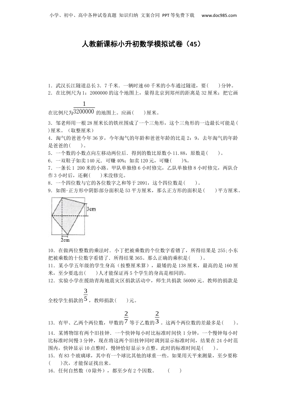 小学、初中、高中各种试卷真题知识归纳文案合同PPT等免费下载www.doc985.com人教新课标小升初数学模拟试卷(45)1.武汉长江隧道总长3.7千米.一辆时速60千米的小车通过隧道,要()分钟。2.在比例尺为1:2000000的这个地图上,量得北京到郑州的距离是32厘米;把它画在比例尺为13200000的地图上。应画()厘米。3.邹老师用一根28厘米长的铁丝围成了一个三角形,这个三角形的一边最长可能是()厘米。(取整厘米)4.淘气的爸爸今年36岁,今年淘气的年龄和爸爸年龄的比是2:9,去年淘气的年龄是爸爸的()。5.一个数的小数点向左移动两位后.得到的数比原数小11.88,原数是()。6.一双鞋子如卖140元.可赚40%;如卖120元,可赚()%。7.一条长1200米的小路。甲队单独修6小时修完,乙队单独修8小时修完,两队合作3小时后,还剩()米没修完。8.一个四位数与它的各位数字之和等于2091,这个四位数是()。9.如图-正方形中阴影部分面积是53平方厘米,那么正方形的面积是()平方厘米。10.在做两位整数的乘法时.小丁把被乘数的个位数字看镨了,所得结果是255;小东把被乘数的十位数字看错了.所得结果365。那么正确的乘积是()。11.某小学五年级的学生身高(按整厘米算),最矮的是138厘米,最高的是160厘米,至少要选出()人才能保证再5个学生的身高是相同的。12.实验小学在援助青海地震灾区捐款活动中,师生共捐款56000元。教师的捐款是全校学生捐款的35,教师捐款()元。13.有甲、乙两个两位数,甲数的27等于乙数的23。这两个两位数的差最多是()。14.某博物馆有两个旧挂钟.一个快钟每小时比标准时间快1分钟,一个慢钟每小时比标准时间慢3分钟,现在将这两个旧挂钟同时调到显示标准时间,结果在24小时范围内,快钟显示10点整时,慢钟恰好显示9点整。此时的标准时间是()。15.有83个玻璃球,其中有一个球比其他的球重一些。如果用天平来测量,至少要称()次,才能保证找出来。16.任何自然数(0除外),都至少有2个因数。()小学、初中、高中各种试卷真题知识归纳文案合同PPT等免费下载www.doc985.com17.小于35的最简真分数只有2个。()18.温度0℃就是没有温度()19.如果ab+2=40,那么a与b成反比例关系。()20.一个圆柱和一个圆锥,它们底面半径的比是2:3,体积比是2:5,它们高的比是3:10。()21.把警戒水位记作0,-0.35米表示()。A.比警戒水位低0.35米B.比警戒水位高0.35米C.不确定22.有黑白颜色的珠子共84个,按照5个黑珠子,2个白珠子的顺序排列,白色的珠子占总数的(),第58个珠子是()色。A.57B.27C.白D.黑23.在比例尺是1:8的图纸上,甲、乙两个圆的直径比是2:3,那么甲、乙两个圆实际的直径比是()。A.l:8B.4:9C.2:3D.无法确定24.小红用彩色纸剪了一个半径是6cm的半圆,求周长列式是()。A.3.14X6×2÷2B.3.14×62÷2C.3.14×6×2÷2+6×225.两个数相除,商50余30,如果被除数和除数同时缩小10倍,所得的商和余数是()。A.商5余3B.商50余3C.商5余30D.商50余3026.5.6×0.375+38×5.4-0.375×0.927.325×0.36+6.75×3628.1016-114÷118×11429.15.8-(625+18÷12.5%)30.x-320x=18.731.x:45=152:8332.192减去12与5.5的积,再除以76,商是多少?33.24的38减去215的差与一个数的40%相等,这个数是多少?34.下图是以县政府为观测点画出的一张平面图。小学、初中、高中各种试卷真题知识归纳文案合同PPT等免费下载www.doc985.com(1)双语学校在县政府()方向()千米处。(2)县一中在县政府()偏()()°的方向,离县政府()千米。(3)红星小学在县政府南偏西15°方向8千米处的位置。请你把它标出来。35.修一段高速公路,单独修甲队要12天可以完成,乙队每天修150米。现在两队合修,完工时甲乙两队工作量的比是5:3。这段高速公路有多长?36.六年级(1)班准备一日夏令营活动,班长小明负责买50瓶纯净水。现在知道中百仓储、华联、联合100三家超市都有销售,且价格都是2.50元。各大超市采取了不同的优惠方法:中百仓储:买10瓶纯净水免费赠送2瓶,不足10瓶不赠送。华联:每瓶纯净水优惠0.50元。联合100:购物满10元,返还现金2元。为了节省开支,你认为小明到哪家超市购买纯净...