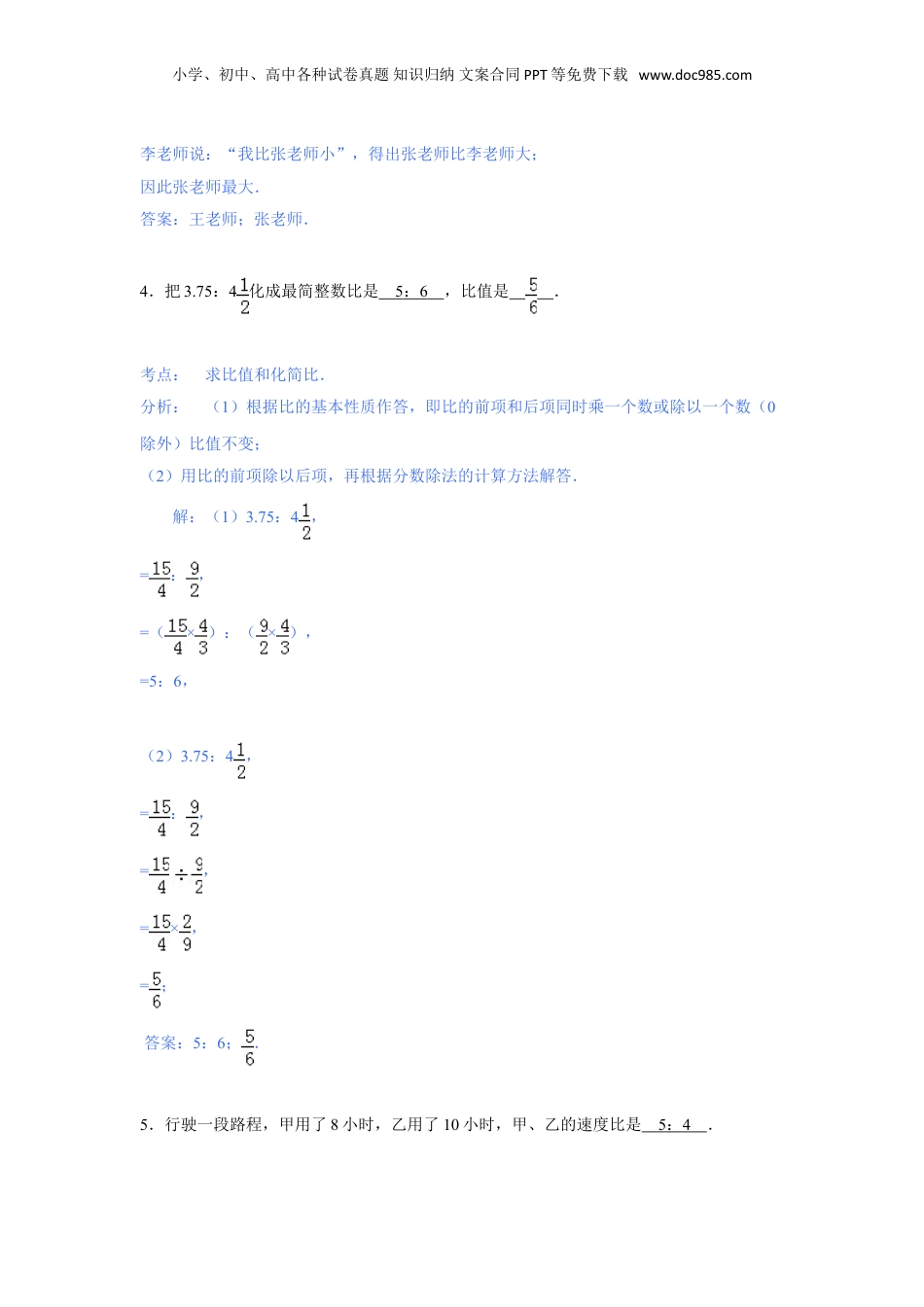 小学、初中、高中各种试卷真题知识归纳文案合同PPT等免费下载www.doc985.com名校小升初模拟试卷十八一、填空题(每题2分,共20分)1.太平洋是世界上最大的海洋,它的面积为一亿七千九百六十万九千平方千米.这个数写作179609000平方千米.将它改写用万作单位的数是17960.9万平方千米.考点:整数的读法和写法;整数的改写和近似数.分析:从高位到低位,一级一级地写,哪一个数位上一个单位也没有,就在那个数位上写0;改写成用“万”作单位的数,从个位向左数四位,点上小数点,末尾的零去掉,然后加上一个“万”字.解:一亿七千九百六十万九千,写作:179609000;179609000=17960.9万;答案:179609000,17960.9万.2.如果用“﹣1200元”表示亏损了1200元,那么盈利4200元,可记作+4200元.考点:负数的意义及其应用.分析:此题主要用正负数来表示具有意义相反的两种量:亏损记为负,则盈利就记为正,直接得出结论即可.解:如果用“﹣1200元”表示亏损了1200元,那么盈利4200元,可记作+4200元;答案:+4200元.3.王老师说:“我比李老师小”,张老师说:“我比王老师大”,李老师说:“我比张老师小”,三个人中王老师最小,张老师最大.考点:逻辑推理.分析:由王老师说:“我比李老师小”,得出李老师比王老师大;张老师说:“我比王老师大”,得出张老师比王老师大;说明最小的是王老师;最后由李老师说:“我比张老师小”,得出张老师最大.解:王老师说:“我比李老师小”,所以李老师比王老师大;张老师说:“我比王老师大”,所以张老师比王老师大;因此最小的是王老师;小学、初中、高中各种试卷真题知识归纳文案合同PPT等免费下载www.doc985.com李老师说:“我比张老师小”,得出张老师比李老师大;因此张老师最大.答案:王老师;张老师.4.把3.75:4化成最简整数比是5:6,比值是.考点:求比值和化简比.分析:(1)根据比的基本性质作答,即比的前项和后项同时乘一个数或除以一个数(0除外)比值不变;(2)用比的前项除以后项,再根据分数除法的计算方法解答.解:(1)3.75:4,=:,=(×):(×),=5:6,(2)3.75:4,=:,=,=×,=;答案:5:6;.5.行驶一段路程,甲用了8小时,乙用了10小时,甲、乙的速度比是5:4.小学、初中、高中各种试卷真题知识归纳文案合同PPT等免费下载www.doc985.com考点:简单的行程问题;比的意义.分析:把这段路程看成单位“1”,甲的速度就是,乙的速度就是,用甲的速度比上乙的速度,化简即可.解::=5:4;答:甲、乙的速度比是5:4.答案:5:4.6.=20:25=0.8=32÷40=80%=八成.考点:比与分数、除法的关系.分析:解答此题的突破口是0.8,把0.8化成分数并化简是,根据分数的基本性质,分子、分母都乘3就是;根据比与分数的关系,=4:5,再根据比的基本性质,比的前、后项都乘5就是20:25;根据分数与除法的关系,=4÷5,再根据商不变的性质,被除数、除数都乘8就是32÷40;把0.8的小数点向右移动两位,添上百分号就是80%;根据成数的意义,80%就是八成.解:=20:25=0.8=32÷40=80%=八成.答案:12,25,40,80,八.7.把7本书方进2个抽屉至少放4本.考点:抽屉原理.分析:把7本书放进2个抽屉,7÷2=3(本)…1(本),即无论怎么放,总有一个抽屉至少放3+1=4本.解:7÷2=3(本)…1(本)3+1=4(本)答:总有一个抽屉至少放4本书.小学、初中、高中各种试卷真题知识归纳文案合同PPT等免费下载www.doc985.com答案:4.8.在一个装有2个红球和3个黄球的纸盒里,任意摸出一个球摸到黄球的可能性是.考点:简单事件发生的可能性求解.分析:根据题意,求摸到黄球的可能性即求一个数是另一个数的几分之几,用除法列式解答即可.解:2+3=5(个)3÷5=答案:.9.把一个棱长为8厘米的正方体,削成一个最大的圆柱,削去的体积是110.08立方厘米.考点:简单的立方体切拼问题.分析:根据题意可知,削成最大的圆柱体的底面直径为8厘米,高为8厘米,那么根据圆柱的体积=底面积×高,进行计算即可.解:3.14×(8÷2)2×8=3.14×16×8=401.92(立方厘米);8×8×8401.92﹣=512401.92﹣=110.08(立方厘米).答...