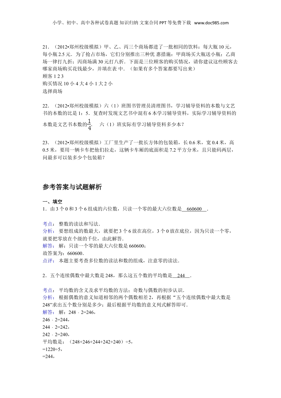 小学、初中、高中各种试卷真题知识归纳文案合同PPT等免费下载www.doc985.com小升初数学模拟试卷及解析(34)|人教新课标一、填空1.由3个0和3个6组成的六位数,只读一个零的最大六位数是.2.五个连续偶数中最大数是248,那么这五个数的平均数是.3.的分子加上4,要使分数的大小不变,分母应加上.4.在含盐15%的20千克盐水中,加千克的盐,就能使盐水的浓度是20%.5.在一张长9厘米、宽6厘米的长方形纸上画一个尽可能大的圆,则圆规两间的距离不能超过厘米.6.学校合唱队人数在40至60人之间,男生与女生的人数比是5:8,合唱队共有人.7.一个圆锥形容器底面积是90平方厘米,高是3分米,它最多可以装升的水.如果把这些水倒入一个与它等底等高的圆柱形容器里,水高分米.8.(1分):0.75化成最简整数比是,2.6:6.5的比值是.9.(1分)一项工程,甲独做8天完成,乙独做12天完成,甲、乙工作效率的最简整数比是.二、判断10.两个不同的自然数相乘,所得的积一定是合数..(判断对错)11.10个十分之一等于1个百分之一..(判断对错)12.一条直线的长等于两条射线长的和..(判断对错)三、选择正确答案序号填在括号内13.0.30的计数单位是0.3的计数单位的()A.B.1倍C.10倍小学、初中、高中各种试卷真题知识归纳文案合同PPT等免费下载www.doc985.com14.甲数的等于乙数的,则甲数()乙数.A.大于B.小于C.可能大于乙数,也可能小于15.将若干个1立方厘米的正方形木块,摆成一个最小的正方体(不包括一块)至少需要()块.A.4块B.8块C.27块四、解答题(共1小题,满分0分)16.能简算的要简算60.65+5﹣×99;356×844﹣×35680÷﹣.五、解答题(共1小题,满分0分)17.(2012•郑州校级模拟)如图半圆中,AB为直径,C为弧AB的中点,求阴影部分面积之和.(单位:厘米)六、应用题18.(2012•郑州校级模拟)龟兔进行1000米的赛跑,小兔心想:我1分钟能跑100米,而你乌龟每分钟只能跑10米,哪是我的对手.比赛开始后,当小兔跑到全程一半时,发现把乌龟甩得老远,便在路旁睡着了.当乌龟跑到距终点还有40米时,小兔醒了拔腿就跑.当胜利者到达终点时,另一个距终点还有几米?19.(2012•郑州校级模拟)文化宫举办画展,展出许多幅画.其中有26幅画不是六年级的,有25幅不是五年级的,现在知道五、六年级共有37幅画,其他年级共有多少幅画?20.(2012•郑州校级模拟)土豆每千克售价2.4元,一菜农为了让市民多买货,把原价打了折扣.已知买25千克就少花6元,问这个菜农按原价的百分之几出售?小学、初中、高中各种试卷真题知识归纳文案合同PPT等免费下载www.doc985.com21.(2012•郑州校级模拟)甲、乙、丙三个商场都进了一批相同的饮料:每大瓶10元,每小瓶2.5元.为了抢占市场,它们分别推出三种优惠措施:甲商场买大瓶送小瓶;乙商场一律打九折;丙商场满30元打八折.下面是三位顾客的购买情况,请你建议这些顾客去哪家商场购买花钱最少,并填在表中.(如果有多个答案都要写出来)顾客123购买情况10小4大4小1大2小选择商场22.(2012•郑州校级模拟)六(1)班图书管理员清理图书,学习辅导资料的本数与文艺书的本数的比是1:5.复查时发现文艺书中混有6本学习辅导资料,实际学习辅导资料的本数是文艺书本数的.六(1)班实际有学习辅导资料多少本?23.(2012•郑州校级模拟)工厂里生产了一批长方体的包装箱,长0.6米,宽0.4米,高0.5米,要用一辆卡车把他们拉走,这辆卡车厢的底面积是7.2平方分米,且只能码两层,问最多可以装多少个包装箱?参考答案与试题解析一、填空1.由3个0和3个6组成的六位数,只读一个零的最大六位数是660600.考点:整数的读法和写法.分析:要想组成的数最大,就要把3个6放在高位,3个0放在底位,因为只读一个零,就要把零放在个级的千位,由此解答.解答:解:只读一个零的最大六位数是660600;故答案为:660600.点评:本题主要考查多位数的读法和数的组成,注意零的读法.2.五个连续偶数中最大数是248,那么这五个数的平均数是244.考点:平均数的含义及求平均数的方法;奇数与偶数的初步认识.分析:根据偶数的意义知道相...