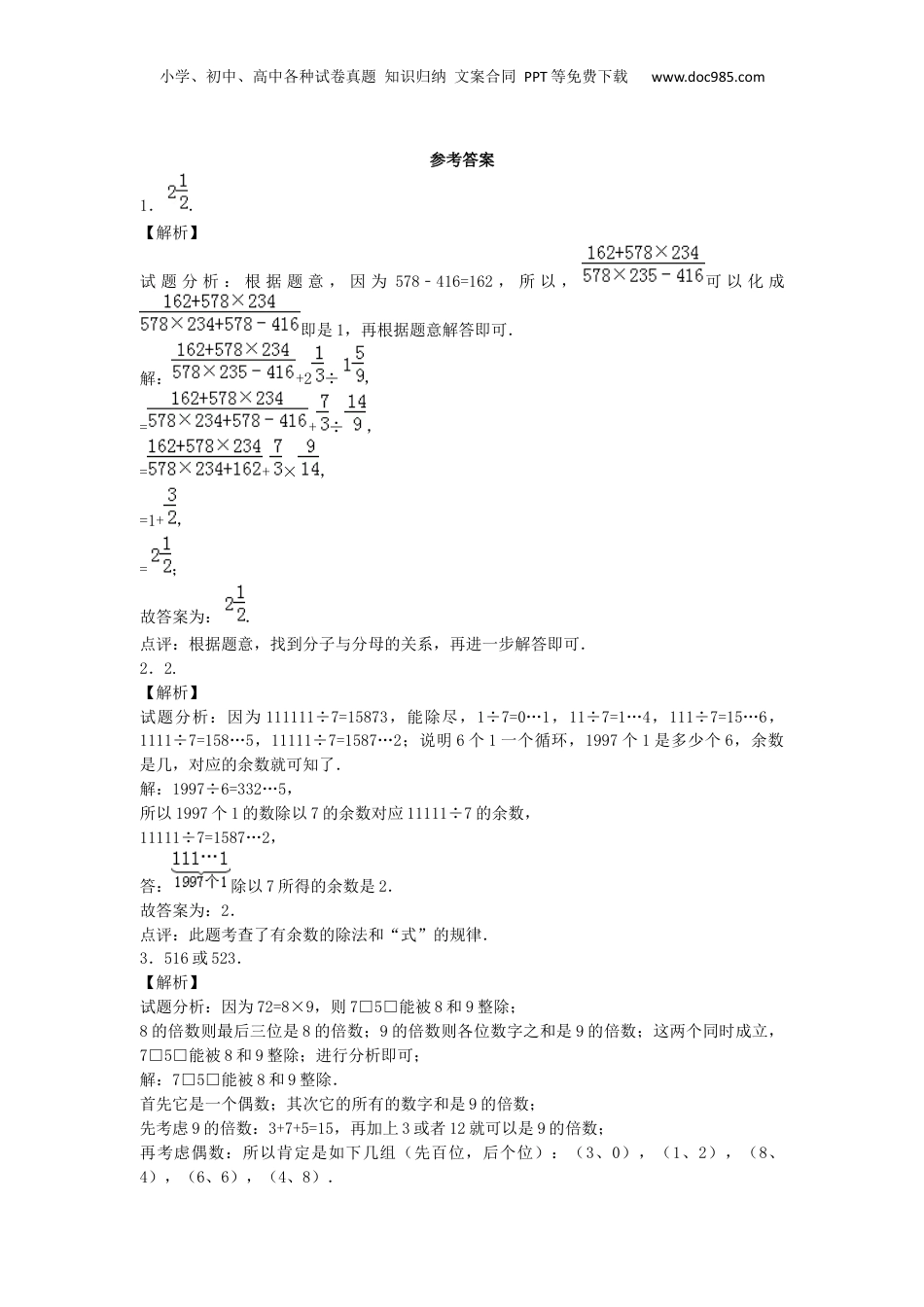 小学、初中、高中各种试卷真题知识归纳文案合同PPT等免费下载www.doc985.com1.(3分)+2÷=.2.(3分)除以7所得的余数是.3.(3分)(2010•成都)37□5□能被72整除,这个数除以72的商是.4.(3分)一列火车以每小时60千米的速度通过一座200米长的桥,用了21秒,则火车的车长是米.5.(3分)如图,三角形ABC的面积是120平方厘米,且AE=BE,D是BC的中点,EF=FD.则阴影部分的面积是平方厘米.6.(3分)×+×2的末尾有个零.7.(3分)有两支蜡烛,第一支5小时燃尽,第二支4小时燃尽.如果同时点燃这两支蜡烛,并且蜡烛燃烧的速度不变,在点燃小时后,第一支蜡烛的长度是第二支蜡烛的3倍.8.(3分),,,…,这499个数中所有不是整数的分数的和是.9.(3分)恰有8个约数的两位数有个.10.(3分)某小学组织六年级学生春游,学校买了182瓶汽水分给每个学生.如果每5个空瓶又可换得1瓶汽水,那么这些汽水瓶最多可换得瓶汽水.11.如果1个小正方体木块的表面积是24平方厘米,那么由512个这样的小正方体木块所组成的一个大正方体的体积是多少立方厘米?12.一年级有108人订了刊物,其中有的人订了《儿童故事画报》,有的人订了《好儿童》,问两种刊物都订的有多少人?13.有6对夫妻参加一次聚会,每个男士与每一个人握手(但不包括自己的妻子),女士之间相互不握手,那么这12个人共握手多少次?14.甲、乙、丙三人同时从A地出发,到离A地18千米的B地,当甲到达B地时,乙、丙两人离B地分别还有3千米和4千米,那么当乙到达B地时,丙离B地还有多少千米?小学、初中、高中各种试卷真题知识归纳文案合同PPT等免费下载www.doc985.com参考答案1..【解析】试题分析:根据题意,因为578﹣416=162,所以,可以化成即是1,再根据题意解答即可.解:+2÷,=+÷,=+×,=1+,=;故答案为:.点评:根据题意,找到分子与分母的关系,再进一步解答即可.2.2.【解析】试题分析:因为111111÷7=15873,能除尽,1÷7=0…1,11÷7=1…4,111÷7=15…6,1111÷7=158…5,11111÷7=1587…2;说明6个1一个循环,1997个1是多少个6,余数是几,对应的余数就可知了.解:1997÷6=332…5,所以1997个1的数除以7的余数对应11111÷7的余数,11111÷7=1587…2,答:除以7所得的余数是2.故答案为:2.点评:此题考查了有余数的除法和“式”的规律.3.516或523.【解析】试题分析:因为72=8×9,则7□5□能被8和9整除;8的倍数则最后三位是8的倍数;9的倍数则各位数字之和是9的倍数;这两个同时成立,7□5□能被8和9整除;进行分析即可;解:7□5□能被8和9整除.首先它是一个偶数;其次它的所有的数字和是9的倍数;先考虑9的倍数:3+7+5=15,再加上3或者12就可以是9的倍数;再考虑偶数:所以肯定是如下几组(先百位,后个位):(3、0),(1、2),(8、4),(6、6),(4、8).小学、初中、高中各种试卷真题知识归纳文案合同PPT等免费下载www.doc985.com能被8整除的数的后三位是8的倍数,经过试除可知:37152÷72=516;37656÷72=523;故答案为:516或523.点评:解答此题的关键是能被72整除,即能被8、9整除,然后根据能被8和9整除的数的特征进行分析、解答即可.4.150米.【解析】试题分析:火车通过一座桥是指火车头在桥一端算起到火车尾在桥的另一端为止,因此火车通过一座桥所行的路程实际是桥长加上火车的车长,并且计算时注意换算单位要一致.解:1千米=1000米,1小时=3600秒,60×1000÷3600×21﹣200,=350﹣200,=150(米),答:火车的车长是150米.点评:此题是典型的列车过桥问题,解答时一定要注意火车通过一座桥是指火车头在桥一端算起到火车尾在桥的另一端为止,另外本题还要注意单位的换算.5.10【解析】试题分析:根据等底等高的三角形面积相等,由于D是BC的中点,△ABD的面积等于△ADC的面积,可求出三角形ABD的面积,进而可求出三角形AED的面积,因它们的高相等,再根据高相等,可求出阴暗部分的面积.据此解答.解:等底等高的三角形面积相等,由于D是BC的中点,△ABD的面积等于△ADC的面积,有S△ABD=S△ADC=120÷2=60(平方厘米)且AE=BE,三角形ABD和三角形AED的高相等...