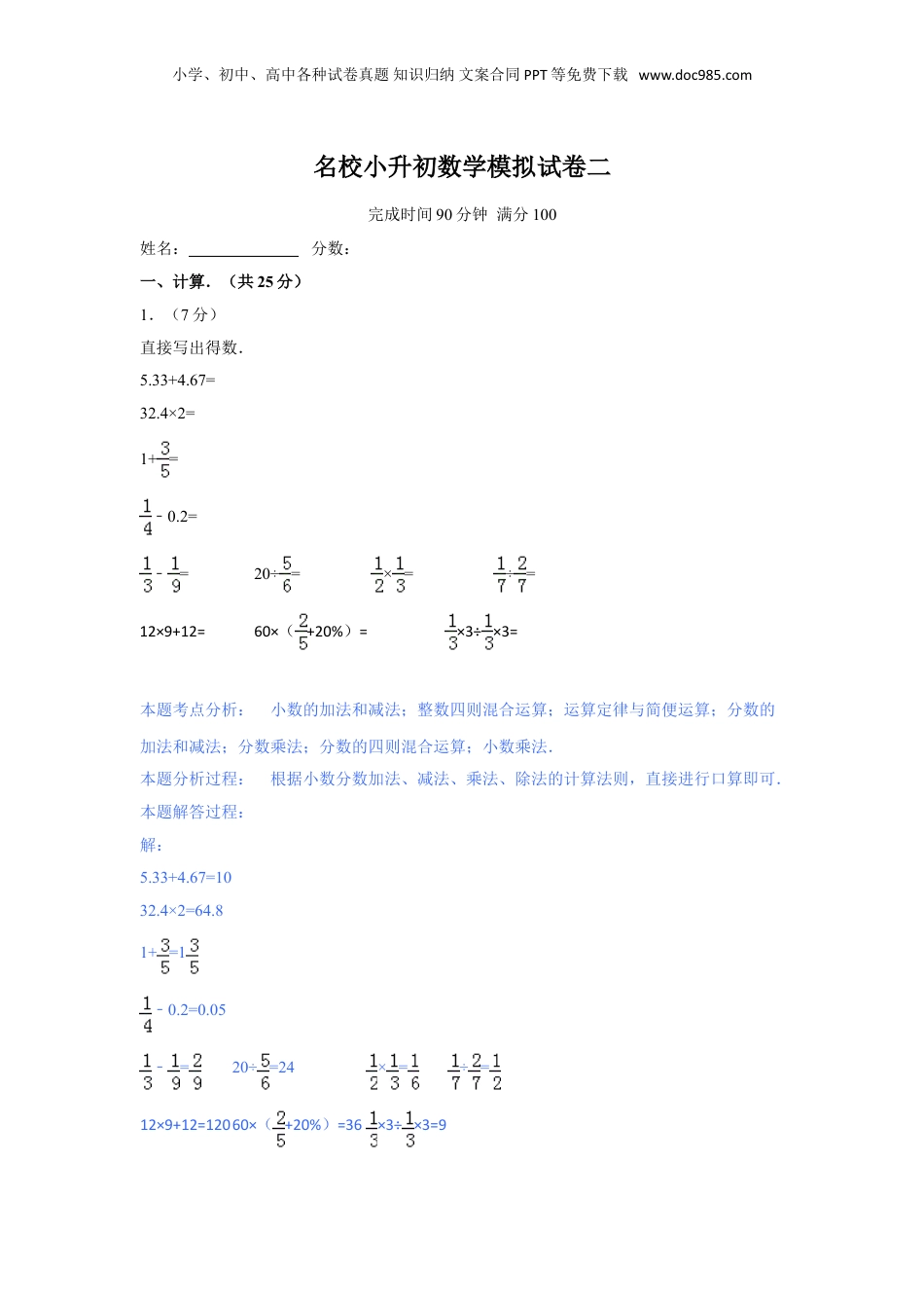小学、初中、高中各种试卷真题知识归纳文案合同PPT等免费下载www.doc985.com名校小升初数学模拟试卷二完成时间90分钟满分100姓名:分数:一、计算.(共25分)1.(7分)直接写出得数.5.33+4.67=32.4×2=1+=﹣0.2=﹣=20÷=×=÷=12×9+12=60×(+20%)=×3÷×3=本题考点分析:小数的加法和减法;整数四则混合运算;运算定律与简便运算;分数的加法和减法;分数乘法;分数的四则混合运算;小数乘法.本题分析过程:根据小数分数加法、减法、乘法、除法的计算法则,直接进行口算即可.本题解答过程:解:5.33+4.67=1032.4×2=64.81+=1﹣0.2=0.05﹣=20÷=24×=÷=12×9+12=12060×(+20%)=36×3÷×3=9小学、初中、高中各种试卷真题知识归纳文案合同PPT等免费下载www.doc985.com2.(12分)用自己喜欢的方法计算.①24×(1﹣)÷15②720÷30﹣2.5×1.4③(+2.4×)×77④18÷[(+)÷].本题考点分析:整数、分数、小数、百分数四则混合运算.本题分析过程:①先算括号里面的减法,再从左到右依次计算;②先算除法和乘法,再算减法;③先算括号里面的乘法,再算加法,最后算括号外面的乘法;④先算小的括号的加法,再算中括号里的除法,最后算括号外面的除法.本题解答过程:解:①24×(1﹣)÷15=24××=1;②720÷30﹣2.5×1.4=24﹣3.5=20.5③(+2.4×)×77=(0.6+0.8)×77=1.4×77=107.8④18÷[(+)÷]小学、初中、高中各种试卷真题知识归纳文案合同PPT等免费下载www.doc985.com=18÷[÷]=18×=203.(6分)解方程.①2x+3.2=37.2②x﹣x=③2.5×3.3+y=10.5.本题考点分析:方程的解和解方程.本题分析过程:①根据等式的性质,方程两边同时减3.2,再除以2求解即可;②先化简,再运用等式的性质,在方程两边同时除以;③先化简,再根据等式的性质,方程两边同时减8.25求解即可.本题解答过程:解:①2x+3.2=37.22x+3.2﹣3.2=37.2﹣3.22x=342x÷2=34÷2x=17;②x﹣x=[来源:Zxxk.Com]x=x÷=÷x=;小学、初中、高中各种试卷真题知识归纳文案合同PPT等免费下载www.doc985.com③2.5×3.3+y=10.58.25+y=10.58.25+y﹣8.25=10.8﹣8.25y=2.25.二、填空.(共16分,每空1分)4.(3分)木星和太阳的平均距离是778300000千米,把横线上的娄改写成以“万”为单位的数是77830万万千米;省略“亿位”后面的尾数约是8亿千米.本题考点分析:整数的改写和近似数.本题分析过程:改写成用“万”作单位的数,就是在万位数的右下角点上小数点,然后把小数末尾的0去掉,再在数的后面写上“万”字;省略“亿”后面的尾数就是四舍五入到亿位,就是把亿位后的千万位上的数进行四舍五入,再在数的后面写上“亿”字.本题解答过程:解:778300000=77830万;778300000≈8亿.答案:77830万;8.5.(3分)在8.2、18、﹣36、2、﹣、215这些数中,8.2、18、2、215是正数,,﹣36、﹣是负数,18、2、215是自然数.本题考点分析:负数的意义及其应用;自然数的认识.本题分析过程:根据正、负数的意义和自然数的意义可以判断出这些数中哪些是正数,哪些是负数,哪些是自然数.本题解答过程:解:在8.2、18、﹣36、2、﹣、215这些数中,8.2、18、2、215是正数,﹣36、﹣是负数,18、2、215是自然数.答案:8.2、18、2、215,﹣36、﹣,18、2、215.小学、初中、高中各种试卷真题知识归纳文案合同PPT等免费下载www.doc985.com6.(2分)(2013•陕西)把1.5:化成最简单的整数比是5:2,比值是2.5.本题考点分析:求比值和化简比.本题分析过程:(1)根据比的基本性质,即比的前项和后项同时乘或除以一个相同的数(0除外)比值不变,进而把比化成最简比;(2)用比的前项除以后项,所得的商即为比值.本题解答过程:解:1.5:=(1.5×10):(×10)=15:6[来源:Z。xx。k.Com]=(15÷3):(6÷3)=5:21.5:=1.5÷=2.5答案:5:2,2.5.7.(1分)李大爷在一块平行四边形田地里种青菜,菜地的底边是5.5米,高是4米,这块地的面积是22平方米.本题考点分析:平行四边形的面积.本题分析过程:根据平行四边形的面积公式:s=ah,把数据代入公式解答.本题解答过程:解:5.5×4=22(平方米),答:这块地的面...