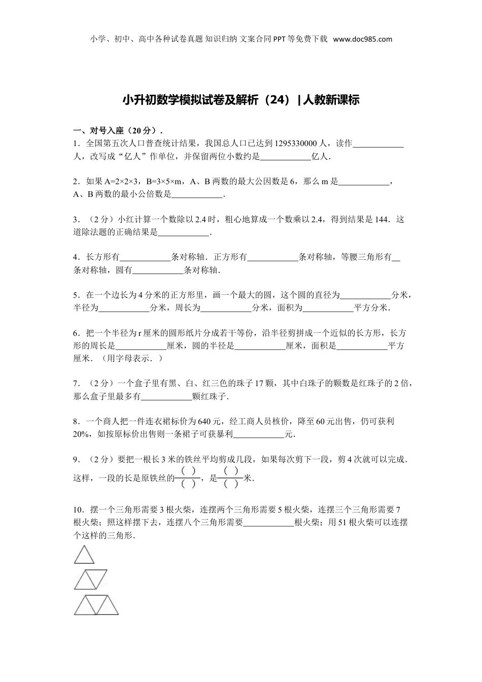 小学、初中、高中各种试卷真题知识归纳文案合同PPT等免费下载www.doc985.com小升初数学模拟试卷及解析(24)|人教新课标一、对号入座(20分).1.全国第五次人口普查统计结果,我国总人口已达到1295330000人,读作人,改写成“亿人”作单位,并保留两位小数约是亿人.2.如果A=2×2×3,B=3×5×m,A、B两数的最大公因数是6,那么m是,A、B两数的最小公倍数是.3.(2分)小红计算一个数除以2.4时,粗心地算成一个数乘以2.4,得到结果是144.这道除法题的正确结果是.4.长方形有条对称轴.正方形有条对称轴,等腰三角形有条对称轴,圆有条对称轴.5.在一个边长为4分米的正方形里,画一个最大的圆,这个圆的直径为分米,半径为分米,周长为分米,面积为平方分米.6.把一个半径为r厘米的圆形纸片分成若干等份,沿半径剪拼成一个近似的长方形,长方形的周长是厘米,圆的半径是厘米,面积是平方厘米.(用字母表示.)7.(2分)一个盒子里有黑、白、红三色的珠子17颗,其中白珠子的颗数是红珠子的2倍,那么盒子里最多有颗红珠子.8.一个商人把一件连衣裙标价为640元,经工商人员核价,降至60元出售,仍可获利20%,如按原标价出售则一条裙子可获暴利元.9.(2分)要把一根长3米的铁丝平均剪成几段,如果每次剪下一段,剪4次就可以完成.这样,一段的长是原铁丝的,是米.10.摆一个三角形需要3根火柴,连摆两个三角形需要5根火柴,连摆三个三角形需要7根火柴;照这样摆下去,连摆八个三角形需要根火柴;用51根火柴可以连摆个这样的三角形.小学、初中、高中各种试卷真题知识归纳文案合同PPT等免费下载www.doc985.com二、智慧眼(5分)11.(1分)如果a÷b=5(a、b为不是零的自然数),那么b和5都是a的约数..(判断对错)12.(1分)北京承办奥运会的那年有366天..(判断对错)13.(1分)身高1.4米的小明,水性不好,他在平均水深1.2米的水中游泳一定不会有什么危险..(判断对错)14.(1分)已知A和B是两个不等于0的自然数,并且A>B,则>..(判断对错)15.(1分)小明从某一个角度观察一个立体模型,看到的模型轮廓是一个圆;这个立体模型可能是圆柱..三、精挑细选(5分)16.(1分)规定ab=a×△(b+2),则52=5×△(2+2)=20.同理可得,38△等于()A.24B.30C.12D.5017.(1分)已知四个温度计的测量范围,第()个最适合用来测量体温.A.10度至110度B.10度至50度C.0度至300度D.35度至42度18.(1分)如图所示已画出一个长方体的长、宽、高(单位:厘米),这个长方体左面的面积是()平方厘米.A.12B.15C.20D.不能确定19.世界上第一个把圆周率的值计算精确到六位小数的人是()A.华罗庚B.张衡C.祖冲之D.陶行知20.(1分)把一个圆剪拼成一个近似长方形,如果这个长方形的长是a厘米,那么宽为()厘米.A.B.C.四、小小会计师小学、初中、高中各种试卷真题知识归纳文案合同PPT等免费下载www.doc985.com21.(4分)小电脑(直接写出得数)10÷100÷0.1=×4÷×4=2×42=0.76+0.4=50.75+0.25=﹣×=410÷1%=÷1.6=0.522.(6分)解密码4x÷3.6=11.8;:0.4=:x.23.(9分)用递等式计算(能简算的要简算)(+)×8+;×+÷;9[﹣+(﹣)].24.(6分)列式计算(1)10个的和去除的倒数,商是多少?(2)一个数的比这个数的25%多30.这个数是多少?25.(5分)火眼金睛(将下面一段话中有错误的计量单位在原处改正.)清晨6:30,小胖从2分米的床上起来,用了6小时很快刷了牙,洗了脸,然后吃了0.3毫升的牛奶和两只面包,背起2.5克重的书包,飞快地向200千米以外的学校跑去.六、动手操作26.(6分)双语小学规划建造一个圆形喷水池,水池周长为31.4米.(1)这个水池约占地平方米.(2)请在上面的框中画出水池占地面积的平面图.(比例尺是1:500)(3)已知水池的深度是0.5米,如果在它的内侧面(不含底面)粉刷水泥,那么粉刷的面积是平方米.27.(4分)在下面的方格里,把图形补充完整,使它构成一幅具有对称美的图案.小学、初中、高中各种试卷真题知识归纳文案合同PPT等免费下载www.doc985.com七、走进生活(30分)28.如图是甲、乙、...