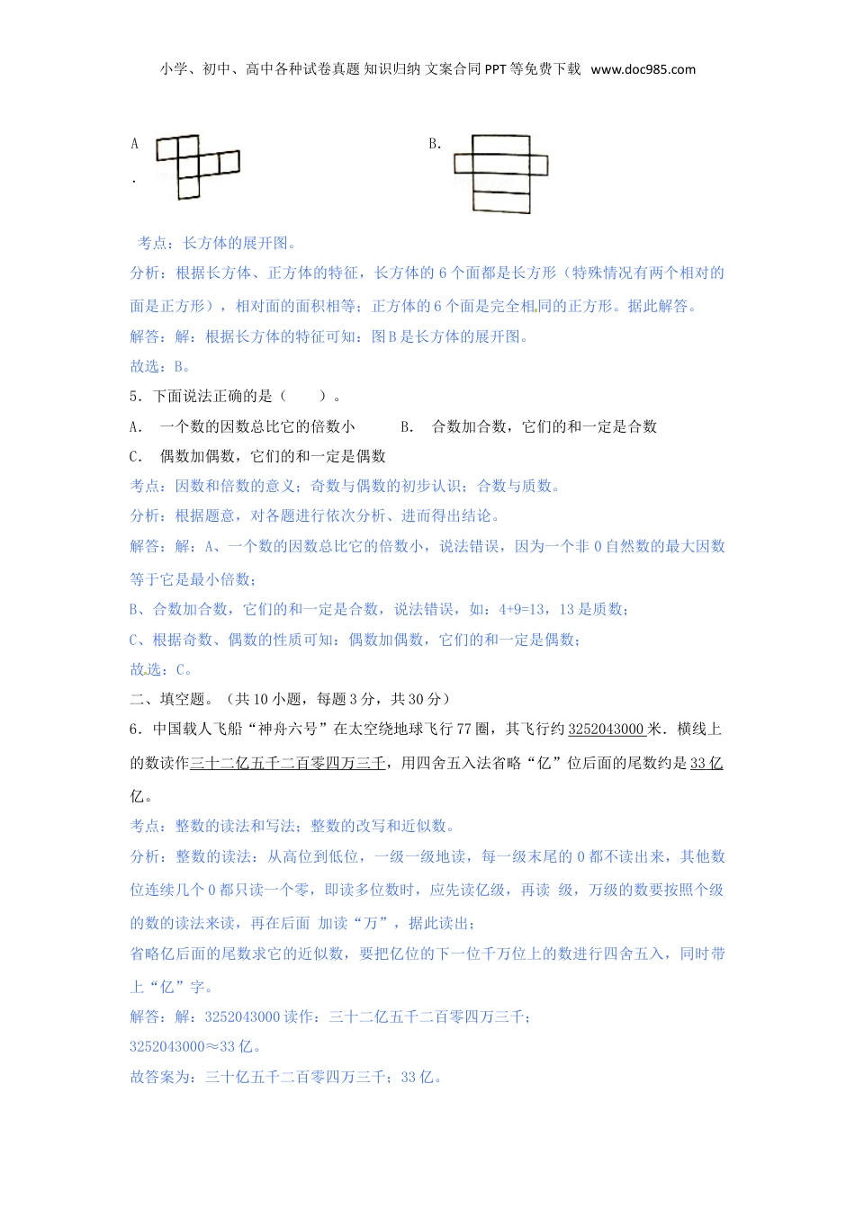 小学、初中、高中各种试卷真题知识归纳文案合同PPT等免费下载www.doc985.com名校小升初模拟试卷八一、选择题。(共5小题,每题2分,共10分)1.西安地区某天的气温是﹣2℃~2℃,这天西安地区的最大温差是()。A.0℃B.2℃C.4℃考点:正、负数的运算。分析:这天的温差就是最高气温与最低气温的差,列式计算即可。解答:解:2﹣(﹣2)=4℃。故选:C。2.周长相等的圆,正方形、长方形,()的面积最大。A.圆B.正方形C.长方形考点:面积及面积的大小比较。分析:要比较周长相等的正方形、长方形和圆形,谁的面积最大,谁面积最小,可以先假设这三种图形的周长是多少,再利用这三种图形的面积公式,分别计算出它们的面积,最后比较这三种图形面积的大小。解答:解:为了便于理解,假设正方形、长方形和圆形的周长都是16,则圆的半径为:=,π××=≈20.38;正方形的边长为:16÷4=4,面积为:4×4=16;长方形长宽越接近面积越大,就取长为5宽为3,面积为:5×3=15,当长方形的长和宽最接近时面积也小于16;所以周长相等的正方形、长方形和圆形,圆面积最大。故选:A。3.六(2)班有36名学生,男生和女生人数的比可能是()。A.4:5B.3:2C.6:5考点:比的应用。分析:把每个选项中的比的前项和后项加在一起,能整除36,即为正确答案。解答:解:选项A,4+5=9,能整除36,所以可能;选项B,3+2=5,不能整除36,所以不可能;选项C,6+5=11,不能整除36,所以不可能;故选:A。4.下面是两个包装盒的平面展开图,包装盒形状是长方体的是()。小学、初中、高中各种试卷真题知识归纳文案合同PPT等免费下载www.doc985.comA.B.考点:长方体的展开图。分析:根据长方体、正方体的特征,长方体的6个面都是长方形(特殊情况有两个相对的面是正方形),相对面的面积相等;正方体的6个面是完全相同的正方形。据此解答。解答:解:根据长方体的特征可知:图B是长方体的展开图。故选:B。5.下面说法正确的是()。A.一个数的因数总比它的倍数小B.合数加合数,它们的和一定是合数C.偶数加偶数,它们的和一定是偶数考点:因数和倍数的意义;奇数与偶数的初步认识;合数与质数。分析:根据题意,对各题进行依次分析、进而得出结论。解答:解:A、一个数的因数总比它的倍数小,说法错误,因为一个非0自然数的最大因数等于它是最小倍数;B、合数加合数,它们的和一定是合数,说法错误,如:4+9=13,13是质数;C、根据奇数、偶数的性质可知:偶数加偶数,它们的和一定是偶数;故选:C。二、填空题。(共10小题,每题3分,共30分)6.中国载人飞船“神舟六号”在太空绕地球飞行77圈,其飞行约3252043000米.横线上的数读作三十二亿五千二百零四万三千,用四舍五入法省略“亿”位后面的尾数约是33亿亿。考点:整数的读法和写法;整数的改写和近似数。分析:整数的读法:从高位到低位,一级一级地读,每一级末尾的0都不读出来,其他数位连续几个0都只读一个零,即读多位数时,应先读亿级,再读级,万级的数要按照个级的数的读法来读,再在后面加读“万”,据此读出;省略亿后面的尾数求它的近似数,要把亿位的下一位千万位上的数进行四舍五入,同时带上“亿”字。解答:解:3252043000读作:三十二亿五千二百零四万三千;3252043000≈33亿。故答案为:三十亿五千二百零四万三千;33亿。小学、初中、高中各种试卷真题知识归纳文案合同PPT等免费下载www.doc985.com7.分数单位是的最大真分数是_________,它至少要添上_________个这样单位就成了假分数。考点:分数的意义、读写及分类。分析:分子比分母小的分数叫做真分数,那么分子比分母小1的分数即为最大真分数;因为分子与分母相等或分子比分母大的分数叫假分数,所以分子和分母相等的分数即为最小假分数,由此即可得答案。解答:解:分数单位是的最大真分数是,它至少要添上1个这样单位就成了假分数;故答案为:,1。8.小花晚上在马路上散步,她离路灯越近,她的影子越短。考点:位置。分析:影子在与光的来源相反的方向,人与灯的水平之间的夹角越大,影子越短。据此解答。解答:解:晚上在路灯下散步,走向路灯时,影子在人的灯的相...