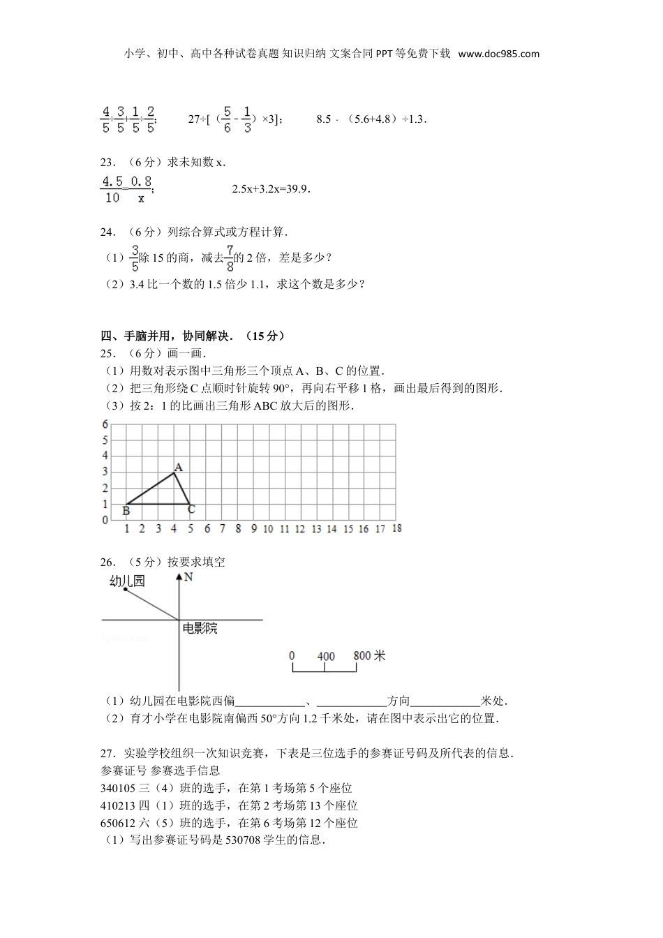小学、初中、高中各种试卷真题知识归纳文案合同PPT等免费下载www.doc985.com小升初数学模拟试卷及解析(22)|人教新课标一、细心考虑、认真填写.(每题1分,共20分)1.(2分)连接南通和苏州的世界第一斜拉桥苏通大桥总投资约六亿四千五百万元,写作,改写成用“亿元”作单位的数是亿元.2.÷20==0.45=:10=%.3.(3分)370分=元角;0.55时=分.4.(2分)今年比去年增产15%,是把的产量看作单位“1”,那么今年的产量是去年的.5.(2分)要运10吨水泥,如果每次运它的,次可以运完;每次运吨,次可以运完.6.一条林阴道从一端到另一端共栽了9棵树,相邻的两棵树相隔3米.林阴道长米,如果从林阴道两边从一端到另一端每隔2米放一盆花,一共要放盆花.7.(1分)一条绳了长2米,用去米,还剩.8.(3分)12和24这两个数的最大公约数是,最小公倍数是,它们同时能被整除.9.(4分)用最简便的方法比较下面四个分数的大小,并按从大到小的顺序排列起来.(要写出比较的过程)、、、.二、认真辩,细心判.(对的打√,错的打×.每题1分,共5分)10.一个自然数不是合数就是质数.(判断对错)11.(2010•建华区)比的前项和后项同时乘上或除以相同的数,比值不变..(判断对错)12.一个大于0的数除以带分数,所得的商小于被除数..(判断对错)小学、初中、高中各种试卷真题知识归纳文案合同PPT等免费下载www.doc985.com13.(2013秋•城西区校级月考)甲数是乙数的5倍,甲数和乙数的比是5:1..(判断对错)14.(1分)比0.2大,而比0.4小的小数不只一个0.3..(判断对错)三、去伪存真,谨慎选择.(每题1分,共5分)15.下面的三角形是用小棒拼成的,根据图形排列的规律,第100个图形要()根小棒.A.300B.299C.201D.240[来源:学科网ZXXK]16.小强体重40千克,由于生病体重减轻了10%;痊愈后,他坚持体育锻炼,体重又增加了10%,现在的体重和原来比()A.减少了B.增加了C.一样17.(1分)妈妈把9个苹果放进2个盘子里,不管怎样放,总有一个盘子里至少放进()个苹果.A.4个B.5个C.6个18.统计图能清楚地表现出部分与整体之间的关系.A.条形B.折线C.扇形19.(1分)下面四句话中,正确的一句是()A.北京某天的气温是﹣3℃至8℃,这天的温差是5℃B.圆锥的体积一定,底面半径和高成反比例C.2、3、8、5、2、6、7、2这八个数的中位数是3.5四、认真审题,仔细计算.(共32分)20.(5分)直接写出的数.103.45=2+﹣=12×25%=58.3÷0.01=3﹣=1÷×=1÷=+0.25=0.9+6.35=1028﹣2=21.(6分)用简便方法计算,要写出简算过程.7142.833.17﹣﹣;45×;1400398﹣.22.(9分)混合运算.小学、初中、高中各种试卷真题知识归纳文案合同PPT等免费下载www.doc985.com÷+÷;27÷[(﹣)×3];8.5﹣(5.6+4.8)÷1.3.23.(6分)求未知数x.=;2.5x+3.2x=39.9.24.(6分)列综合算式或方程计算.(1)除15的商,减去的2倍,差是多少?(2)3.4比一个数的1.5倍少1.1,求这个数是多少?四、手脑并用,协同解决.(15分)25.(6分)画一画.(1)用数对表示图中三角形三个顶点A、B、C的位置.(2)把三角形绕C点顺时针旋转90°,再向右平移1格,画出最后得到的图形.(3)按2:1的比画出三角形ABC放大后的图形.26.(5分)按要求填空(1)幼儿园在电影院西偏、方向米处.(2)育才小学在电影院南偏西50°方向1.2千米处,请在图中表示出它的位置.27.实验学校组织一次知识竞赛,下表是三位选手的参赛证号码及所代表的信息.参赛证号参赛选手信息340105三(4)班的选手,在第1考场第5个座位410213四(1)班的选手,在第2考场第13个座位650612六(5)班的选手,在第6考场第12个座位(1)写出参赛证号码是530708学生的信息.小学、初中、高中各种试卷真题知识归纳文案合同PPT等免费下载www.doc985.com(2)写出六(2)班在第4考场第9个座位学生的编号.五、走进生活,解决问题.(23分=3+4+4+4+4+4)28.(3分)水是由氢和氧按1:8的质量比化合成的.5.4千克的水含氢和氧各多少?29.(4分)玲玲正在读一本120页的故事书,第一周读了,第二周又读了,?(提出一...