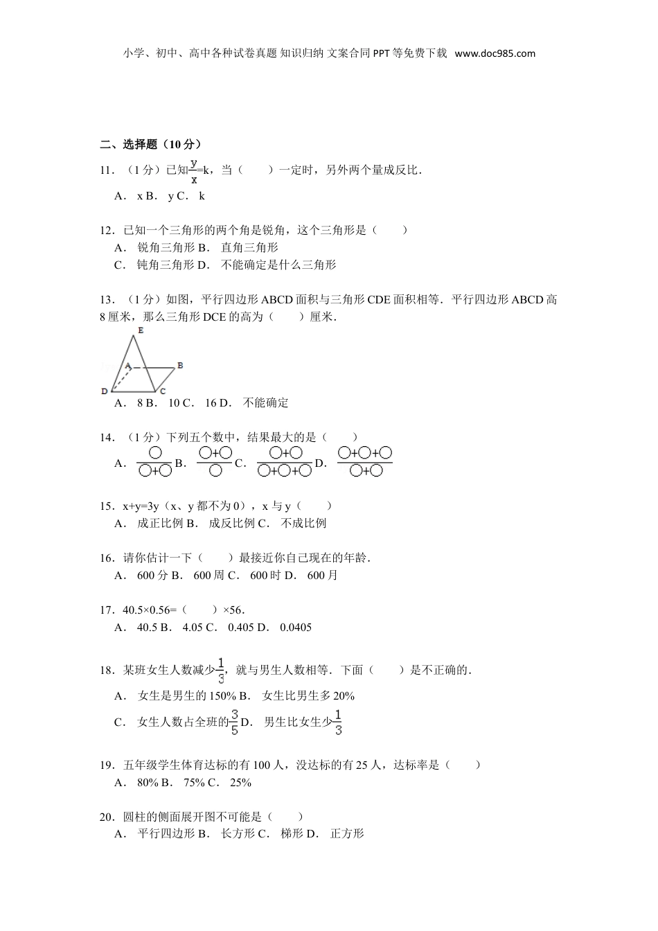 小学、初中、高中各种试卷真题知识归纳文案合同PPT等免费下载www.doc985.com小升初数学模拟试卷及解析(19)|人教新课标一、填空(20分)1.第五次人口普查,我国人口为十二亿九千五百三十八万人,写作,省略亿后面的尾数约是.2.6:5==36÷=:2.5=%.3.把线段的一端无限延长,就变成.4.被除数一定,除数和商成比例.5.一个圆柱的体积是24立方分米,和它等底等高的圆锥的体积是立方分米.6.a=b+2(a,b都是非零自然数),则a和b的最大公约数可能是,也可能是.7.(2分)陈飞骑车到相距5千米远的书店买书,如图是他离开家的距离与时间的统计图.看图完成填空.(1)他在书店买书用去分.(2)返回的速度是每小时千米.8.有一个正方体,其中三个面涂成红色,两个面涂成黄色,剩下的一个面涂成绿色.将其抛出,绿色的一面朝上的可能性为,黄色的一面朝上的可能性为.9.有一个正方体土坑,向下再挖深2米,它的表面积就增加64平方米,成为一个长方体土坑.这个长方体土坑的容积是立方米.10.如图a点和b点分别是长方形的两条边的中点,阴影部分占这个长方形面积的.小学、初中、高中各种试卷真题知识归纳文案合同PPT等免费下载www.doc985.com二、选择题(10分)11.(1分)已知=k,当()一定时,另外两个量成反比.A.xB.yC.k12.已知一个三角形的两个角是锐角,这个三角形是()A.锐角三角形B.直角三角形C.钝角三角形D.不能确定是什么三角形13.(1分)如图,平行四边形ABCD面积与三角形CDE面积相等.平行四边形ABCD高8厘米,那么三角形DCE的高为()厘米.A.8B.10C.16D.不能确定14.(1分)下列五个数中,结果最大的是()A.B.C.D.15.x+y=3y(x、y都不为0),x与y()A.成正比例B.成反比例C.不成比例16.请你估计一下()最接近你自己现在的年龄.A.600分B.600周C.600时D.600月17.40.5×0.56=()×56.A.40.5B.4.05C.0.405D.0.040518.某班女生人数减少,就与男生人数相等.下面()是不正确的.A.女生是男生的150%B.女生比男生多20%C.女生人数占全班的D.男生比女生少19.五年级学生体育达标的有100人,没达标的有25人,达标率是()A.80%B.75%C.25%20.圆柱的侧面展开图不可能是()A.平行四边形B.长方形C.梯形D.正方形小学、初中、高中各种试卷真题知识归纳文案合同PPT等免费下载www.doc985.com三、计算(32分)21.(6分)直接写得数410210=﹣+=7÷1.4=72.8÷0.8=0.77+0.33=(+)×12=÷60%=1.25××8=100.9=8.2+0.54+0.46=﹣﹣=﹣+=22.(18分)计算(第④、⑥两题简算,写出主要过程)①250×1648048÷24﹣②(10.05﹣)÷1.9+0.1③×﹣×④÷23+×⑤×[1﹣(﹣)]3.62.8+7.47.2⑥﹣﹣23.(8分)求未知数X(1)X:3.5=10.5(2)8.4:0.35=X:1.5(3)8X+3×0.9=6.3(4)X+X=×.四、操作(6分)24.把如图的平行四边形补完整,并作出指定底上的高.25.先画一条通过A、B的直线,再画一个通过A、B两点的最小的圆,并标明圆心与直径.五、应用题(32分)只列式不计算(只允许列一步算式解答,不要求计算)26.修路队修一条1200米的路,已修的与全长的比是2:5,已修了多少米?27.一个圆柱形木块体积为500立方厘米,把它削成一个最大的圆锥,求削去部分的体积.28.小华的零用钱比小红多5.6元,小红比小明少1.2元.小华比小明多多少元?小学、初中、高中各种试卷真题知识归纳文案合同PPT等免费下载www.doc985.com29.甲、乙两车从A、B两地同时相对开出,甲车到达B地要5小时,乙车到达A地要6小时.已知相遇时,甲车行了120千米,求乙车相遇时行了多少千米?二、完整解答应用题30.(2分)用一批纸装订同样大小的练习本,如果每本16页,可以装订225本.如果每本18页,可以装订多少本?(用比例解)31.(2分)小婉家今年小麦产量是2500千克,比去年增产500千克,增产了百分之几?32.一个火力发电厂采用新技术后,每天烧煤100吨,原来烧16天的煤,现在可以烧20天,现在每天比原来节约用煤多少吨?33.一个圆锥形麦堆,底面周长12.56米,高1.5米,每立方米小麦重735千克,这堆小麦重多少千克?(保留整千克)34.一项工程,甲单独...