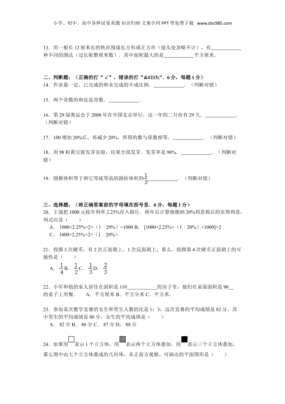 小学、初中、高中各种试卷真题知识归纳文案合同PPT等免费下载www.doc985.com小升初数学模拟试卷及解析四川省南充市一、填空:(27分,每空1分)1.我市今年共接待游客5438700人次,改写成用万作单位的数是万人次;实现旅游收入三亿七千五百万元,省略亿后面的尾数记作约是亿.2.把一根8厘米长的铁丝剪成同样长的5段.每段是全长的,每段的长是厘米.3.%=3÷4==:20=小数.4.时=时分2400毫升=升.5.:的比值是,把4:1.8化成最简整数比是:.6.12和30的最大公约数是,最小公倍数是.7.比80米多是米,12千克比15千克少%.8.一棵树在照片上高是5厘米,它的实际高度是16米.这张照片的比例尺是.9.一项工程甲独做8天完成,乙独做12天完成.甲乙合作天完成这项工程.10.王叔叔共上网240小时,其中聊天和学习的比是3:5,他学习占上网时间,聊天天.11.一部公交车上,老年乘客的人数约占所有乘客的,学生人数约占,其他青壮年人数约占,问车上人数最少.如果车上的座位数约是乘客总数的,那么超过的人不让座,就会有老年乘客站着.12.△△□☆★△△□☆★△△□☆★…左起第30个是,△是个时,其他三种图形一共是18个.小学、初中、高中各种试卷真题知识归纳文案合同PPT等免费下载www.doc985.com13.用一根长12厘米长的铁丝围成长方形或正方形(接头处忽略不计),有种不同的围法(边长取整厘米数).其中面积最大的是平方厘米.二、判断题:(正确的打“√”,错误的打“×”.6分,每题1分)14.作业量一定,已完成的和未完成的不成比例..(判断对错)15.两个奇数的和还是奇数..16.第29届奥运会于2008年在中国北京举行,这一年的二月份有29天..(判断对错)17.100增加20%后,再减少20%,所得的数与原数相等..(判断对错)18.用98粒黄豆做发芽实验,结果全部发芽.发芽率是98%..(判断对错)19.圆锥体积等于和它等底等高的圆柱体积的.(判断对错)三、选择题:(将正确答案前的字母填在括号里.6分,每题1分)20.王强把1000元按年利率2.25%存入银行.两年后计算他缴纳20%利息税后的实得利息,列式应是()A.1000×2.25%×2×(120%﹣)+1000B.[1000×2.25%×(120%﹣)+1000]×2C.1000×2.25%×2×(120%﹣)21.投掷3次硬币,有2次正面朝上,1次反面朝上,那么,投掷第4次硬币正面朝上的可能性是()A.B.C.D.22.小军和他的家人居住在面积是110的房子里,他们在桌面面积是90的桌子上用餐.A.平方厘米B.平方分米C.平方米.23.参加某次数学竞赛的女生和男生人数的比是1:3,这次竞赛的平均成绩是82分,其中男生的平均成绩是80分,女生的平均成绩是()A.82分B.86分C.87分D.88分24.如果用表示1个立方体,用表示两个立方体叠加,用表示三个立方体叠加,那么图中由七个立方体叠成的几何体,从正前方观察,可画出的平面图形是()小学、初中、高中各种试卷真题知识归纳文案合同PPT等免费下载www.doc985.comA.B.C.D.四、计算:(30分)25.直接写出计算结果.0.3×0.4=÷=6﹣=×=2006619=8÷20=7.060.06=﹣﹣+=26.(16分)(2015•嘉陵区校级模拟)用递等式计算,能简算的要简算.(1)(12.5×840﹣)÷0.6(2)+(﹣)×(3)6.8×3.57+0.43×6.8(4)+2++3.27.解方程.42:6=x:80%;0.36×52x=0.4﹣.五、操作题:(4分)28.在下面的方格图中先画出和长方形面积相等的平行四边形、三角形、梯形各一个,再在长方形中画一个最大的圆.小学、初中、高中各种试卷真题知识归纳文案合同PPT等免费下载www.doc985.com六、解决问题:(27分)29.小明买一套衣服共用去260元,裤子价是上衣的,上衣的价钱是多少元?30.“小草”文学社假期到无锡太湖边采风.汽车从学校出发,小时行了全程的,这时距离无锡太湖边还有4千米.照这样的速度,行完全程共用多少小时?31.小刚有一本科技书共60页,第一天看了全书的,第二天看了全书的60%,两天共看了多少页?32.装订一本书,如果每页排500个字,可以排180页,如果改为每页排600个字,可以少排多少页?(用比例解)33.小明读一本书,第一天读了全书的,第二天比第一天多读了6页,这时读的页数...
