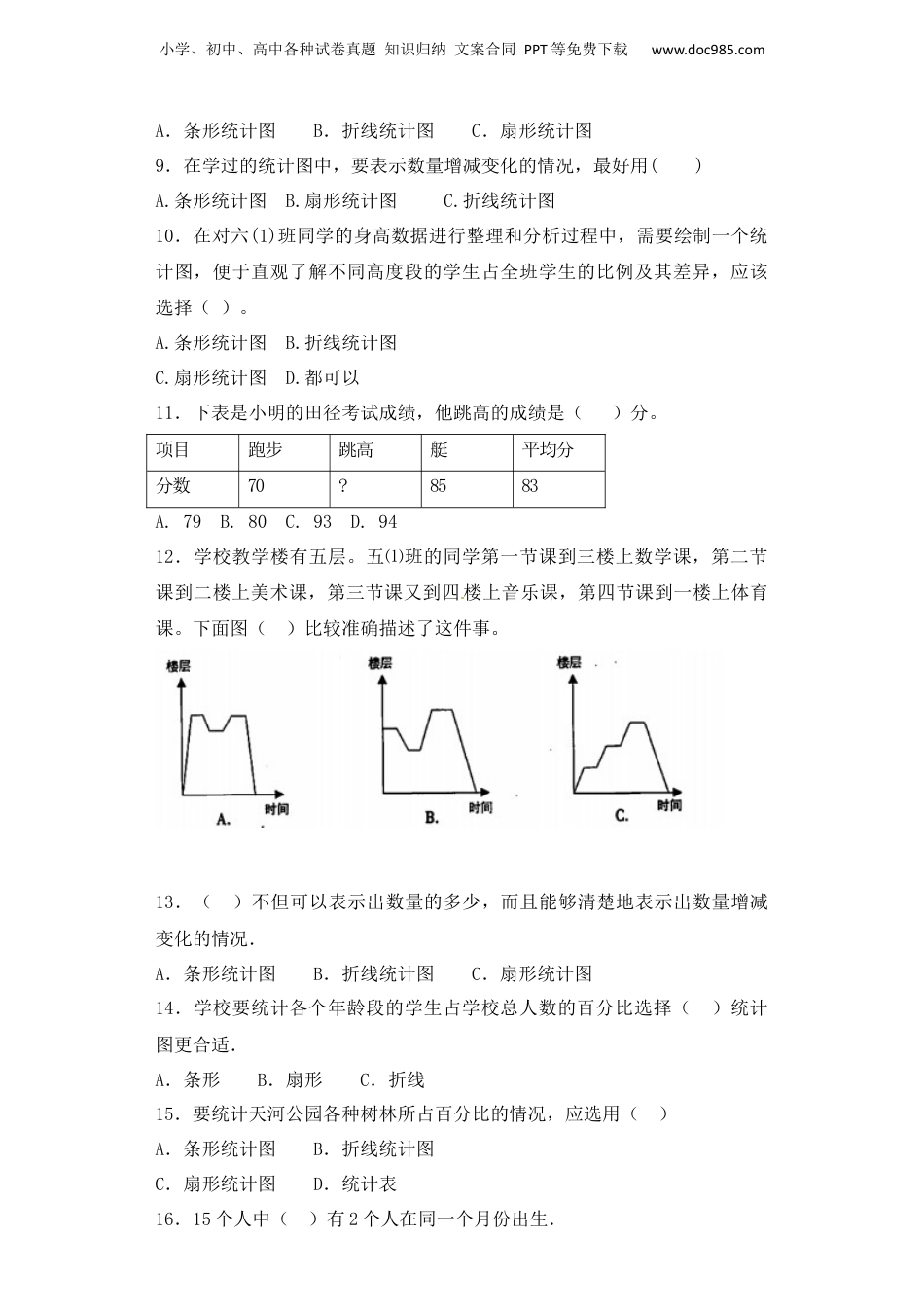 小学、初中、高中各种试卷真题知识归纳文案合同PPT等免费下载www.doc985.com小升初数学专项训练统计(2)基础题一、选择题1.()统计图既可以表示数量的多少,又可以表示数量之间的增减变化。A.条形B.折线C.扇形D.百分比2.计算机上,为了让使用者清楚、直观地看出磁盘“已用空间”与“可用空间”占“整个磁盘空间”的百分比,使用的统计图是()。A.条形统计图B.折线统计图C.扇形统计图D.条形统计图或折线统计图3.在下面三幅图所示的时间与路程关系中,最符合龟兔赛跑这则故事的是()A.B.C.4.对复式折线统计图的优点描述最准确的是()A.能看出数量的多少B.可以看出数量的增减变化[来源:学#科#网]C.折线较多,很美观D.不仅能看出数量的多少和增减变化的情况,而且方便对两组相关数据进行比较5.甲、乙二人参加某体育项目训练,为了便于研究,把最近五次训练成绩分别用实线和虚线连结,如图,下面结论错误的是()小学、初中、高中各种试卷真题知识归纳文案合同PPT等免费下载www.doc985.comA.乙的第二次成绩与第五次成绩相同B.第三次测试甲的成绩与乙的成绩相同C.第四次测试甲的成绩比乙的成绩多2分D.五次测试甲的总成绩比乙的总成绩高6.小林和小明骑自行车从学校沿一路线到20千米外的森林公园,已知小林比小明先出发,他俩所行的路程和时间的关系如图所示,下面说法正确的是()A.他们都骑行了20千米B.小林在中途停留了1小时C.两个人同时到达森林公园D.相遇后,小林的速度比小明慢7.学校组织学生去动物园春游,学生将动物园里的动物种类及数量记录在下表:动物猴马孔雀蛇松鼠数量5只3匹2只4条5只上表是按照()进行分类的。A.动物数量B.动物种类C.学生数量()的数量是相等的。A.猴和蛇B.马和蛇C.猴和松鼠8.反映某旅游景点3~8月份旅游人数的变化情况最好用()小学、初中、高中各种试卷真题知识归纳文案合同PPT等免费下载www.doc985.comA.条形统计图B.折线统计图C.扇形统计图9.在学过的统计图中,要表示数量增减变化的情况,最好用()A.条形统计图B.扇形统计图C.折线统计图10.在对六(1)班同学的身高数据进行整理和分析过程中,需要绘制一个统计图,便于直观了解不同高度段的学生占全班学生的比例及其差异,应该选择()。[来源:学|科|网]A.条形统计图B.折线统计图C.扇形统计图D.都可以11.下表是小明的田径考试成绩,他跳高的成绩是()分。项目跑步跳高艇平均分分数70?8583A.79B.80C.93D.9412.学校教学楼有五层。五⑴班的同学第一节课到三楼上数学课,第二节课到二楼上美术课,第三节课又到四楼上音乐课,第四节课到一楼上体育课。下面图()比较准确描述了这件事。13.()不但可以表示出数量的多少,而且能够清楚地表示出数量增减变化的情况.A.条形统计图B.折线统计图C.扇形统计图14.学校要统计各个年龄段的学生占学校总人数的百分比选择()统计图更合适.A.条形B.扇形C.折线15.要统计天河公园各种树林所占百分比的情况,应选用()A.条形统计图B.折线统计图C.扇形统计图D.统计表16.15个人中()有2个人在同一个月份出生.小学、初中、高中各种试卷真题知识归纳文案合同PPT等免费下载www.doc985.comA.一定B.可能C.不可能D.无法确定17.在任意的37个人中,至少有()人的属相相同.A.2B.4C.618.有甲、乙、丙、丁四个数,已知甲、乙、丙三个数的平均数是26,丁是22,四个数的平均数是()A.24B.25C.2619.五次数学成绩分别是:86分、78分、85分、92分、80分,李老师想了解小伟数学学习变化情况,则李老师最关注小伟数学成绩的()A.平均数B.中位数C.众数20.为了统计某班同学零花钱使用情况,一般要经历()步骤.A.数据收集﹣﹣整理﹣﹣﹣分析﹣﹣描述B.数据收集﹣﹣分析﹣﹣﹣整理﹣﹣描述C.数据整理﹣﹣﹣收集﹣﹣﹣分析﹣﹣描述D.数据整理﹣﹣分析﹣﹣﹣收集﹣﹣描述21.一个调查数据呈现在一个圆饼图*扇形图)里.下面哪一个条形图与这个圆饼图显示的是相同的数据?()A.B.C.D.22.某市九月份的天气情况如图,本月的雨天有()天.小学、初中、高中各种试卷真题知识归纳文案合同PPT等免费下载www.doc985.c...
