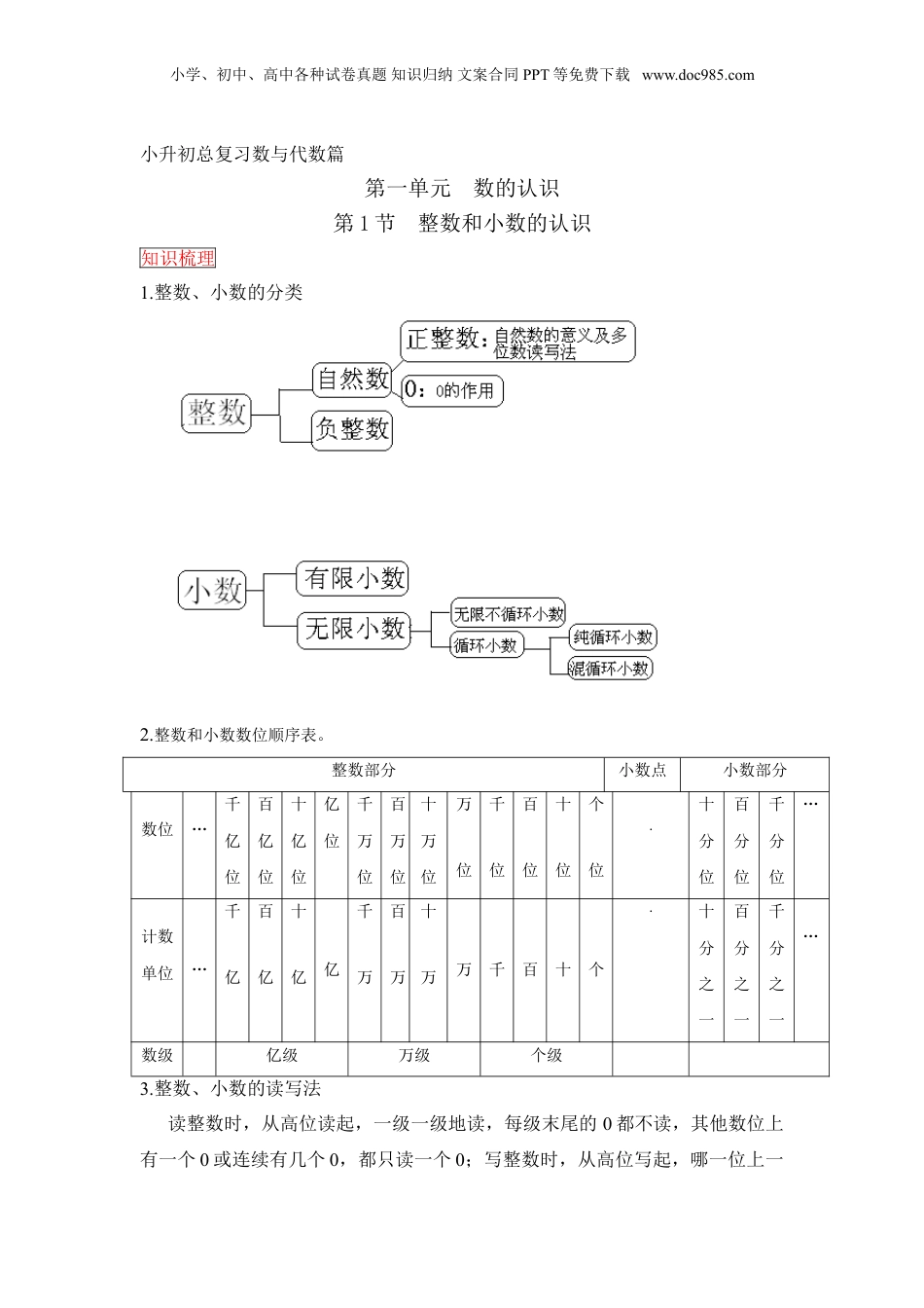 小学、初中、高中各种试卷真题知识归纳文案合同PPT等免费下载www.doc985.com小升初总复习数与代数篇第一单元数的认识第1节整数和小数的认识知识梳理1.整数、小数的分类2.整数和小数数位顺序表。整数部分小数点小数部分数位…千亿位百亿位十亿位亿位千万位百万位十万位万位千位百位十位个位·十分位百分位千分位…计数单位…千亿百亿十亿亿千万百万十万万千百十个·十分之一百分之一千分之一…数级亿级万级个级3.整数、小数的读写法读整数时,从高位读起,一级一级地读,每级末尾的0都不读,其他数位上有一个0或连续有几个0,都只读一个0;写整数时,从高位写起,哪一位上一小学、初中、高中各种试卷真题知识归纳文案合同PPT等免费下载www.doc985.com个单位也没有,就在那一位上写0。读小数时,整数部分按照整数部分读,小数点读作“点”,小数部分的数按照顺序依次读出每一位上的数;写小数时,整数部分按整数部分写,小数点写在个位右下角,然后依次写出小数部分每一个数位上的数字。4.小数的基本性质:在小数的末尾添上“0”或者去掉“0”,小数的大小不变。5.大小比较:整数比大小,先看位数,位数多的数大;位数相同,从最高位看起,相同数位上的数大的那个数大;小数比大小,先比整数部分,整数部分大的这个数就大,整数部分相同的,比小数部分第一位,第一位大的这个数大,以此类推。6.改写和省略把一个较大的数改写成以“万”或“亿”作单位,改写后的数是准确的数;把一个数根据需要省略某一位后面的尾数,省略后的数是一个近似数。7.小数点位置移动引起小数大小变化:小数点向右移动一位、两位、三位……原来的数就扩大到它的10倍、100倍、1000倍……反之,小数点向左移动一位、两位、三位……原来的数就缩小到它的101、1001、10001……典例精讲【例1】阅读下面内容,回答问题。2011年11月,在我国经济快速增长的拉动下,我国汽油生产总量为6899000吨,我国柴油生产总量为14132000吨,发电量达37130000万千瓦时。(1)2011年11月我国汽油生产总量,读作:()吨,改写成以“万吨”作单位的数是()万吨。(2)2011年11月我国柴油生产总量改写成以“万吨”作单位的数,并保留整数约是()万吨。我国发电量改写成用“亿”作单位的数,是()亿千瓦时。【分析】本题集中考查了“读数”以及“改写数”方面的知识。较大的多位数改写成用“万”“亿”作单位的数。这里有两种情况:一种是把较大的多位数直接改写成用“万”“亿”作单位的数,不满万或亿的尾数直接改写成小数;小学、初中、高中各种试卷真题知识归纳文案合同PPT等免费下载www.doc985.com另一种是根据需要省略万位或亿位后面的尾数,这时需要把原来的多位数按照四舍五入法写成它的近似数。【解】(1)六百八十九万九千689.9(2)14133713即时演练1.太平洋的面积约为一亿八千万平方米是世界第一大洋。横线上的数写作:(),改写成用“亿”作单位的数是(),四舍五入到亿位是()亿。2.由8个亿,4个千万,6个十万,5个千,8个百,2个一组成的数是(),省略亿位后面的尾数约是()。【例2】一个数由30个一,8个十分之一和21个千分之一组成,这个数写作(),读作()。这个数保留整数是(),精确到十分位是();如果把这个数缩小到原来的1001,这个数的小数点向()移动()位,是()。【分析】(1)这个数的整数部分是30,十分位上是8,百分位、千分位上分别是2、1,这个数是:30.821,读作:三十点八二一。(2)要把这个数保留整数,先看它的十分位上是几。30.821的十分位上是8,大于5,向个位上进一,约是31。(3)要把这个数精确到十分位,先看它的百分位上是否满五。它的百分位上是2,小于5,舍去,约是30.8。(4)把30.821缩小到原来的1001,就是将它的小数点向左移动两位,得0.30821.【解】30.821三十点八二一3130.8左两0.30821即时演练3.由3个百,7个一,8个十分之一,和6个0.001组成的数是(),保留一位小数是()。4.最小的两位小数是(),整数部分是0的最大两位小数是()。5.一个三位小数,用“四舍五入”法精确到百分位约是5.00,这个三位小数最大是(),最小是()。小学、初中、高中各种试卷...