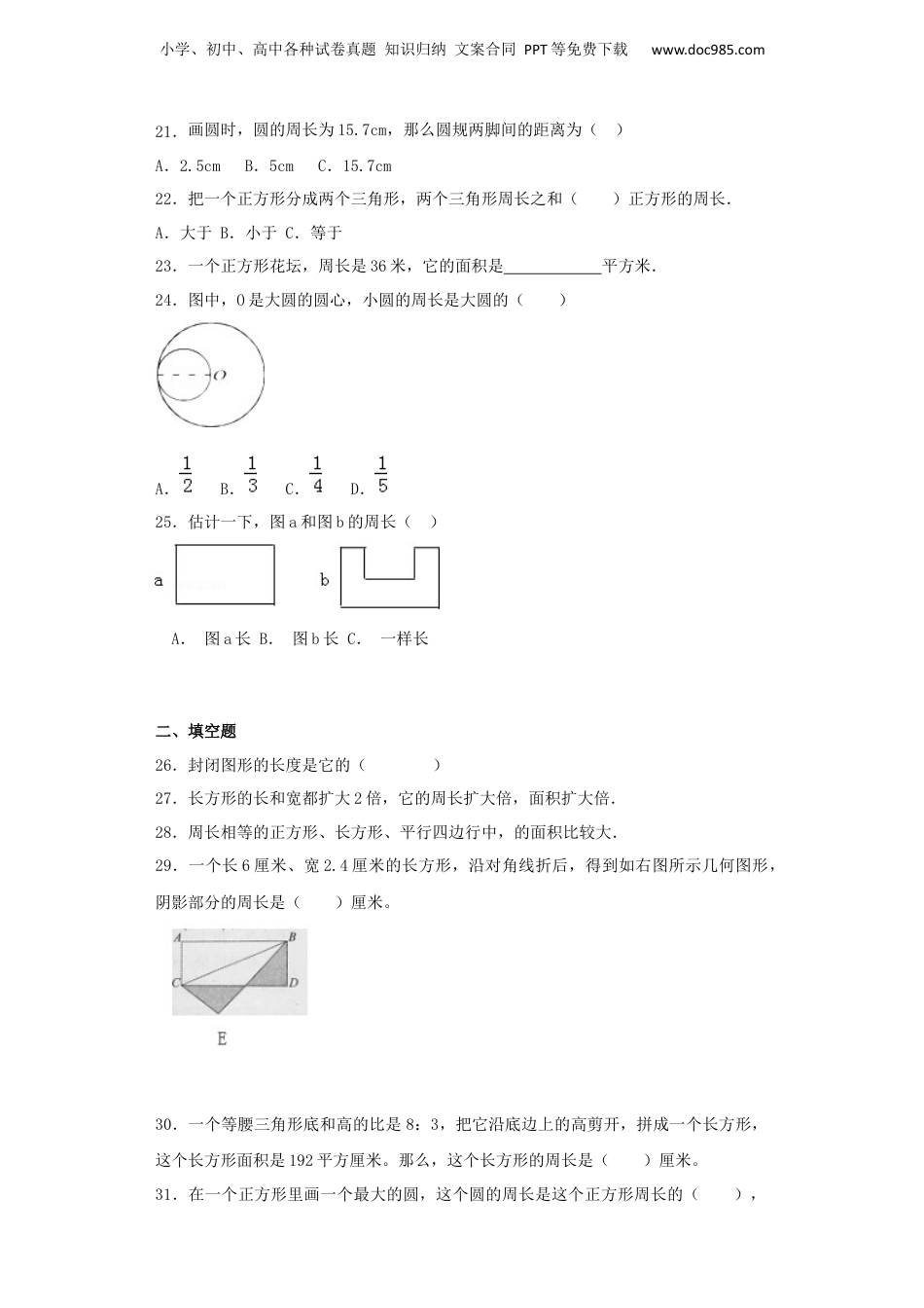 小学、初中、高中各种试卷真题知识归纳文案合同PPT等免费下载www.doc985.com小升初数学专项训练周长公式(2)基础题一、选择题1.如图是一个长5厘米,宽3厘米的长方形.下面选项()可以计算出这个长方形的周长.A.5+3B.5×3C.5×3×2D.5+3+5+32.用两根同样长的铁丝,一根围成长方形,一根围成正方形,它们的周长相比()A.长方形周长长B.正方形周长长C.一样长D.无法比较3.半圆的半径为r,直径为d,这个半圆的周长是()4.把如图的长方形用一条曲线分成甲、乙两个图形,甲图与乙图的周长相比,()A.甲图的长B.乙图的长C.甲图与乙图同样长5.把一个长方形框架拉成一个平行四边形后,它的周长()A.变长B.变短C.没有变化6.一个长为3厘米,宽比长少1厘米的长方形的周长是()A.1分米B.1厘米C.2厘米D.8厘米7.两个周长相等的长方形,()拼成一个长方形.A.一定能B.一定不能C.不一定能8.一块正方形方砖的周长是24分米,求这块方砖芳边长是多少分米,可列式为()小学、初中、高中各种试卷真题知识归纳文案合同PPT等免费下载www.doc985.comA.24÷2B.24×4C.24÷49.在一个长8厘米,宽5厘米的长方形中截取一个最大的正方形,这个正方形的周长是()厘米.A.9B.20C.12D.1610.一根长60厘米的丝带,剪下一段围成边长为11厘米的正方形,还剩()厘米.A.44B.18C.1611.一个半圆形花坛的半径是2米,则这个花坛的周长是()米.A.3.14B.6.28C.10.2812.小晨沿着长是40米、宽是20米的长方形跑道跑一圈,他一共跑了()A.800平方米B.60米C.120米13.在周长为100米的圆形花坛周围每隔5米放一盆花,一共需要()盆花.A.20B.21C.2214.小圆的直径是大圆直径的三分之一,则小圆的周长是大圆周长的()A.三分之一B.九分之一C.三分之二D.九分之四15.一块长方形菜地长4米,宽1米,一面是墙,围成这块菜地的篱笆长()米.A.10B.9C.6D.B或C16.一个长方形的长增加4厘米,宽减少4厘米,它的周长和原来长方形的周长()A.相等B.不相等C.不一定相等17.将一个半径为r厘米的圆剪开,拼成一个近似的长方形,长方形的周长是()厘米.A.πr2+2rB.2πrC.2πr+2rD.2r18.长方形的周长是18cm,长和宽可能是()A.2cm和9cmB.3cm和15cmC.4cm和5cm19.一根绳子长28分米,把它围成一个正方形,这个正方形的边长是()A.14分米B.7分米C.112分米20.一张长方形照片,长9分米,宽4分米,在它的四周镶一个相框,相框的长度是多少分米?正确的列式是()A.9+4×2B.9×2+4C.(9+4)×2小学、初中、高中各种试卷真题知识归纳文案合同PPT等免费下载www.doc985.com21.画圆时,圆的周长为15.7cm,那么圆规两脚间的距离为()A.2.5cmB.5cmC.15.7cm22.把一个正方形分成两个三角形,两个三角形周长之和()正方形的周长.A.大于B.小于C.等于23.一个正方形花坛,周长是36米,它的面积是平方米.24.图中,O是大圆的圆心,小圆的周长是大圆的()A.B.C.D.25.估计一下,图a和图b的周长()A.图a长B.图b长C.一样长[来源:Z.xx.k.Com]二、填空题26.封闭图形的长度是它的()27.长方形的长和宽都扩大2倍,它的周长扩大倍,面积扩大倍.28.周长相等的正方形、长方形、平行四边行中,的面积比较大.29.一个长6厘米、宽2.4厘米的长方形,沿对角线折后,得到如右图所示几何图形,阴影部分的周长是()厘米。30.一个等腰三角形底和高的比是8:3,把它沿底边上的高剪开,拼成一个长方形,这个长方形面积是192平方厘米。那么,这个长方形的周长是()厘米。31.在一个正方形里画一个最大的圆,这个圆的周长是这个正方形周长的(),小学、初中、高中各种试卷真题知识归纳文案合同PPT等免费下载www.doc985.com这个圆的面积是正方形面积的()。32.如上图,一张长方形纸片,假如按图中所示剪成四块,这四块纸片可拼成一个正方形。那么所拼成的正方形的边长是()厘米。33.甲圆半径是乙圆半径的3倍,甲圆的周长是乙圆周长的(),34.圆的周长与它的直径的比值叫做(),用字母()表示。35.一个长方形长是5厘米,宽是3厘米,面积是(),周长是(...