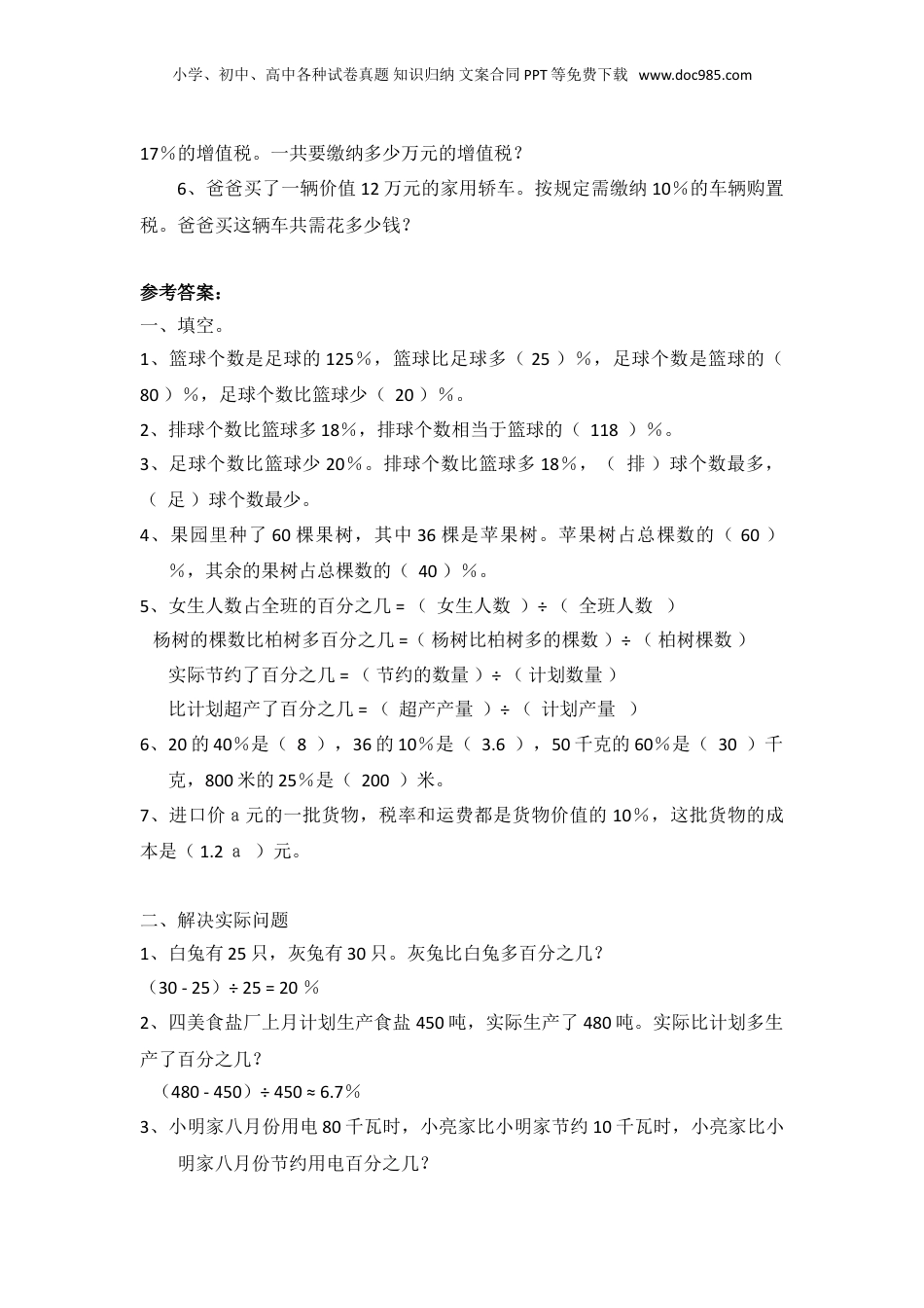 小学、初中、高中各种试卷真题知识归纳文案合同PPT等免费下载www.doc985.com小学数学总复习专题训练(一)模拟试题一、填空。1、篮球个数是足球的125%,篮球比足球多()%,足球个数是篮球的()%,足球个数比篮球少()%。2、排球个数比篮球多18%,排球个数相当于篮球的()%。3、足球个数比篮球少20%。排球个数比篮球多18%,()球个数最多,()球个数最少。4、果园里种了60棵果树,其中36棵是苹果树。苹果树占总棵数的()%,其余的果树占总棵数的()%。5、女生人数占全班的百分之几=()÷()杨树的棵数比柏树多百分之几=()÷()实际节约了百分之几=()÷()比计划超产了百分之几=()÷()6、20的40%是(),36的10%是(),50千克的60%是()千克,800米的25%是()米。7、进口价a元的一批货物,税率和运费都是货物价值的10%,这批货物的成本是()元。二、解决实际问题1、白兔有25只,灰兔有30只。灰兔比白兔多百分之几?2、四美食盐厂上月计划生产食盐450吨,实际生产了480吨。实际比计划多生产了百分之几?3、小明家八月份用电80千瓦时,小亮家比小明家节约10千瓦时,小亮家比小明家八月份节约用电百分之几?4、某化肥厂9月份实际生产化肥5000吨,比计划超产500吨。比计划超产百分之几?5、蓝天帽业厂去年收入总额达900万元,按国家的税率规定,应缴纳小学、初中、高中各种试卷真题知识归纳文案合同PPT等免费下载www.doc985.com17%的增值税。一共要缴纳多少万元的增值税?6、爸爸买了一辆价值12万元的家用轿车。按规定需缴纳10%的车辆购置税。爸爸买这辆车共需花多少钱?参考答案:一、填空。1、篮球个数是足球的125%,篮球比足球多(25)%,足球个数是篮球的(80)%,足球个数比篮球少(20)%。2、排球个数比篮球多18%,排球个数相当于篮球的(118)%。3、足球个数比篮球少20%。排球个数比篮球多18%,(排)球个数最多,(足)球个数最少。4、果园里种了60棵果树,其中36棵是苹果树。苹果树占总棵数的(60)%,其余的果树占总棵数的(40)%。5、女生人数占全班的百分之几=(女生人数)÷(全班人数)杨树的棵数比柏树多百分之几=(杨树比柏树多的棵数)÷(柏树棵数)实际节约了百分之几=(节约的数量)÷(计划数量)比计划超产了百分之几=(超产产量)÷(计划产量)6、20的40%是(8),36的10%是(3.6),50千克的60%是(30)千克,800米的25%是(200)米。7、进口价a元的一批货物,税率和运费都是货物价值的10%,这批货物的成本是(1.2a)元。二、解决实际问题1、白兔有25只,灰兔有30只。灰兔比白兔多百分之几?(30-25)÷25=20%2、四美食盐厂上月计划生产食盐450吨,实际生产了480吨。实际比计划多生产了百分之几?(480-450)÷450≈6.7%3、小明家八月份用电80千瓦时,小亮家比小明家节约10千瓦时,小亮家比小明家八月份节约用电百分之几?小学、初中、高中各种试卷真题知识归纳文案合同PPT等免费下载www.doc985.com10÷80=12.5%4、某化肥厂9月份实际生产化肥5000吨,比计划超产500吨。比计划超产百分之几?500÷(5000–500)≈11.1%5、蓝天帽业厂去年收入总额达900万元,按国家的税率规定,应缴纳17%的增值税。一共要缴纳多少万元的增值税?900×17%=153(万元)6、爸爸买了一辆价值12万元的家用轿车。按规定需缴纳10%的车辆购置税。爸爸买这辆车共需花多少钱?方法1:12×10%+12=1.2+12=13.2(万元)方法2:12×(1+10%)=12×1.1=13.2(万元)