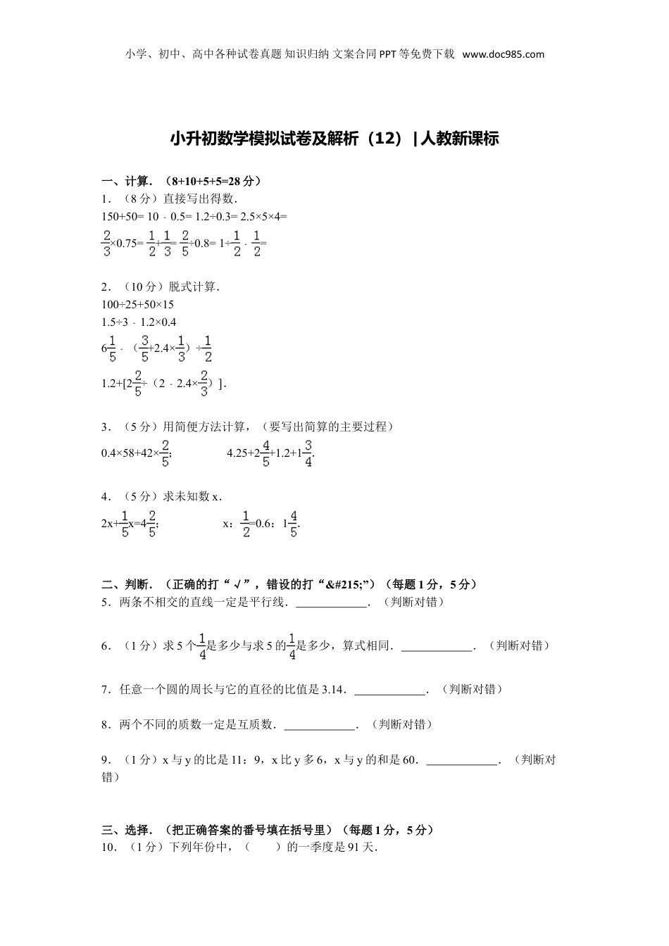 小学、初中、高中各种试卷真题知识归纳文案合同PPT等免费下载www.doc985.com小升初数学模拟试卷及解析(12)|人教新课标一、计算.(8+10+5+5=28分)1.(8分)直接写出得数.150+50=100.5=1.2÷0.3=2.5×5×4=﹣×0.75=+=÷0.8=1÷﹣=2.(10分)脱式计算.100÷25+50×151.5÷31.2×0.4﹣6﹣(+2.4×)÷1.2+[2÷(22.4×﹣)].3.(5分)用简便方法计算,(要写出简算的主要过程)0.4×58+42×;4.25+2+1.2+1.4.(5分)求未知数x.2x+x=4;x:=0.6:1.二、判断.(正确的打“√”,错设的打“×”)(每题1分,5分)5.两条不相交的直线一定是平行线..(判断对错)6.(1分)求5个是多少与求5的是多少,算式相同..(判断对错)7.任意一个圆的周长与它的直径的比值是3.14..(判断对错)8.两个不同的质数一定是互质数..(判断对错)9.(1分)x与y的比是11:9,x比y多6,x与y的和是60..(判断对错)三、选择.(把正确答案的番号填在括号里)(每题1分,5分)10.(1分)下列年份中,()的一季度是91天.小学、初中、高中各种试卷真题知识归纳文案合同PPT等免费下载www.doc985.comA.1999年B.2000年C.2001年11.下列图形中,对称轴条数最多的是()A.长方形B.正方形C.等边三角形D.圆形12.能同时被2、3、5整除的两位数有()个.A.2B.3C.413.一个正方形,一边延长,另一边延长,得到一个长方形.长方形面积比正方形积增加了()A.B.C.D.14.(1分)如果a÷b=c,当a一定时,b与c()A.成正比例B.成反比例C.不成比例四、填空.(每空1分,20分)15.(2分)第五次人口普查公布,我国有十二亿九千五百三十三万人,写成以亿作单位的小数是亿人;四川省有8603万人,读作人.16.(2分)1.05吨=吨千克;2小时20分=小时.17.(2分)2:=0.4=%.18.(1分)1的分数单位是:0.5里面有个0.01.19.(2分)0.01<<0.02;>>.20.在一幅地图上,5厘米长的线段表示100千米的实际距离.这幅地图的比例尺是.21.(1分)一个数为a,比它的2倍多1的数是.22.(1分)某洗涤剂厂2000年各季度的产值如下表.(单位:万元)季度一二三四产值1200125014001500根据表中数据算一算:(1)4个季度的平均产值是.小学、初中、高中各种试卷真题知识归纳文案合同PPT等免费下载www.doc985.com(2)三季度比二季度增长%.23.(1分)六(1)班裁的一批树,成活的棵数与死了的棵数比是4:1,这批树的成活率是.24.(1分)一个比例式中,两个内项互为例数,一个外项是2,另一个外项是.25.(1分)一项工程,甲乙合作12天完成,甲独做20天完成,乙独做天完成.26.两个整数相除,商5余3.如果把被除数、除数、商和余数相加,和是83,那么这个算式是.27.(1分)把的分子分母乘以一个相同的数后,又各加15,再均分得到.与分子分母相乘的数是.28.(1分)一个长方体的表面积是158平方厘米,底面积是40平方厘米,底面周长是26厘米.这个长方体的体积是立方厘米.29.(1分)一个圆锥与一个圆柱的体积相等,底面半径也相等,圆锥的高是12厘米,圆柱高是厘米.30.(1分)修路队修一段公路,前几天修的米数是剩下的,今天又修了42米,这时以修的米数是剩下的80%,这段公路长米.五、画、量、算,(6分)31.要求如图图形的面积,请先画出相关的线段;量取某些数据(保留整厘米数),再计算出面积.六、列式计算或列方程解.(6分)32.(3分)5.13比4与24的积少多少?小学、初中、高中各种试卷真题知识归纳文案合同PPT等免费下载www.doc985.com33.x的2倍比36的一半多9,求x.(列方程解答)七、应用题.(30分)34.(5分)李大伯家去年收小麦1050千克,收的稻谷是小麦的1.5倍.他家去年这两种粮食一共收了多少千克?35.妈妈在粮店买了15千克大米和5千克面粉,付给售货员50元,找回19元,已知面粉每千克2元,大米每千克值多少元?36.(5分)甲乙两辆汽车同时从相距270千米的两地相向而行,3小时后相遇,己知甲车每小时行50千米,乙车每小时行多少千米?37.(5分)1台织布机3小时织布60米.同样的织布机5台8小时织布多少米?38.(5分)一个长方体铁皮桶,底面是一...