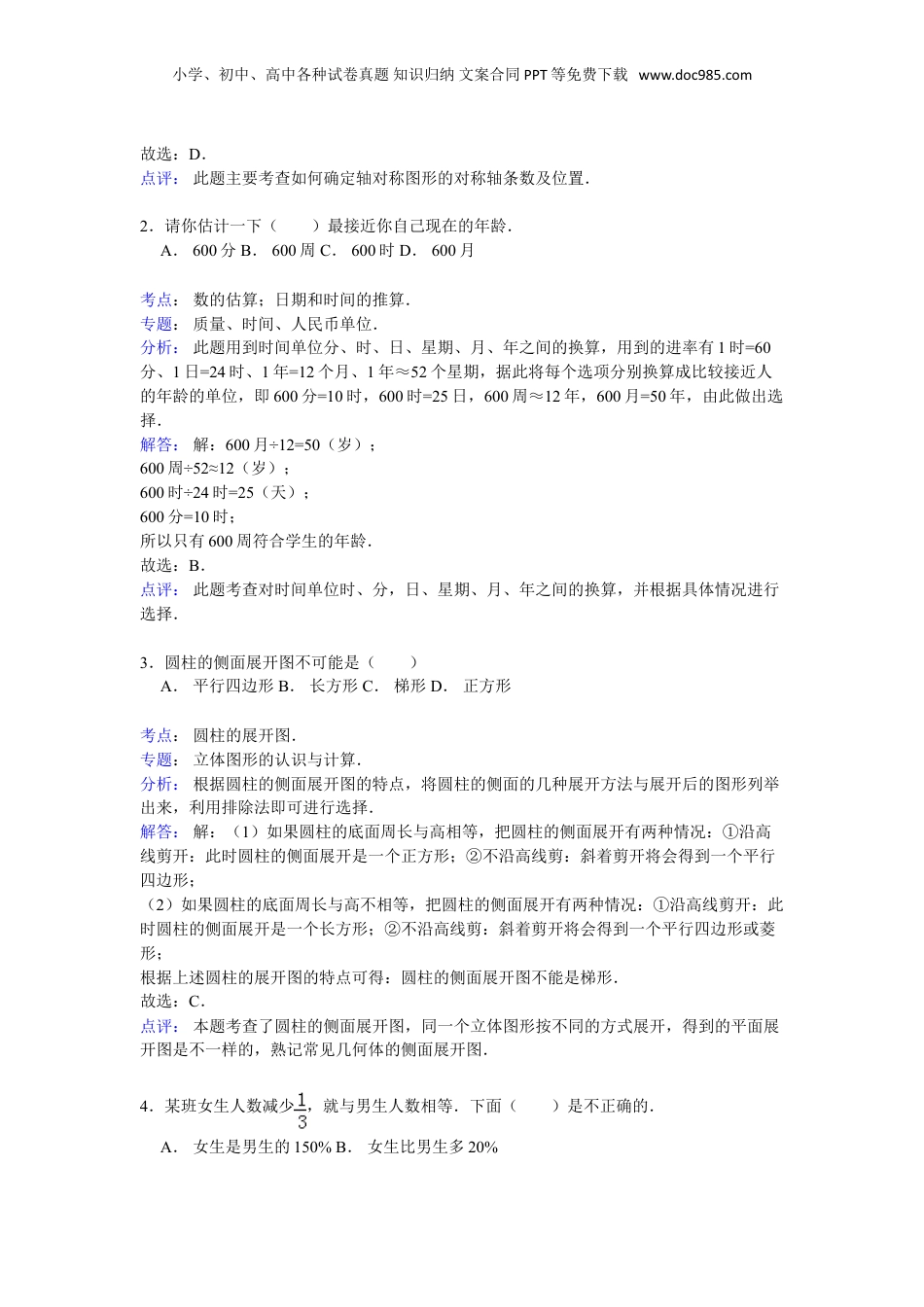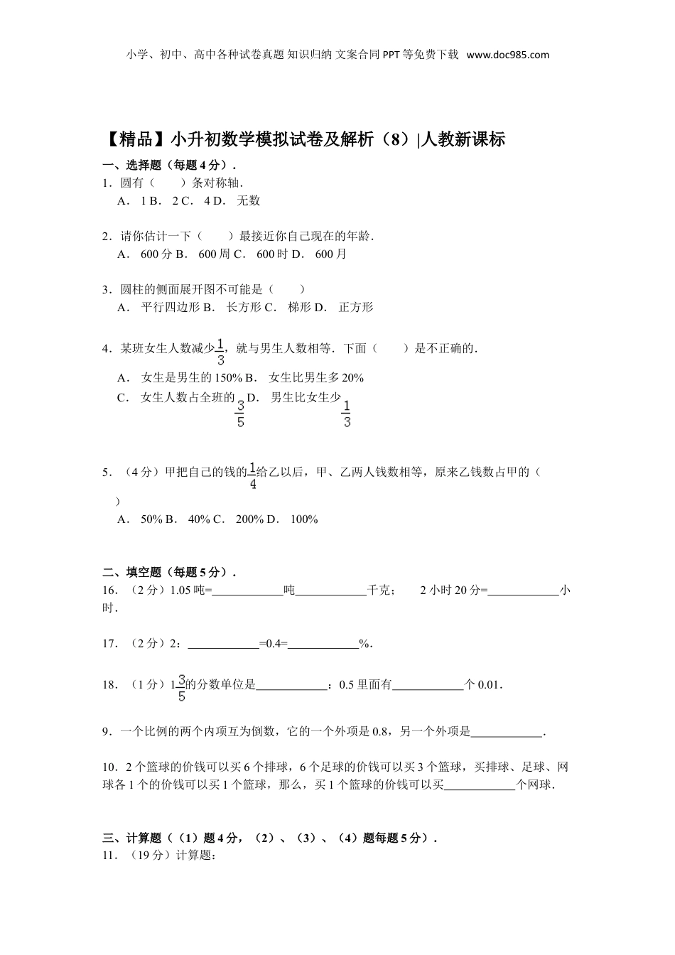 小学、初中、高中各种试卷真题知识归纳文案合同PPT等免费下载www.doc985.com【精品】小升初数学模拟试卷及解析(8)|人教新课标一、选择题(每题4分).1.圆有()条对称轴.A.1B.2C.4D.无数2.请你估计一下()最接近你自己现在的年龄.A.600分B.600周C.600时D.600月3.圆柱的侧面展开图不可能是()A.平行四边形B.长方形C.梯形D.正方形4.某班女生人数减少,就与男生人数相等.下面()是不正确的.A.女生是男生的150%B.女生比男生多20%C.女生人数占全班的D.男生比女生少[来源:Zxxk.Com]5.(4分)甲把自己的钱的给乙以后,甲、乙两人钱数相等,原来乙钱数占甲的()A.50%B.40%C.200%D.100%二、填空题(每题5分).16.(2分)1.05吨=吨千克;2小时20分=小时.17.(2分)2:=0.4=%.18.(1分)1的分数单位是:0.5里面有个0.01.9.一个比例的两个内项互为倒数,它的一个外项是0.8,另一个外项是.10.2个篮球的价钱可以买6个排球,6个足球的价钱可以买3个篮球,买排球、足球、网球各1个的价钱可以买1个篮球,那么,买1个篮球的价钱可以买个网球.三、计算题((1)题4分,(2)、(3)、(4)题每题5分).11.(19分)计算题:小学、初中、高中各种试卷真题知识归纳文案合同PPT等免费下载www.doc985.com(1)÷(﹣)[来源:学+科+网Z+X+X+K](2)2÷×+12×(++)(3)++++…+(4)3.14×43+7.2×31.4150×0.314﹣.四、解答题(第12题7分,第13题7分,第14题10分,第15题12分)12.(7分)求阴影部分面积.13.一个圆柱体,底面半径是7厘米,表面积是1406.72平方厘米.这个圆柱的高是多少?14.(10分)将一根电线截成15段,一部分每段长8米,另一部分每段长5米,长8米的总长度比长5米的总长度多3米,求这根铁丝全长多少米?15.(12分)某解放部队从营地赶往地震灾区运送急救物资,如果行进速度比原计划提高,就可以比预定时间早到20分钟;如果按原速行驶72千米,再将速度提高,就可以比预定时间早到30分.求部队营地到地震灾区的距离.参考答案与试题解析[来源:Zxxk.Com]一、选择题(每题4分).1.圆有()条对称轴.A.1B.2C.4D.无数考点:确定轴对称图形的对称轴条数及位置.专题:图形与变换.分析:根据轴对称图形的定义:一个图形沿一条直线对折,直线两旁的部分能够完全重合,则这个图形就是轴对称图形,这条直线就是这个图形的一条对称轴,据此即可解答.解答:解:根据题干分析可得,圆有无数条对称轴.小学、初中、高中各种试卷真题知识归纳文案合同PPT等免费下载www.doc985.com故选:D.点评:此题主要考查如何确定轴对称图形的对称轴条数及位置.2.请你估计一下()最接近你自己现在的年龄.A.600分B.600周C.600时D.600月考点:数的估算;日期和时间的推算.专题:质量、时间、人民币单位.分析:此题用到时间单位分、时、日、星期、月、年之间的换算,用到的进率有1时=60分、1日=24时、1年=12个月、1年≈52个星期,据此将每个选项分别换算成比较接近人的年龄的单位,即600分=10时,600时=25日,600周≈12年,600月=50年,由此做出选择.解答:解:600月÷12=50(岁);600周÷52≈12(岁);600时÷24时=25(天);600分=10时;所以只有600周符合学生的年龄.故选:B.点评:此题考查对时间单位时、分,日、星期、月、年之间的换算,并根据具体情况进行选择.3.圆柱的侧面展开图不可能是()A.平行四边形B.长方形C.梯形D.正方形考点:圆柱的展开图.专题:立体图形的认识与计算.分析:根据圆柱的侧面展开图的特点,将圆柱的侧面的几种展开方法与展开后的图形列举出来,利用排除法即可进行选择.解答:解:(1)如果圆柱的底面周长与高相等,把圆柱的侧面展开有两种情况:①沿高线剪开:此时圆柱的侧面展开是一个正方形;②不沿高线剪:斜着剪开将会得到一个平行四边形;(2)如果圆柱的底面周长与高不相等,把圆柱的侧面展开有两种情况:①沿高线剪开:此时圆柱的侧面展开是一个长方形;②不沿高线剪:斜着剪开将会得到一个平行四边形或菱形;根据上述圆柱的展开图的特点可得:圆柱的侧面展开图不能是梯形.故选:C.点评...