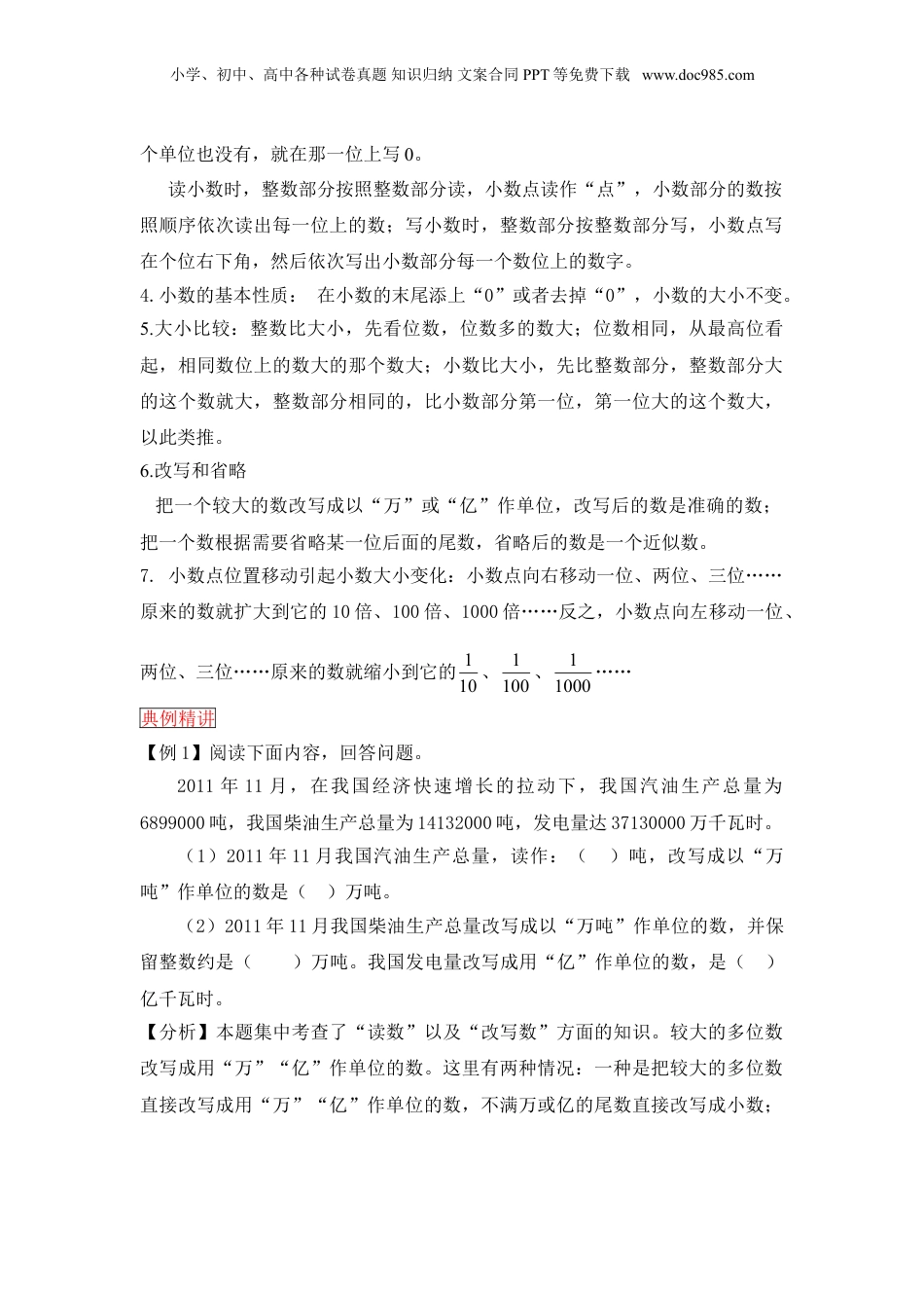 小学、初中、高中各种试卷真题知识归纳文案合同PPT等免费下载www.doc985.com小升初总复习数与代数篇第一单元数的认识第1节整数和小数的认识知识梳理1.整数、小数的分类2.整数和小数数位顺序表。整数部分小数点小数部分数位…千亿位百亿位十亿位亿位千万位百万位十万位万位千位百位十位个位·十分位百分位千分位…计数单位…千亿百亿十亿亿千万百万十万万千百十个·十分之一百分之一千分之一…数级亿级万级个级3.整数、小数的读写法读整数时,从高位读起,一级一级地读,每级末尾的0都不读,其他数位上有一个0或连续有几个0,都只读一个0;写整数时,从高位写起,哪一位上一小学、初中、高中各种试卷真题知识归纳文案合同PPT等免费下载www.doc985.com个单位也没有,就在那一位上写0。读小数时,整数部分按照整数部分读,小数点读作“点”,小数部分的数按照顺序依次读出每一位上的数;写小数时,整数部分按整数部分写,小数点写在个位右下角,然后依次写出小数部分每一个数位上的数字。4.小数的基本性质:在小数的末尾添上“0”或者去掉“0”,小数的大小不变。5.大小比较:整数比大小,先看位数,位数多的数大;位数相同,从最高位看起,相同数位上的数大的那个数大;小数比大小,先比整数部分,整数部分大的这个数就大,整数部分相同的,比小数部分第一位,第一位大的这个数大,以此类推。6.改写和省略把一个较大的数改写成以“万”或“亿”作单位,改写后的数是准确的数;把一个数根据需要省略某一位后面的尾数,省略后的数是一个近似数。7.小数点位置移动引起小数大小变化:小数点向右移动一位、两位、三位……原来的数就扩大到它的10倍、100倍、1000倍……反之,小数点向左移动一位、两位、三位……原来的数就缩小到它的101、1001、10001……典例精讲【例1】阅读下面内容,回答问题。2011年11月,在我国经济快速增长的拉动下,我国汽油生产总量为6899000吨,我国柴油生产总量为14132000吨,发电量达37130000万千瓦时。(1)2011年11月我国汽油生产总量,读作:()吨,改写成以“万吨”作单位的数是()万吨。(2)2011年11月我国柴油生产总量改写成以“万吨”作单位的数,并保留整数约是()万吨。我国发电量改写成用“亿”作单位的数,是()亿千瓦时。【分析】本题集中考查了“读数”以及“改写数”方面的知识。较大的多位数改写成用“万”“亿”作单位的数。这里有两种情况:一种是把较大的多位数直接改写成用“万”“亿”作单位的数,不满万或亿的尾数直接改写成小数;小学、初中、高中各种试卷真题知识归纳文案合同PPT等免费下载www.doc985.com另一种是根据需要省略万位或亿位后面的尾数,这时需要把原来的多位数按照四舍五入法写成它的近似数。【解】(1)六百八十九万九千689.9(2)14133713即时演练1.太平洋的面积约为一亿八千万平方米是世界第一大洋。横线上的数写作:(),改写成用“亿”作单位的数是(),四舍五入到亿位是()亿。2.由8个亿,4个千万,6个十万,5个千,8个百,2个一组成的数是(),省略亿位后面的尾数约是()。【例2】一个数由30个一,8个十分之一和21个千分之一组成,这个数写作(),读作()。这个数保留整数是(),精确到十分位是();如果把这个数缩小到原来的1001,这个数的小数点向()移动()位,是()。【分析】(1)这个数的整数部分是30,十分位上是8,百分位、千分位上分别是2、1,这个数是:30.821,读作:三十点八二一。(2)要把这个数保留整数,先看它的十分位上是几。30.821的十分位上是8,大于5,向个位上进一,约是31。(3)要把这个数精确到十分位,先看它的百分位上是否满五。它的百分位上是2,小于5,舍去,约是30.8。(4)把30.821缩小到原来的1001,就是将它的小数点向左移动两位,得0.30821.【解】30.821三十点八二一3130.8左两0.30821即时演练3.由3个百,7个一,8个十分之一,和6个0.001组成的数是(),保留一位小数是()。4.最小的两位小数是(),整数部分是0的最大两位小数是()。5.一个三位小数,用“四舍五入”法精确到百分位约是5.00,这个三位小数最大是(),最小是()。小学、初中、高中各种试卷...