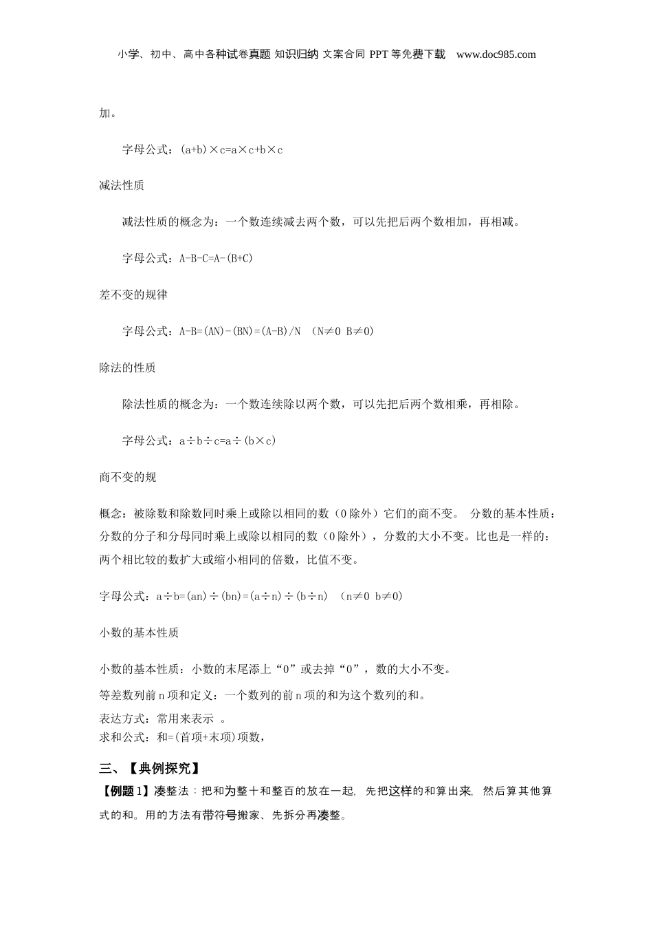 小、初中、高中各卷知文案合同学种试真题识归纳PPT等免下费载www.doc985.com目录第一讲巧算····································1第二讲行程和工程问题·····························9第三讲和差倍鸡兔同笼·····························14第四讲几何专题·································20第五讲整数和整除······························54第六讲素数合数分解素因数··························59第七讲最大公因数与最小公倍数······················64第八讲分数的意义和性质··························70第九讲分数的运算······························75第十讲分数与小数的互化··························81第十一讲分数混合运算及应用························85第十二讲比的意义和性质··························96第十三讲比例··································100第十四讲百分比的意义····························108第十五讲百分比的应用及等可能事件·····················114答案········································130小、初中、高中各卷知文案合同学种试真题识归纳PPT等免下费载www.doc985.com第一讲巧算一、【考点解读】测量物体时往往会得不到整数,于是就用小数来补充整数。小数是十进制分数的一种特殊表现形式。分母是10,100,1000……的分数也可以用小数表示。二、【知识讲解】加法运算定律加法交换律加法交换律的概念为:两个加数交换位置,和不变。同时从字母公式:a+b+c=(b+a)+c加法结合律加法结合律的概念为:先把前两个数相加,或者先把后两个数相加,和不变。字母公式:a+b+c=a+(b+c)乘法运算定律乘法交换律乘法交换律的概念为:两个因数交换位置,积不变。字母公式:a×b=b×a乘法结合律乘法结合律的概念为:先乘前两个数,或者先乘后两个数,积不变。字母公式:a×b×c=a×(b×c)乘法分配律乘法分配律的概念为:两个数与一个数相乘,可以先把它们与这个数分别相乘,再相小、初中、高中各卷知文案合同学种试真题识归纳PPT等免下费载www.doc985.com加。字母公式:(a+b)×c=a×c+b×c减法性质减法性质的概念为:一个数连续减去两个数,可以先把后两个数相加,再相减。字母公式:A-B-C=A-(B+C)差不变的规律字母公式:A-B=(AN)-(BN)=(A-B)/N(N≠0B≠0)除法的性质除法性质的概念为:一个数连续除以两个数,可以先把后两个数相乘,再相除。字母公式:a÷b÷c=a÷(b×c)商不变的规概念:被除数和除数同时乘上或除以相同的数(0除外)它们的商不变。分数的基本性质:分数的分子和分母同时乘上或除以相同的数(0除外),分数的大小不变。比也是一样的:两个相比较的数扩大或缩小相同的倍数,比值不变。字母公式:a÷b=(an)÷(bn)=(a÷n)÷(b÷n)(n≠0b≠0)小数的基本性质小数的基本性质:小数的末尾添上“0”或去掉“0”,数的大小不变。等差数列前n项和定义:一个数列的前n项的和为这个数列的和。表达方式:常用来表示。求和公式:和=(首项+末项)项数,三、【典例探究】【例题1】整法:把和整十和整百的放在一起,先把的和算出,然后算其他算凑为这样来式的和。用的方法有符搬家、先拆分再整。带号凑小、初中、高中各卷知文案合同学种试真题识归纳PPT等免下费载www.doc985.com(1)6.3+2.32+0.68+3.7=(6.3+3.7)+(2.32+0.68=10+3=13分析:运用加法结合律,6.3与3.7刚好凑成10,2.32与0.68刚好凑成3,这样凑整可使运算简便。(2)11.48-2.34-5.66=11.48-(2.34+5.66)=11.48-8=3.48分析:2.34与5.66的和是整数8,所以根据减法的运算性质把原式变为11....