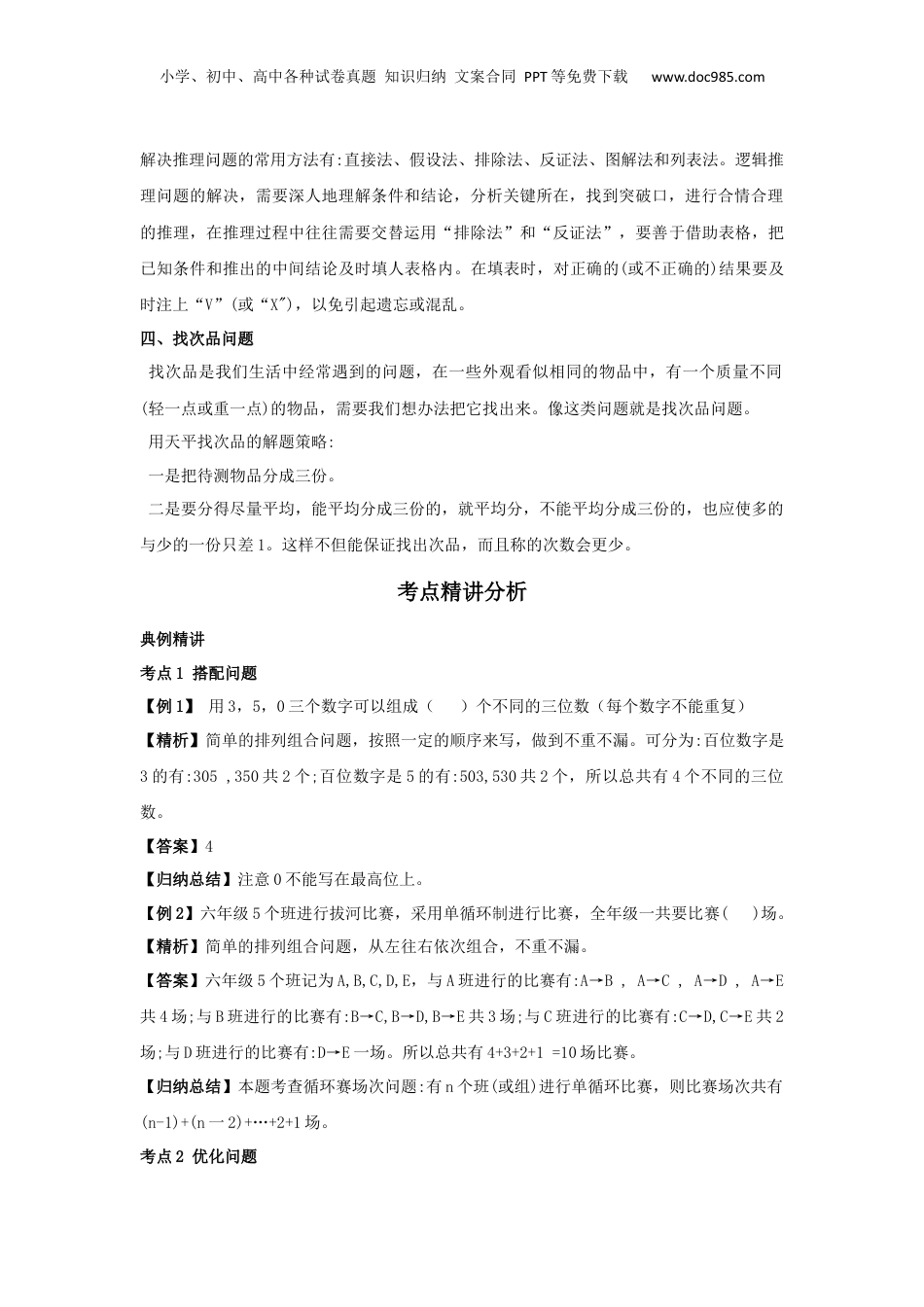 小学、初中、高中各种试卷真题知识归纳文案合同PPT等免费下载www.doc985.com第九章综合与实践(数学广角)31.分析与推理一搭配问题是指在生活中,利用排列或组合的知识解决生活中的问题,如:组数、选择出行路线,比赛场次等。1.意义排列是从n个给定的元素中选出m个元素按照一定的顺序排成一列;组合是从n个不同元素中取出m个元素组成一组,不计较组内各元素的次序。2.排列和组合的最主要区别排列与顺序有关,组合与顺序无关。3.简单的排列方法(1)按顺序选定一个事物放在首位,再把剩下的事物排好顺序。(2)先分组,再在组内按顺序排列。4.简单的组合方法(1)按顺序依次搭配,不重复、不遗漏。(2)按顺序选定一个事物放在首位进行分组,再把剩下的事物进行分组组合,不重复、不遗漏。5.口诀:分类相加,分步相乘,有序排列,无序组合。二、优化问题在日常生活中,我们经常会遇到这样的问题,完成某件事情,怎样规划安排,才能用最短的时间,最小的投人,最少的人力,最快的速度,取得最好的效果,我们称之为统筹或优化问题。如:沏茶问题、烙饼问题和田忌赛马问题等。我们还会遇到“费用最省”、“用时最少”、“面积最大”和“损耗最小”等问题,这些问题往往可以以极端情况去探讨它的最大(小)值,这类问题在数学中称为极值问题,实际上都是“最优化问题”。三、逻辑推理1.基本概念逻辑推理,是指依据逻辑规律,从一定的前提出发,通过一系列的推理来获取某种结论。2.基本方法和解题技巧小学、初中、高中各种试卷真题知识归纳文案合同PPT等免费下载www.doc985.com解决推理问题的常用方法有:直接法、假设法、排除法、反证法、图解法和列表法。逻辑推理问题的解决,需要深人地理解条件和结论,分析关键所在,找到突破口,进行合情合理的推理,在推理过程中往往需要交替运用“排除法”和“反证法”,要善于借助表格,把已知条件和推出的中间结论及时填人表格内。在填表时,对正确的(或不正确的)结果要及时注上“V”(或“X"),以免引起遗忘或混乱。四、找次品问题找次品是我们生活中经常遇到的问题,在一些外观看似相同的物品中,有一个质量不同(轻一点或重一点)的物品,需要我们想办法把它找出来。像这类问题就是找次品问题。用天平找次品的解题策略:一是把待测物品分成三份。二是要分得尽量平均,能平均分成三份的,就平均分,不能平均分成三份的,也应使多的与少的一份只差1。这样不但能保证找出次品,而且称的次数会更少。考点精讲分析典例精讲考点1搭配问题【例1】用3,5,0三个数字可以组成()个不同的三位数(每个数字不能重复)【精析】简单的排列组合问题,按照一定的顺序来写,做到不重不漏。可分为:百位数字是3的有:305,350共2个;百位数字是5的有:503,530共2个,所以总共有4个不同的三位数。【答案】4【归纳总结】注意0不能写在最高位上。【例2】六年级5个班进行拔河比赛,采用单循环制进行比赛,全年级一共要比赛()场。【精析】简单的排列组合问题,从左往右依次组合,不重不漏。【答案】六年级5个班记为A,B,C,D,E,与A班进行的比赛有:A→B,A→C,A→D,A→E共4场;与B班进行的比赛有:B→C,B→D,B→E共3场;与C班进行的比赛有:C→D,C→E共2场;与D班进行的比赛有:D→E一场。所以总共有4+3+2+1=10场比赛。【归纳总结】本题考查循环赛场次问题:有n个班(或组)进行单循环比赛,则比赛场次共有(n-1)+(n一2)+…+2+1场。考点2优化问题小学、初中、高中各种试卷真题知识归纳文案合同PPT等免费下载www.doc985.com【例3】妈妈下班回家做饭,淘米要2分钟,煮饭要20分钟,洗菜要3分钟,切菜要2分钟,炒菜要10分钟,如果煮饭和炒菜要用不同的锅和炉子,妈妈要将饭菜都做好,最少要用()时间。【精析】简单的优化问题。可以这样安排:先淘米2分钟,煮饭20分钟,煮饭的同时可以洗菜、切菜和炒菜。所以最少要用:2+20=22(分钟)。【答案】22【归纳总结】本题考查合理安排时间,既要抓住节省时间又不使工序矛盾进行分析设计。解决这类问题要注意哪些事情可以同时做,哪些不能同时做,能同时做的事情,尽量同时做,这样可以节省时间。【例4】如果将齐王的三种马的能力值设定为9,7,5,而田忌的三种马的能力都...