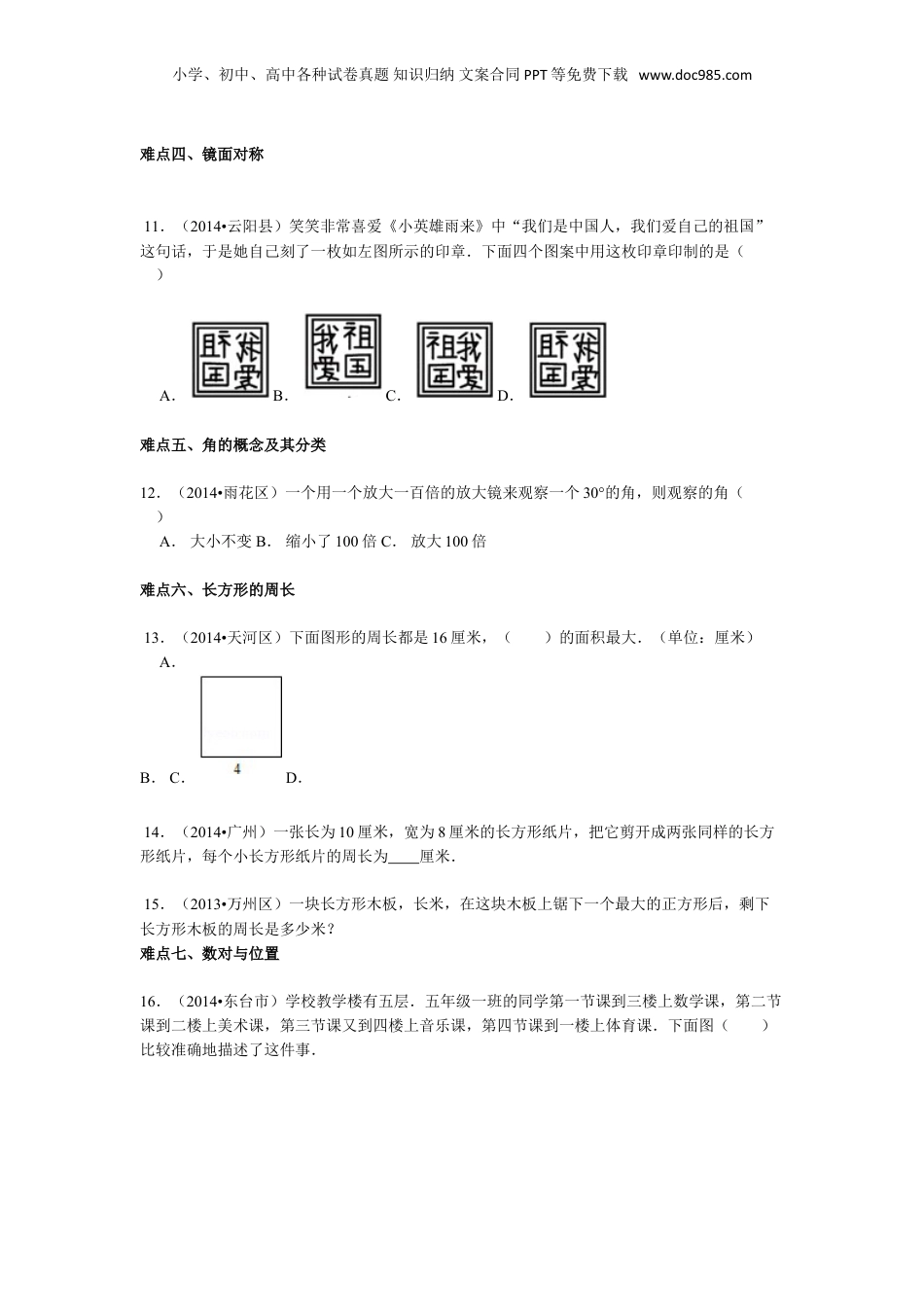 小学、初中、高中各种试卷真题知识归纳文案合同PPT等免费下载www.doc985.com空间与图形难点一、圆、圆环的周长1.(2015•长沙)在一个长8分米,宽6分米的长方形中画一个最大的圆,圆的半径是()分米.A.8B.6C.4D.32.(2014秋•邹城市校级期中)一个半圆形,半径是3厘米,它的周长是厘米.3.(2014•慈利县)求图的周长.4.(2013•石阡县)歌厅有一个圆形表演台,周长43.96米.现在半径加宽1米,比原来的面积增加多少?难点二、长方形、正方形的面积5.(2014•长沙)要剪一个面积是12.56平方厘米的圆形纸片,至少需要面积是()平方厘米的正方形纸片(π取3.14).A.12.56B.14C.16D.206.(2014•芜湖县)用3.6分米的铁丝围成一个长方形,长和宽的比是5:4,这个长方形的面积是平方厘米.7.(2014•萝岗区)在一块长26米,宽14米的长方形果园里种果树,平均每棵占地2平方米,这块果园能种果树多少棵?8.(2013•泰州)如图中,长方形被两条直线分成四个小长方形,其中三个的面积分别是12平方米、8平方米、20平方米,求另一个(图中阴影部份)长方形的面积.9.(2013•广州)如图所示,求甲比乙的面积少多少平方厘米?难点三、角的度量10.(2014•长沙)上午十点半时,时针与分针的夹角是()A.120°B.135°C.150°D.115°小学、初中、高中各种试卷真题知识归纳文案合同PPT等免费下载www.doc985.com难点四、镜面对称11.(2014•云阳县)笑笑非常喜爱《小英雄雨来》中“我们是中国人,我们爱自己的祖国”这句话,于是她自己刻了一枚如左图所示的印章.下面四个图案中用这枚印章印制的是()A.B.C.D.难点五、角的概念及其分类12.(2014•雨花区)一个用一个放大一百倍的放大镜来观察一个30°的角,则观察的角()A.大小不变B.缩小了100倍C.放大100倍难点六、长方形的周长13.(2014•天河区)下面图形的周长都是16厘米,()的面积最大.(单位:厘米)A.B.C.D.14.(2014•广州)一张长为10厘米,宽为8厘米的长方形纸片,把它剪开成两张同样的长方形纸片,每个小长方形纸片的周长为厘米.15.(2013•万州区)一块长方形木板,长米,在这块木板上锯下一个最大的正方形后,剩下长方形木板的周长是多少米?难点七、数对与位置16.(2014•东台市)学校教学楼有五层.五年级一班的同学第一节课到三楼上数学课,第二节课到二楼上美术课,第三节课又到四楼上音乐课,第四节课到一楼上体育课.下面图()比较准确地描述了这件事.小学、初中、高中各种试卷真题知识归纳文案合同PPT等免费下载www.doc985.comA.B.C.17.(2014•长沙)小明在教室里的位置用数对表示是(5,3),他坐在第5列第3行.小芳坐在小明的正前方,用数对表示她的位置是(,).18.(2014•楚州区)(1)在图上标出点A(9,5)、B(5,8)、C、(5,5),再顺次连接A、B、C.(2)将连接后得到的图形绕C点逆时针旋转90°,再向下平移3格.(3)①求出旋转过程中A点划过的轨迹的长度.②求出平移过程中图形所覆过的面积.难点八、旋转19.(2013•邹平县)以下面图形右面的一条边为轴,旋转一周,()会得到圆锥.A.B.C.D.20.(2012•万州区)汽车向前行驶是旋转现象..21.(2014•长沙)有一个电动玩具,它有一个8.28×5.14的长方形盘(单位:厘米)和一个半径为1厘米的小圆盘(盘中画有娃娃脸)它们的连接点为A、B(如图)如果小圆盘沿着长方形内壁,从A点出发,不停的滚动(无滑动),最后回到原来位置,请你计算一下,小圆盘(娃娃脸)在B、C、D位置是怎样的,并请画出示意图?小圆盘共自转了几圈?难点九、平移小学、初中、高中各种试卷真题知识归纳文案合同PPT等免费下载www.doc985.com22.(2013•宜昌)下列图形中不可能通过将图形平移或旋转得到的是()A.B.C.D.23.(2012•金沙县)平移、旋转后图形的形状大小不变,位置改变..难点十、用三角尺画30°,45°,60°,90°角24.(2013•万州区)用一副三角板不可以画出()的角.A.65°B.105°C.120°D.135°难点一十一、位置25.(2013•涪城区)如图是两个立体圆形,从不同方向会看...