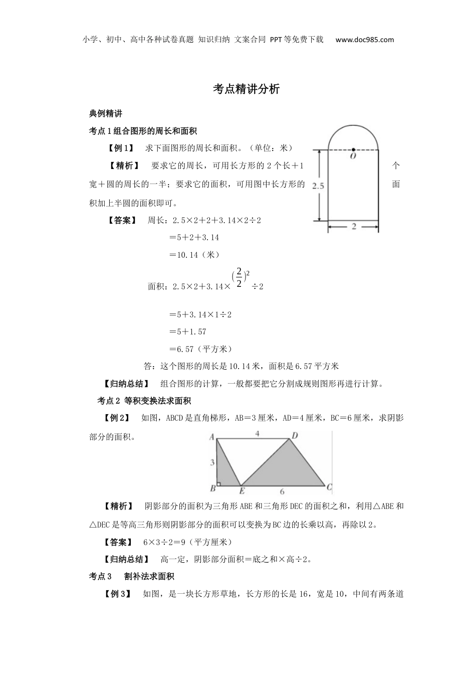 小学、初中、高中各种试卷真题知识归纳文案合同PPT等免费下载www.doc985.com23.平面图形的测量知识要点梳理一、基本图形周长面积计算公式二、组合图形求周长、面积1.阴影面积=整体-空白2.代换法梯形中的蝴蝶定理:①S1=S4②S1×S3=S2×S43.分割法4.等高三角形(1)等高三角形面积的比等于底之比。(2)等高三角形的常用判定方法:有一个公用的顶点,其余顶点均在同一直线上,所有顶点均在同一对平行线上。(3)等底三角形的面积之比等于高之比。5.交叉定理ad=bc扇形r表示半径α表示圆心角S=πr2×α360°C=2πr×α360°圆环r表示小圆半径R表示大圆半径圆环面积=大圆面积-小圆面积S环=π(R2−r2)abcd小学、初中、高中各种试卷真题知识归纳文案合同PPT等免费下载www.doc985.com考点精讲分析典例精讲考点1组合图形的周长和面积【例1】求下面图形的周长和面积。(单位:米)【精析】要求它的周长,可用长方形的2个长+1个宽+圆的周长的一半;要求它的面积,可用图中长方形的面积加上半圆的面积即可。【答案】周长:2.5×2+2+3.14×2÷2=5+2+3.14=10.14(米)面积:2.5×2+3.14×(22)2÷2=5+3.14×1÷2=5+1.57=6.57(平方米)答:这个图形的周长是10.14米,面积是6.57平方米【归纳总结】组合图形的计算,一般都要把它分割成规则图形再进行计算。考点2等积变换法求面积【例2】如图,ABCD是直角梯形,AB=3厘米,AD=4厘米,BC=6厘米,求阴影部分的面积。【精析】阴影部分的面积为三角形ABE和三角形DEC的面积之和,利用△ABE和△DEC是等高三角形则阴影部分的面积可以变换为BC边的长乘以高,再除以2。【答案】6×3÷2=9(平方厘米)【归纳总结】高一定,阴影部分面积=底之和×高÷2。考点3割补法求面积【例3】如图,是一块长方形草地,长方形的长是16,宽是10,中间有两条道小学、初中、高中各种试卷真题知识归纳文案合同PPT等免费下载www.doc985.com路,一条是长方形,一条是平行四边形,那么,阴影部分的面积是多大?【精析】如果按常规解法,此题较麻烦,如果用割补法、平移法则较简单。把左边沿路这一块割下补在右边变成一个平行四边形,然后两条路平移到边上(如下图),就容易解答了。【答案】(16-2)×(10-2)=14×8=112(平方米)答:有草部分的面积为112平方米。考点4转化法求面积【例4】如图,正方形ABCD的边长为5cm,又△CEF的面积比△ADF的面积大5cm2,求CE的长。【精析】因为△CEF的面积比△ADF的面积大5平方厘米,这两个三角形分别加上公共部分则三角形ABE的面积比正方形ABCD的面积大5平方厘米,于是利用三角形和正方形的面积公式即可求解。【答案】(5×5+5)×2÷5-5=7cm【归纳总结】巧用等式的基本性质将局部转化为整体求面积。考点5辅助线法求面积【例5】如图所示的大正方形的边长是10厘米,求阴影部分的面积。小学、初中、高中各种试卷真题知识归纳文案合同PPT等免费下载www.doc985.com【精析】(辅助线法)如图所示:三角形BCF和三角形DCF等底等高(底和高分别等于大、小正方形的边长),则二者的面积相等,分别去掉公共部分(三角形CFH),那么剩余的部分的面积,仍然相等,即三角形BCH和三角形HFD的面积相等,于是阴影部分的面积就变成了大正方形的面积的一半,据此代入数据即可求解。【答案】10×10÷2=100÷2=50(平方厘米)答:三角形BFD的面积为50平方厘米。【归纳总结】解答此题的关键是:推论得出阴影部分的面积等于大正方形的面积的一半,问题即可得解。考点6平移法求面积【例6】如图,是由一个圆和两个正方形组成的图形,其中圆的半径为2,则图中阴影部分的面积为多少?【精析】将图中的阴影部分不规则图形的面积通过平移转化成规则图形的面积集中求解。【答案】2×2=44×4÷2-4×4÷4=4答:阴影部分的面积为4。小学、初中、高中各种试卷真题知识归纳文案合同PPT等免费下载www.doc985.com名题精析【例】(西安某铁一中入学)右图是由4个边长为4厘米的正方形组成的图形,每个小正方形的一个顶点恰好在另一个正方形的中心,且边互相平行,则此图形的周长为()cm,面积为()cm2。【精析】根据图形可以看出组合图形中第一...