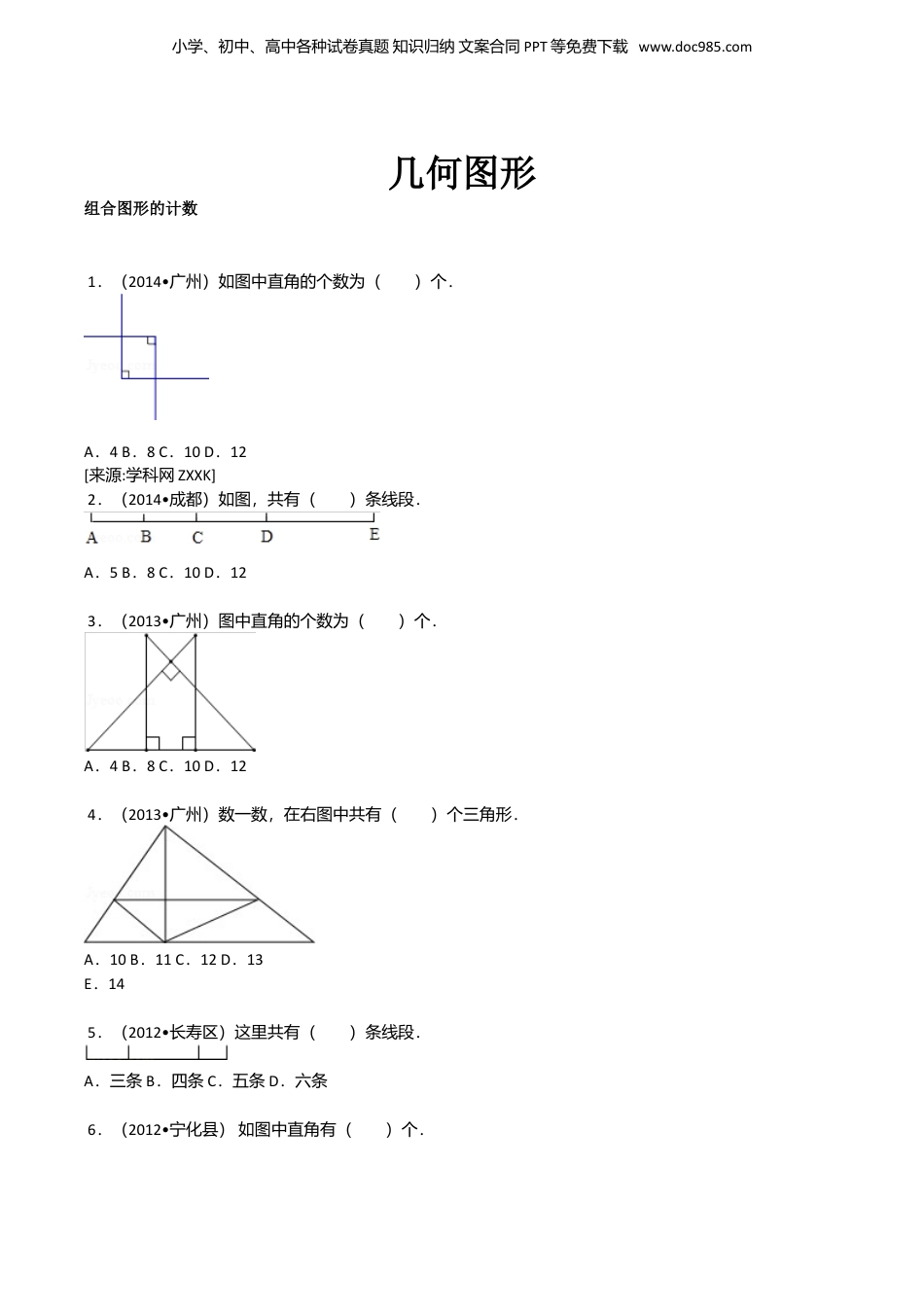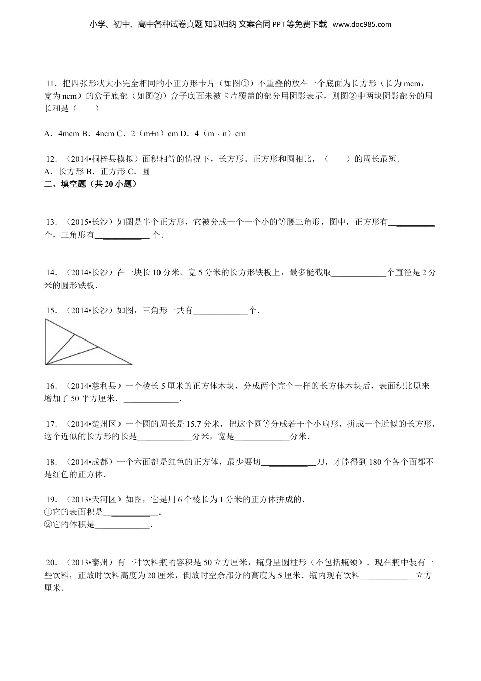 小学、初中、高中各种试卷真题知识归纳文案合同PPT等免费下载www.doc985.com几何图形组合图形的计数1.(2014•广州)如图中直角的个数为()个.A.4B.8C.10D.12[来源:学科网ZXXK]2.(2014•成都)如图,共有()条线段.A.5B.8C.10D.123.(2013•广州)图中直角的个数为()个.A.4B.8C.10D.124.(2013•广州)数一数,在右图中共有()个三角形.A.10B.11C.12D.13E.145.(2012•长寿区)这里共有()条线段.A.三条B.四条C.五条D.六条6.(2012•宁化县)如图中直角有()个.小学、初中、高中各种试卷真题知识归纳文案合同PPT等免费下载www.doc985.comA.1B.2C.3D.47.(2012•广州)如图所示的7×7的方格内,有许多边长为整数的正方形,其中在有的正方形中黑方格与白方格的个数占一半(同样多).像这样的正方形有()个.A.26B.36C.46D.56E.668.(2012•恩施州)某高层公寓大火时,小王逃生的时候看了下疏散通道如图所示,则最快逃离到楼梯(图中阴影)的通道共有()条.A.3B.9C.6D.129.(2012•恩施州)图中共有()个长方形.A.30B.28C.26D.2410.(2011•慈溪市)把14个棱长为1的正方体,在地面上堆叠成如图所示的立体,然后将露出的表面部分染成红色.那么红色部分的面积为()A.21B.24C.33D.37小学、初中、高中各种试卷真题知识归纳文案合同PPT等免费下载www.doc985.com11.把四张形状大小完全相同的小正方形卡片(如图①)不重叠的放在一个底面为长方形(长为mcm,宽为ncm)的盒子底部(如图②)盒子底面未被卡片覆盖的部分用阴影表示,则图②中两块阴影部分的周长和是()A.4mcmB.4ncmC.2(m+n)cmD.4(mn﹣)cm12.(2014•桐梓县模拟)面积相等的情况下,长方形、正方形和圆相比,()的周长最短.A.长方形B.正方形C.圆二、填空题(共20小题)13.(2015•长沙)如图是半个正方形,它被分成一个一个小的等腰三角形,图中,正方形有_________个,三角形有_________个.14.(2014•长沙)在一块长10分米、宽5分米的长方形铁板上,最多能截取_________个直径是2分米的圆形铁板.15.(2014•长沙)如图,三角形一共有_________个.16.(2014•慈利县)一个棱长5厘米的正方体木块,分成两个完全一样的长方体木块后,表面积比原来增加了50平方厘米._________.17.(2014•楚州区)一个圆的周长是15.7分米,把这个圆等分成若干个小扇形,拼成一个近似的长方形,这个近似的长方形的长是_________分米,宽是_________分米.18.(2014•成都)一个六面都是红色的正方体,最少要切_________刀,才能得到180个各个面都不是红色的正方体.19.(2013•天河区)如图,它是用6个棱长为1分米的正方体拼成的.①它的表面积是_________.②它的体积是_________.20.(2013•泰州)有一种饮料瓶的容积是50立方厘米,瓶身呈圆柱形(不包括瓶颈).现在瓶中装有一些饮料,正放时饮料高度为20厘米,倒放时空余部分的高度为5厘米.瓶内现有饮料_________立方厘米.小学、初中、高中各种试卷真题知识归纳文案合同PPT等免费下载www.doc985.com21.(2013•崇安区)在如图中,平行四边形的面积是20平方厘米,图中甲、丙两个三角形的面积比是_________,阴影部分的面积是_________平方厘米.22.(2012•湛河区)20个点最多能连成_________条线段.一个九边形的内角和是_________度.23.(2012•云阳县)把表填完整多边形…边数3456_________…内角和180°180°×2180°×3_________180°×5…24.(2012•宿迁)如图.A、B是长方形长和宽的中点,阴影部分的面积是长方形面积的_________%.25.(2012•台州)如图,A是一个圆,B是由三个半圆围成的图形,那么它们周长的大小关系是CA_________CB.26.(2012•陕西)如图的体积是_________.(单位:厘米)27.(2012•成都)如图,E是平行四边形ABCD边CD的中点,AC和BE相交于F,如果△EFC的面积是1平方厘米,则平行四边形ABCD的面积是_________平方厘米.28.(2011•阆中市校级自主招生)如图所示,把底面直径8厘米的圆柱切成若干等分,拼成一个近似的长方体.这个长方体的表...