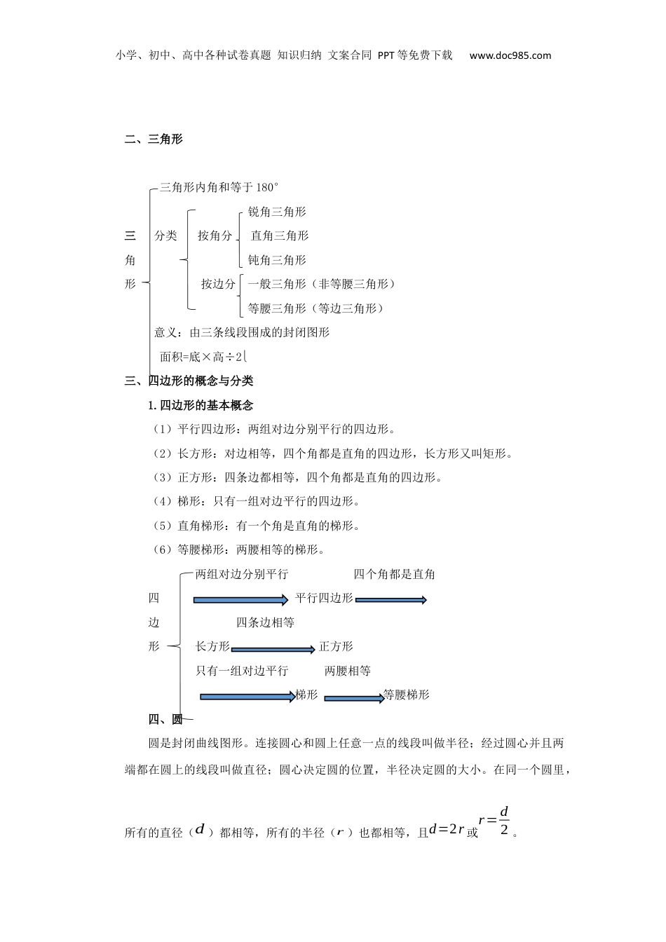 小学、初中、高中各种试卷真题知识归纳文案合同PPT等免费下载www.doc985.com第六章图形的认识22.平面图形的认识及简单计算知识要点梳理一、线和1.直线:没有端点,不能测量长度。在同一平面内,两条直线的位置关系垂直相交不垂直不相交--------平行2.射线:只有一个端点,不能测量长度。3.线段:有两个端点,能测量长度。4.垂线:两条直线相交成直角,这两条直线叫做互相垂直,其中的一条直线叫做另一条直线的垂线,两条直线的交点叫做垂足。5.平行线:在同一个平面内不相交的两条直线叫做平行线。6.点到直线的距离:从直线外一点向这条直线作垂线,这点和垂足间线段的长叫做这点到直线的距离。锐角(0°<锐角<90°)直角(直角=90°)7.角钝角(90°<钝角<180°)平角(平角=180°)周角(周角=360°)小学、初中、高中各种试卷真题知识归纳文案合同PPT等免费下载www.doc985.com二、三角形三角形内角和等于180°锐角三角形三分类按角分直角三角形角钝角三角形形按边分一般三角形(非等腰三角形)等腰三角形(等边三角形)意义:由三条线段围成的封闭图形面积=底×高÷2三、四边形的概念与分类1.四边形的基本概念(1)平行四边形:两组对边分别平行的四边形。(2)长方形:对边相等,四个角都是直角的四边形,长方形又叫矩形。(3)正方形:四条边都相等,四个角都是直角的四边形。(4)梯形:只有一组对边平行的四边形。(5)直角梯形:有一个角是直角的梯形。(6)等腰梯形:两腰相等的梯形。两组对边分别平行四个角都是直角四平行四边形边四条边相等形长方形正方形只有一组对边平行两腰相等梯形等腰梯形四、圆圆是封闭曲线图形。连接圆心和圆上任意一点的线段叫做半径;经过圆心并且两端都在圆上的线段叫做直径;圆心决定圆的位置,半径决定圆的大小。在同一个圆里,所有的直径(d)都相等,所有的半径(r)也都相等,且d=2r或r=d2。小学、初中、高中各种试卷真题知识归纳文案合同PPT等免费下载www.doc985.com五、基本平面图形的周长和面积计算公式名称图形字母意义特征计算公式(S表示面积,C表示周长长方形aba表示长b表示宽四条边都相等,四个角都是直角周长=(长+宽)×2C=(a+b)×2面积=长×宽S=a×b正方形a表示边长两组对边平行且相等,四个角都是直角周长=边长×4C=4a面积=边长×边长S=a×a平行四边形a表示底h表示高两组对边平行且相等面积=底×高S=a×h三角形a表示底h表示高有三条边和三个角,且两边之和大于第三边面积=底×高÷2S=a×h÷2小学、初中、高中各种试卷真题知识归纳文案合同PPT等免费下载www.doc985.com考点精讲分析典例精讲考点1直线、射线、线段的认识【例1】下图一共有()条直线,()条射线,()条线段。【精析】直线没有端点,在这个图中只有1条直线;射线只有一个端点,它可以向一端无限延长,故图中的每一个点都可以看作是射线的端点,从这个端点都有向左或向右无限延长得到的两条射线,所以图中一共有2×4=8(条)射线;线段有两个端点,图中任意两个端点间的一段都可以看作线段,图中有6条线段。可以先标上字母,再一一列举出来。【答案】1,8,6【归纳总结】根据直线、射线、线段的概念,一一列举出来。考点2角的认识【例2】图中有()个锐角,()个直角,()个钝角,()个平角。梯形a表示上底b表示下底h表示高只有一组对边平行面积=(上底+下底)×高÷2S=(a+b)×h÷2圆r表示半径d表示直径π表示圆周率同一圆内所有半径、所有直径分别相等,直径等于半径的2倍周长=直径×圆周率=半径×圆周率×2C=πd=2πr面积=π×半径2S=πr2小学、初中、高中各种试卷真题知识归纳文案合同PPT等免费下载www.doc985.com【精析】锐角是大于0°小于90°的角。图中共有4个锐角;直角是等于90°的角图中共有3个直角;钝角是大于90°而小于180°的角,从图中可以看出有2个钝角;平角等于180°的角,图中有1个平角。【答案】4,3,2,1【归纳总结】解决这类问题,要充分利用已知条件以及它们之间的关系。考点3三角形三边关系【例3】一个等腰三角形,其中两条边长度的比是3∶7,它的周长是221厘米。这个等腰三角形的底边长是多少厘米?【精析】按比...