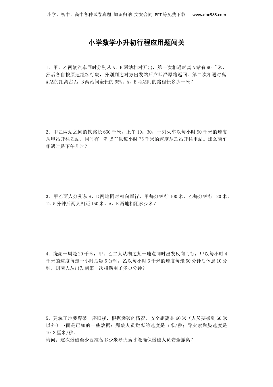 小学、初中、高中各种试卷真题知识归纳文案合同PPT等免费下载www.doc985.com小学数学小升初行程应用题闯关1.甲、乙两辆汽车同时分别从A,B两站相对开出,第一次相遇时离A站有90千米,然后各自按原速继续行驶,分别到达对方出发站后立即沿原路返回。第二次相遇时离A站的距离占A,B两站间全长的65%。A,B两站间的路程长多少千米?2.甲乙两站之间的铁路长660千米,上午10:30,一列火车以每小时90千米的速度从甲站开往乙站,同时有一列货车以每小时75千米的速度从乙站开往甲站。那么两车相遇时是下午几时?3.甲乙两人分别从A、B两地同时相向而行,甲每分钟行100米,乙每分钟行120米,12.5分钟后两人相距150米。A、B两地相距多少米?4.绕湖一周是20千米,甲、乙二人从湖边某一地点同时出发反向而行,甲以每小时4千米的速度每走一小时后歇5分钟,乙以每小时6千米的速度每走50分钟后休息10分钟,则两人从出发到第一次相遇用了多少分钟?5.建筑工地要爆破一座旧楼.根据爆破的情况,安全距离是60米(人员要撤到60米以外)下面是已知的一些数据:爆破人员撤离的速度是6米/秒;导火索燃烧速度是10.3厘米/秒。请问:这次爆破至少要准备多少米导火索才能确保爆破人员安全撤离?小学、初中、高中各种试卷真题知识归纳文案合同PPT等免费下载www.doc985.com6.现在是11点整,再过多少分钟,时针和分针第一次垂直?7.猫追老鼠,原来它们相距25米,猫跑了50米后与老鼠相距5米.猫还要跑多少米就可以追上老鼠?8.一只猎狗发现在离它18米远的前方有一只狐狸在跑,它马上紧追.猎狗跑2步的路程狐狸要跑3步,而猎狗跑5步的时间,狐狸可跑7步。猎狗跑多少米能追上狐狸?9.甲、乙两港之间的距离是140千米.一艘轮船从甲港开往乙港,顺水7小时到达,从乙港返回甲港逆水10小时到达.这艘轮船在静水中的速度和水流速度各是多少?10.甲、乙两条船,在同一条河上相距210千米,若两船相向而行,则2小时相遇;若同向而行,则14小时甲赶上乙,求两条船的速度。11.A、B两港间的水路长208千米.一只船从A港开往B港,顺水8小时到达;从B港返回A港,逆水13小时到达.求船在静水中的速度和水流速度。小学、初中、高中各种试卷真题知识归纳文案合同PPT等免费下载www.doc985.com12.一只小船从A地到B地往返一次共用2小时.回来时顺水,比去时的速度每小时多行驶8千米,因此第二小时比第一小时多行驶6千米.求A至B两地距离。13.甲乙两站相距440米,一辆大车和一辆小车从两站相对开出,大车每小时行35千米,小车每小时行45千米,一只燕子以每小时50千米的速度和大车同时出发,向小车飞去,遇到小车又折回向大车飞去,遇到大车又往回飞向小车,这样一直飞下去,燕子飞了多少千米两车才相遇?14.A、B两城同时对开客车,两车第一次在距A城50千米外相遇,到站后各停20分钟上下乘客再返回,返回时在距B城40千米处又相遇,问A、B两城相距多少千米?15.甲、乙两人在相距90米的直路上来回跑步,甲的速度是每秒3米,乙的速度是每秒跑2米。如果他们同时从他们两端出发,跑了10分钟。那么,在这段时间内,甲、乙两人共迎面相遇了多少次?16.甲从A地往B地,乙、丙两人从B地往A地,三人同时出发,甲首先在途中与乙相遇,之后15分钟又与丙相遇,甲每分钟走70米,乙每分钟走60米,丙每分钟走50米,问:A、B两地相距多少米?小学、初中、高中各种试卷真题知识归纳文案合同PPT等免费下载www.doc985.com17.有一周长为1千米的环形跑道,甲、乙二人同时从同地出发,若同向跑1小时后甲比乙多跑一圈,若以相反的方向跑4分钟后二人相遇,求甲、乙二人的速度。18.甲、乙两人绕圆形跑道竞走,他们同时、同地、相背而行,6分钟相遇后又继续前进4分钟。这时甲回到出发点,乙离出发点还差300米。这个圆形跑道的长度是多少米?19.小明在360米长的环行的跑道上跑了一圈,已知他前一半时间每秒跑5米,后一半时间每秒跑4米,问他后一半路程用了多少时间?20.小明和小红沿学校操场的400米环形跑道上练习跑步,小明每秒跑6米,小红每秒跑4米,如果他们同时在同一地点出发,跑了5分种,问他们在途中可能相遇几次?21.某钟表,在4月26日零点...