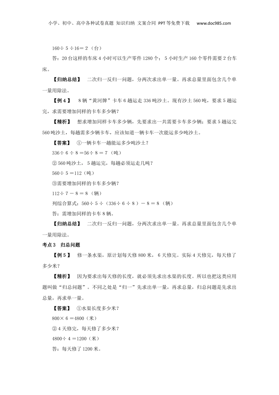 小学、初中、高中各种试卷真题知识归纳文案合同PPT等免费下载www.doc985.com14.归一、归总问题知识要点梳理一、归一问题1.归一问题来历:我国珠算除法中有一种方法,称为归除法,除数是几,就称几归;除数是8,就称为8归。而归一的意思,就是用除法求出单一量,这就是归一的说法。在解答某些应用题时,常常需要先找出“单一量”,然后以这个“单一量”为标准,根据其他条件求出结果。用这种解题思路解答的应用题,称为归一问题。所谓“单一量”是指单位时间的工作量、物品的单价、单位面积的产量、单位时间所走的路程等。2.归一问题有两种基本类型如下:先求单一量再一次归一:一步求单一量归正归一:求几个单一量一是多少(乘)二次归一:两步求单一量问题反归一:先求单一量再求包含几个单一量(除)3.正、反归一问题的相同点是:第一步先求出单一量;不同点是:第二步正归一是乘法,反归一是除法。二、归总问题与归一问题类似的是归总问题,归一问题是找出“单一量”,而归总问题是先找出“总量”,然后再根据其他条件算出所求的问题,叫归总问题。所谓“总量”是指几小时(几天)的总工作量、几亩地上的总产量、总路程、总产量、工作总量、物品的总价等。数量关系:1份数量×份数=总量总量÷1份数量=份数总量÷另一份数=另一每份数量解题思路:先求出总数量,再根据题意得出所求的数量。考点精讲分析典例精讲考点1正归一问题【例1】一只小蜗牛6分钟爬行12分米,照这样速度1小时爬行多少米?【精析】为了求出蜗牛1小时爬多少米,必须先求出1分钟爬多少分米单一量(一小学、初中、高中各种试卷真题知识归纳文案合同PPT等免费下载www.doc985.com次归一)即蜗牛的速度,然后以单一量为依据按要求算出结果。【答案】①小蜗牛每分钟爬行多少分米?12÷6=2(分米)②1小时爬几米?1小时=60分2×60=120(分米)=12(米)答:小蜗牛1小时爬行12米。【归纳总结】一般情况下第一步先求出单一量,第二步求几个单一量是多少。【例2】王奶奶家养了5头奶牛,7天产牛奶630千克,照这样计算,8头奶牛15天可产牛奶多少千克?【精析】第一步先算1头奶牛7天产的牛奶为单一量一次归一,再算1头奶牛1天产的牛奶为单一量二次归一,最后8头奶牛15天可产牛奶多少千克。【答案】①1头奶牛1天产奶多少千克?630÷5÷7=18(千克)②8头奶牛15天可产牛奶多少千克?18×8×15=2160(千克)答:8头奶牛15天可产牛奶2160千克。【归纳总结】二次归一问题,一般情况下两步求出单一量,然后还是求几个单一量是多少。考点3反归一问题【例3】5台车床3小时生产240个,照这样计算,20台这样的车床4小时可以生产零件多少个?5小时生产160个零件,至少需要几台车床?【精析】20台这样的车床4小时可以生产零件多少个必须先算出1台1小时生产多少个,即二次归一问题中的反归一,分两次求出单一量。5小时生产160个零件,至少需要几台车床?这是反归一即求总量里面包含几个单一量用除法。【答案】①1台机床1小时生产零件多少个?240÷5÷3=16(个)②20台这样的车床4小时可以生产零件多少个?20×4×16=1280(个)③5小时生产160个零件,至少需要几台车床?小学、初中、高中各种试卷真题知识归纳文案合同PPT等免费下载www.doc985.com160÷5÷16=2(台)答:20台这样的车床4小时可以生产零件1280个;5小时生产160个零件需要2台车床。【归纳总结】二次归一反归一问题,分两次求出单一量。再求总量里面包含几个单一量用除法。【例4】8辆“黄河牌”卡车6趟运走336吨沙土。现有沙土560吨,要求5趟运完,求需要增加同样的卡车多少辆?【精析】想求增加同样卡车多少辆,先要求出一共需要卡车多少辆;要求5趟运完560吨沙土,每趟需多少辆卡车,应该知道一辆卡车一次能运多少吨沙土。【答案】①一辆卡车一趟能运多少吨沙土?336÷6÷8=56÷8=7(吨)②560吨沙土,5趟运完,每趟必须运走几吨?560÷5=112(吨)③需要增加同样的卡车多少辆?112÷7-8=8(辆)列综合算式:560÷5÷(336÷6÷8)-8=8(辆)答:需增加同样的卡车8...