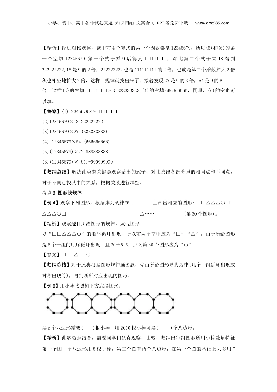 小学、初中、高中各种试卷真题知识归纳文案合同PPT等免费下载www.doc985.com11.探索规律知识要点梳理探索规律一般分为重复的规律(周期问题)和变换的规律,其中变换的规律又分为数字排列律,计算式规律,图形排列规律,图形变换规律。数字排列规律:数列填空,要在数列中相邻两个数的和、差、积、商中发现共同点,寻找规律。数组填空,一般先看到每组第一个数与组数的关系,再分别看每组中后几个数与本组中的第一个数的关系。数阵或数表填空,要分析数的横行或竖列中各数的关系,找出规律。图形的变化规律:先确定有儿种图形,然后观察每种图形在不同组的位置变化,最后找出图形的排列规律。颜色交替规律:通过发现两组颜色的变化来找出规律。间隔排列物体个数之问的变化规律:两种物体间隔着排成一行,排在两端的物体个数比中间多1个。或者说排在中问的物体个数比两端的少1个。解决周期问题主要是找到循环重复的部分,用有余除法进行解答,而探索变换的规律时要注意观察,比较和归纳总结,对学生的综合能力要求较高,学生要多加练习不同的题型。考点精讲分析典例精讲考点1数字排列规律【例1】找规律填空。(1)1,5,9,13,17,(),()……(2)10,11,13,16,(),25……(3)1,3,7,15,31,()……(4)1,1,2,3,5,8,(),()……(5)4,9,16,25,(),()……【精析】本题先比较相邻两个数的差,发现规律,(1)的差都相等是4,(2)的差是1,2,3,4……的有序自然数,(3)的差是2,4,8,16……的倍数关系数列,(4)的差是小学、初中、高中各种试卷真题知识归纳文案合同PPT等免费下载www.doc985.com0,1,1,2,3又重复本来的数列,再总结下可以发现从第三个数开始每个数等于前两个数的和,(5)的差是5,7,9...…奇数列,再总结下发现每个数是自然数的平方。然后根据规律填空即可。【答案】(1)1,5,9,13,17,(21),(25)……(2)10,11,13,16,(20),25……(3)1,3,7,15,31,(63)……(4)1,1,2,3,5,8,(13),(21)……(5)4,9,16,25,(36),(49)……【归纳总结】此类题是数列找规律题目,解决时可以先观察数字之间的联系,如果直接看不出来的话通常可以算出数列相邻两个数字的差,然后再观察差的规律,根据规律推出差进行加法计算,算出空的数字,此题中的(I)是小学比较重要的等差数列,(2)和(3)可以称为二阶数列(相邻两数差构成基本数列),(4)是著名的兔子数列(也叫斐波那切数列),(5)是平方数列,总结这些数列的特点,可以帮助我们更好的解答数列找规律的题目。【例2】将17化成小数后,小数点后第2011位数是()。【精析】先把17化成小数,然后认真观察,看小数部分从哪一位开始每几位数重复为一个周期,再用有余数除法计算出余数,余几就是周期内第几个数。17=0.142857,每6位为一个周期,2011÷6=335……1,即2011位是第336个周期的第一个数字“1”。【答案】1【归纳总结】周期问题也是找规律的一种方式,发现重复的部分,然后用有余除法进行计算,商表示有一个完整的周期,余数表示最后不完整第几个数。考点2计算式找规律【例3】先观察下面各算式,找出规律,再填空。(1)12345679×9=111111111(2)12345679×18=222222222(3)12345679×27=()(4)12345679×54=()(5)()×72=88888888(6)()×()=999999999小学、初中、高中各种试卷真题知识归纳文案合同PPT等免费下载www.doc985.com【精析】经过对比观察,题中前4个算式的第一个因数都是12345679,所以(5)和(6)的第一个空填12345679:第一个式子乘9后得到111111111,对比第二个式子乘18得到222222222,18是9的2倍,222222222也是111111111的2倍,也就是第二个乘数扩大2倍,积也相应地扩大2倍,这样,规律就找出来了。接着发现27是9的3倍,54是9的6倍,这样(3)的空填111111111×3=333333333,(4)的空填666666666,同理,(6)的空也可以填。【答案】(1)12345679×9=111111111(2)12345679×18=222222222(3)12345679×27=(333333333)(4)12345679×54=(666666666)(5)(12345679)×72=888888888(6)(12345679)×(81)=999999999【归纳总结】解决此类题关键是观察给出的式子,对比找出各部分量的相同点和不同点,对于不同点找其中的关系,根据关系进行填...