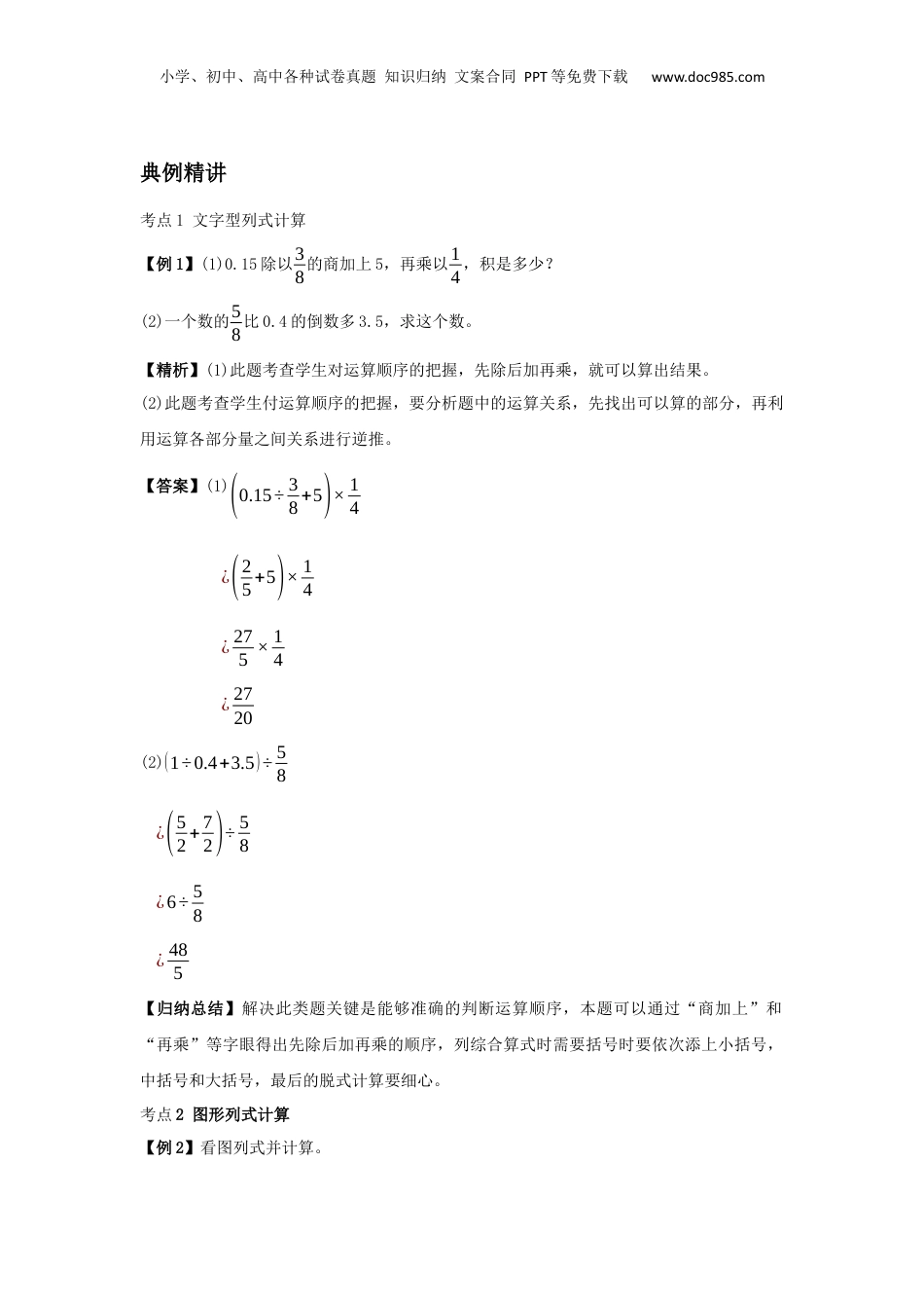 小学、初中、高中各种试卷真题知识归纳文案合同PPT等免费下载www.doc985.com7.列式计算和定义新运算知识要点梳理一、列式计算1.文字式题的意义用语言文字表达,由数学术语和数字编成的数学题目,叫文字式题。解答文字式题时,通常要列综合算式进行计算。因此,解答文字式题的关键是正确列出算式。2.文字式题的叙述形式(1)根据四则运算的意义叙述的题。如“两个加数的和是65,一个加数是25.8,求另一个加数是多少?”;“9个2.25是多少?”等。(2)根据算式各部分名称叙述的题。如“除数是57,被除数是4.5,商是多少?”(3)根据算式直读法叙述的题。如“1112减去34,差是多少?”;“45除以9等于多少?”(4)根据两数问的多少、倍数关系叙述的题。如“比60多108的数是多少?”;“48的9倍是多少?”(5)进行综合叙述的题。如“6.72除以48与0.5的积,商是多少?”3.解答文字式题的一般步骤(1)反复读题,弄清题意,找出题中所叙述的条件和问题。(2)分析题目中有哪几种运算,确定先算什么,再算什么,最后算什么。(3)根据题意列出算式。(需要先求和或差时,必须添上小括号)(4)按照四则混合运算的顺序细心计算,并求出得数。(5)进行检测。(不必写出答句)二、定义新运算解决定义新运算此类题目的方法是认真审题,读懂题意,这些新运算符号本身并不重要,重要的是寻找这些符号在特定条件下所规定的某种运算顺序,然后按照新定义的运算规则把已知的数代人,转化成基本的运算。考点精讲分析小学、初中、高中各种试卷真题知识归纳文案合同PPT等免费下载www.doc985.com典例精讲考点1文字型列式计算【例1】(1)0.15除以38的商加上5,再乘以14,积是多少?(2)一个数的58比0.4的倒数多3.5,求这个数。【精析】(1)此题考查学生对运算顺序的把握,先除后加再乘,就可以算出结果。(2)此题考查学生付运算顺序的把握,要分析题中的运算关系,先找出可以算的部分,再利用运算各部分量之间关系进行逆推。【答案】(1)(0.15÷38+5)×14¿(25+5)×14¿275×14¿2720(2)(1÷0.4+3.5)÷58¿(52+72)÷58¿6÷58¿485【归纳总结】解决此类题关键是能够准确的判断运算顺序,本题可以通过“商加上”和“再乘”等字眼得出先除后加再乘的顺序,列综合算式时需要括号时要依次添上小括号,中括号和大括号,最后的脱式计算要细心。考点2图形列式计算【例2】看图列式并计算。小学、初中、高中各种试卷真题知识归纳文案合同PPT等免费下载www.doc985.com【精析】此题考查学生对线段图的认识以及分数应用题量率关系的掌握情况,白糖是单位1,求白糖用红糖的量除以对应分率1+14即可。【答案】45÷(1+14)=1625【归纳总结】解决此类题关键是能够看懂线图,找准单位1和部分量,利用量率对应公式,列认算式,算出未知量,易错点在于单位1是否找准。【例3】按如图所示的程序流程计算,若开始输入的值为x=3,则最后输出的结果是()。【精析】此题考查学生对流程图的认识,并且能够根据要求列出算式计算,此题按要求给算式x(x+1)2代入x=3,第一次得出结果后,按图要求返回将结果重新代入,反复运算,直到满足输出结果要求。【答案】第一次:3×(3+1)2=6,6<100,则x=6,第二次:6×(6+1)2=21,21<100,则x=21,第三次:21×(21+1)2=231,231>100,则输出结果231。【归纳总结】解决此类题关键是能够看懂流程图,根据题目的要求带值计算,遇到分叉口小学、初中、高中各种试卷真题知识归纳文案合同PPT等免费下载www.doc985.com时要对结果作出准确的判断,返回重新计算时要有耐心,直到最后输出结果为止。考点3定义新运算计算与方程【例4】设m,n是两个数,规定,m※n=5×n-(m+n)+2(等式右边的+、-、×、÷及括号的含义与通常的四则运算中的相同),则3※(4※6)=()。【精析】只要搞清题目赋予“※”的新含义,并且注意括号的使用,就可以按照平时的四则混合运算进行计算。【答案】4※6=5×6-(4+6)÷2=253※(4※6)=3※25=5×25-(3+25)÷2=111【归纳总结】解决此类题关键是要看题目怎么定义新的运算,按定义代入数值即可,但是一要注意运算顺序,有括号的先要计算。【例5】若A☆B=3A-2B,已知x☆(4☆1)=7,则x=()。【精析】认真看符号语言:“☆”表示...