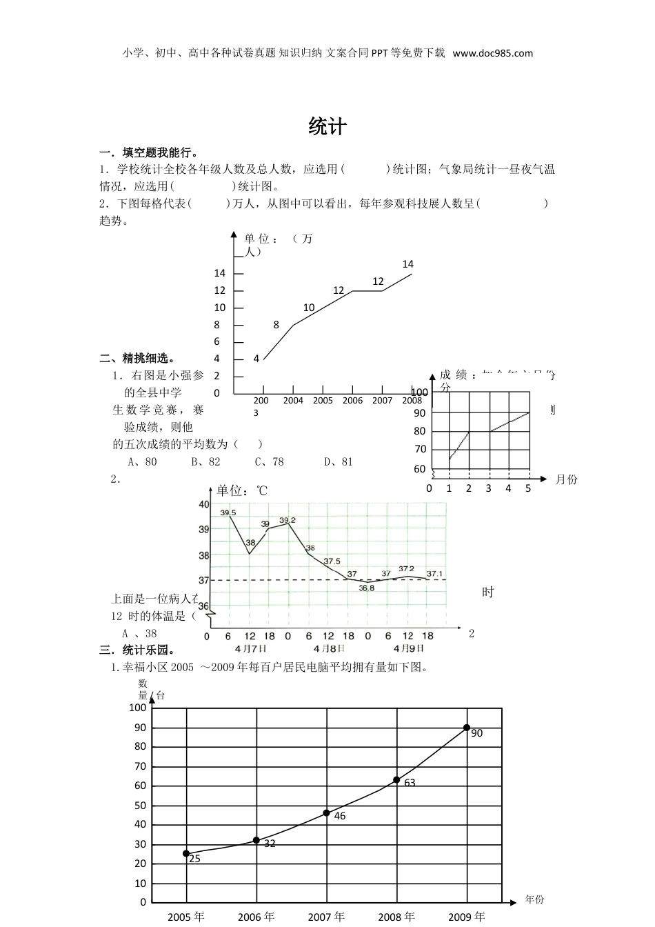 小学、初中、高中各种试卷真题知识归纳文案合同PPT等免费下载www.doc985.com统计一.填空题我能行。1.学校统计全校各年级人数及总人数,应选用()统计图;气象局统计一昼夜气温情况,应选用()统计图。2.下图每格代表()万人,从图中可以看出,每年参观科技展人数呈()趋势。二、精挑细选。1.右图是小强参加今年六月份的全县中学生数学竞赛,赛前每个月的测验成绩,则他的五次成绩的平均数为()A、80B、82C、78D、812.上面是一位病人在4月7日至9日的体温记录折线图,他在4月8日12时的体温是()摄氏度。A、38B、37.5C、37D、39.2三.统计乐园。1.幸福小区2005~2009年每百户居民电脑平均拥有量如下图。年份单位:(万人)024681012142003200420052006200720084810121214单位:摄氏度时70608090100102345月份成绩:分单位:℃数量/台253246639001020304050607080901002005年2006年2007年2008年2009年年份小学、初中、高中各种试卷真题知识归纳文案合同PPT等免费下载www.doc985.com⑴幸福小区2005~2009年每百户居民电脑平均拥有量一共增加了()台。⑵()年到()年这一年电脑平均拥有量增长的幅度最小。()年到()年这一年电脑平均拥有量增长的幅度最大。⑶根据图中的信息预测,2010年幸福小区每百人电脑平均拥有量大约()台。2.中国人的骄傲。(1)根据统计表中的数据,完成统计图。(2)()届取得的奥运金牌数最多,最多的那一届比最少的那一届多()枚。(3)中国获得奥运金牌数的整体是()趋势。(4)请你预测第30届奥运会中国代表团能获得多少枚金牌?在图上画出来。并说出你的理由。(5)你还能提出什么数学问题?3.下面是某地2009年月平均温度变化情况统计图,看图回答下列问题。(1)上面的统计图是()统计图。(2)哪个月的平均气温最高?哪个月的平均气温最低?奥运会/届242526272829金牌枚数5161628325105101520253035温度/摄氏度月份251017.522283232.52619105一二三四五六七八九十十一十二第24--29届奥运会中国获金牌数量统计图金牌/枚605040302010030届27届28届29届25届26届24届届40小学、初中、高中各种试卷真题知识归纳文案合同PPT等免费下载www.doc985.com(3)哪两个月之间的平均气温上升得最快?哪两个月之间的平均气温下降得最快?4.小曼身高一年级时115厘米,二年级时120厘米,三年级时130厘米,四年级时135厘米,五年级时140厘米。请根据上面的数据制成折线统计图。参考答案一.1.条形折线2.2上升二.1.A2.B三.1.(1)65(2)2005200620082009(3)比90多比100少均可2.(2)2946(3)上升3.(1)折线(2)八月最高一月最低(3)三、四十、十一年级