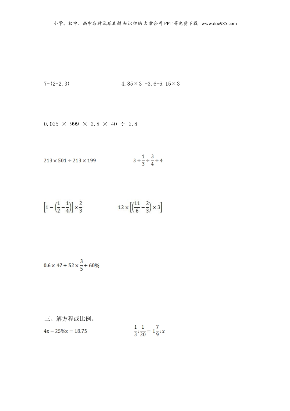 小学、初中、高中各种试卷真题知识归纳文案合同PPT等免费下载www.doc985.com小学计算综合(四)一、口算。[来源:学_科_网Z_X_X_K]小学、初中、高中各种试卷真题知识归纳文案合同PPT等免费下载www.doc985.com二、计算下面各题。(能简算的要简算)0.025×999×2.8×40÷2.8小学、初中、高中各种试卷真题知识归纳文案合同PPT等免费下载www.doc985.com7-(2-2.3)4.85×3-3.6+6.15×3[来源:Zxxk.Com]0.025×999×2.8×40÷2.8[三、解方程或比例。小学、初中、高中各种试卷真题知识归纳文案合同PPT等免费下载www.doc985.com12-4x=2.41.2:7.8=0.4:x【参考答案】:一、【答案】:100009.9541.4252752749.24201360.008360.83010.15.772.91389.91小学、初中、高中各种试卷真题知识归纳文案合同PPT等免费下载www.doc985.com,,,,710,,0.66,,100,二、【解析】:通过观察我们可以发现4/5=0.8原式得0.25×0.8+0.025=0.2+0.025=0.225【答案】:0.225[来源:Z,xx,k.Com]【易错提示】:没有找到运算的关键点,直接相乘导致的计算错误。[来源:学科网]【解析】:通过观察可以发现11÷7=,×4=。所以原式得9.6-+然后利用乘法结合律得9.6-(-)=9.6-1=8.6。【答案】:8.6【易错提示】:直接运算导致的运算失误。【解析】:首先可以观察小括号内分数的分母7和5都是35的因数,可以直接进行约分,避免先通分在计算的繁琐,然后利用乘法分配律得到×35+×35+=25+28+=53+=53+0.75=53.75。【答案】:53.75[来源:Zxxk.Com]【易错提示】:运算顺序的掌握以及乘法分配律的正确运用。小学、初中、高中各种试卷真题知识归纳文案合同PPT等免费下载www.doc985.com【解析】:通过观察可以看出22是11的2倍,34是17的2倍,运用乘法交换律可以得到22××(34×)=10×8=80.【答案】:80【易错提示】:忽视运用乘法交换律直接相乘。[来源:Zxxk.Com]【解析】:运用加法交换律原式得19+11-(+)=30-1=29【答案】:29【易错提示】:注意符号的改变。0.025×999×2.8×40÷2.8【解析】:我们可以将这道题变形为(0.025×40)×999×(2.8÷2.8)。解题过程为:0.025×999×2.8×40÷2.8=(0.025×40)×999×2.8÷2.8=1×999×2.8÷2.8=999×2.8÷2.8=999×(2.8÷2.8)=999×1=999。【答案】:999【解析】:认真观察25,1.25这两个特殊数,然后观察32可以拆分成4和8,变成25×1.25×4×8然后利用乘法交换律和结合律,变为(25×4)×(1.25×8)=100×10=1000【答案】:1000【易错提示】:通过观察找出特殊数,避免直接相乘。【解析】:通过观察发现小括号里的3.75和2.35是同位数小数,而且更方便进行整十的计算,得到(6.1+4.1)×9.8,6.1+4.1=10.2=10+0.2,得到(10+0.2)×9.8,然后利用乘法分配律得到10×9.8+0.2×9.8=98+1.96=99.96。小学、初中、高中各种试卷真题知识归纳文案合同PPT等免费下载www.doc985.com【答案】:99.96【易错提示】:不总结规律,盲目进行运算。【解析】:通过观察发现3/4=0.75,把0.75提取出来得到原式=0.75×101-0.75=0.75×(101-1)=0.75×100=75【答案】:75【易错提示】:找不到运算规律盲目作答。【解析】:分数的分母部分别为15,17,小括号外的整数部分15,17正好可以约掉,所以可以把15,17同时乘进去得到原式=17+15×2=17+30=47。【答案】:477-(2-2.3)【解析】:我们可以通过去括号,将算式变形为7-2+2.3,这是利用去括号得数不变的规律。解题过程为:7-(2-2.3)=7-2+2.3=5+2.3=7.3。【答案】:7.3易错提示:避免去括号的时候不改变符号。4.85×3-3.6+6.15×3【解析】:我们可以将这道题变形为(4.85+6.15)×3-3.6。解题过程为:4.85×3-3.6+6.15×3=(4.85+6.15)×3-3.6=11×3-3.6=33-3.6=29.4。【答案】:29.4易错提示:不仔细观察发现不了简便方法。0.025×999×2.8×40÷2.8【解析】:我们可以将这道题变形为(0.025×40)×999×(2.8÷2.8)。解题过程为:0.025×999×2.8×40÷2.8=(0.025×40)×999×2.8÷2.8=1×999×2.8÷2.8=999×2.8÷2.8=999×(2.8÷2.8)=999×1=999【答案】:999小学、初中、高中各种试卷真题知识归纳文案合同PPT等免费下载www.doc985.com易错提示:不...