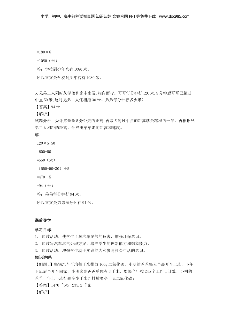 小学、初中、高中各种试卷真题知识归纳文案合同PPT等免费下载www.doc985.com专题练习综合与实践第一课时开心回顾1.三个好朋友在某点进行了一场有趣的运动比赛。小张驾驶电瓶车以36km/h的速度前行,小王以10m/s的速度跑步前进,小李骑自行车每分钟通过的路程是0.6km。则()。A.小张速度最大B.小王速度最大C.小李速度最大D.三人速度一样大【答案】D【解析】试题分析:将三人的速度单位换算成统一的单位,进行比较,即可解答。解:1km=1000m1小时=60分1分钟=60秒小张的速度是:36×1000÷(60×60)=36000÷3600=10(m/s)小李的速度是:0.6×1000÷60=600÷60=10(m/s)答:三个人的速度一样。故选D。2.下方说法错误的是()。A.同比是本期发展水平与去年同期发展水平相比B.环比是本期发展水平与其他同期发展水平的比较C.环比是本期发展那水平与前一期水平相比[来源:学。科。网Z。X。X。K]D.以上都是错的【答案】B【解析】试题解析:根据同比、环比的定义,即可判断。解:小学、初中、高中各种试卷真题知识归纳文案合同PPT等免费下载www.doc985.com同比是本期发展水平与去年同期发展水平相比。环比是报告期发展那水平与前一期水平相比。所以说法B错误。故选B。3.某运动商城的自行车销售量自2015年起逐月增加,据统计该商城1月份销售自行车60辆,2月份销售了90辆,,若该商城前3个月的自行车销量的月增长率相同,问该商城3月份卖出多少辆自行车?【答案】135辆【解析】试题分析:根据1月份和2月份的销售量计算出月增长率,再根据月增长率计算出3月份卖出的自行车辆数。解:(90-60)÷60×100%=30÷60×100%=50%90×(1+50%)=90×150%=135(辆)答:该商城3月份卖出135辆自行车。所以答案是该商城3月份卖出135辆自行车。4.小玲每分钟行100米,小平每分钟行80米,两人同时从学校和少年宫相向而行,并在离中点120米处相遇,学校到少年宫有多少米?【答案】1080米【解析】试题分析:两人相遇时,所用的时间相等,在离中点120米处相遇,所以在相同时间内速度快的比速度慢的要多走了120米,根据两人的速度差,计算出相遇时用的时间,再根据时间计算出学校到少年宫的距离。解:120÷(100-80)=120÷20=6(分钟)(100+80)×6小学、初中、高中各种试卷真题知识归纳文案合同PPT等免费下载www.doc985.com=180×6=1080(米)答:学校到少年宫有1080米。所以答案是学校到少年宫有1080米。5.兄弟二人同时从学校和家中出发,相向而行。哥哥每分钟行120米,5分钟后哥哥已超过中点50米,这时兄弟二人还相距30米。弟弟每分钟行多少米?【答案】94米【解析】试题分析:先计算哥哥5分钟走的距离,再减去超过中点的距离就是路程的一半。再根据兄弟二人相距的距离,计算出弟弟走的距离和速度。解:120×5-50=600-50=550(米)(550-50-30)÷5=470÷5=94(米)答:弟弟每分钟行94米。所以答案是弟弟每分钟行94米。课前导学学习目标:[来源:学|科|网Z|X|X|K]1.通过活动,使学生了解汽车尾气的危害,增强环保意识。2.通过写汽车尾气处理方案,培养学生的创新能力和想象能力。3.通过活动,增强学生动手实践能力和参与社会生活的意识。知识讲解:【例题1】每辆汽车平均每千米排放160g二氧化碳,小明的爸爸每天早晨开车上班,下午下班后再开车回家,小明家到爸爸单位有3千米,如果全年按245个工作日计算,小明的爸爸一年上下班行驶多少千米?排放多少千克二氧化碳?【答案】1470千米;235.2千克【解析】小学、初中、高中各种试卷真题知识归纳文案合同PPT等免费下载www.doc985.com试题分析:先计算小明爸爸一年开车行驶的距离,再根据距离计算出一年排放的二氧化碳排。注意小明的爸爸一天行驶2个路程的距离。解:3×2×245=6×245=1470(千米)1470×160=235200(克)235200÷1000=235.2(千克)答:小明的爸爸一年上下班行驶1470千米,排放235.2千克二氧化碳。所以答案是小明的爸爸一年上下班行驶1470千米,排放235.2千克二氧化碳。【例题2】某公司为“低碳生活,绿色出行”,要求公司100名有车的员工,奇数日开车,偶数日步行或骑自行车上班,按每辆汽车日行20千米,每千米排放160g二氧化碳计算,请问9月份该公司...