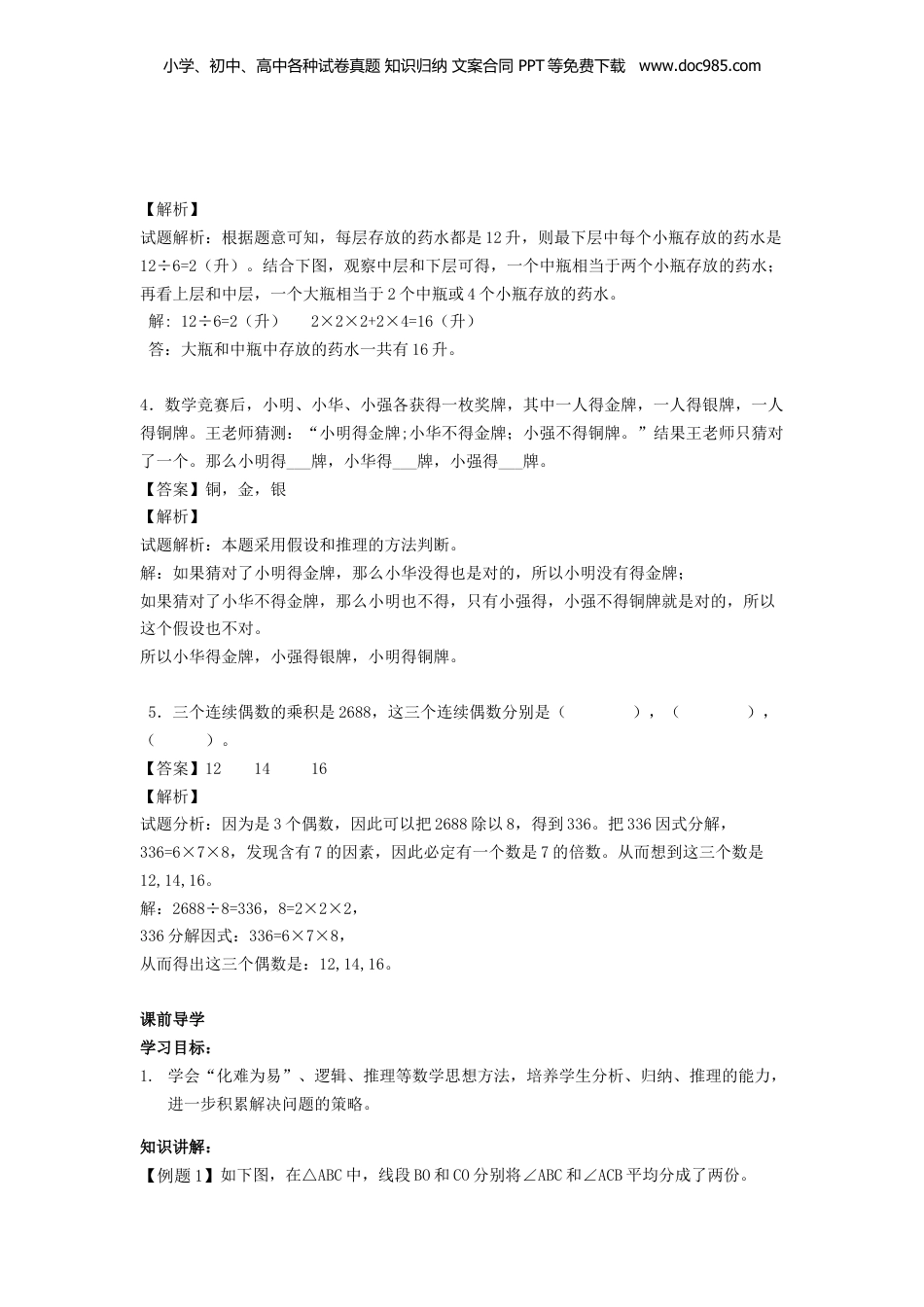 小学、初中、高中各种试卷真题知识归纳文案合同PPT等免费下载www.doc985.com专题练习数学思考开心回顾1.有一列字母ACAABAACAABAAC……问:第74个字母是(),这前74个字母中一共有()个A。【答案】503812【解析】试题分析:这些字母每6个为一个周期,即ACAABA,所以如果74正好是6的倍数,则第74个字母是A,而74÷6=12……2,所以第74个字母是第12个周期后的第2个字母C解:74÷6=12……2,所以第74个字母是第12个周期后的第2个字母C;一个周期有4个A,再加上12个周期后的一个A,12×4+1=49,所以第74个字母是C,这前74个字母中一共有49个A。2.按规律填数:5、20、45、80、125、()、245、()。【答案】180320【解析】试题分析:仔细观察,第1个数和第2个数相差15;第2个数和第3个数相差25;第3个数和第4个数相差35,所以第4个数和第5个数相差45,往后每两个数相差的数为55,65,75……解:第1个数和第2个数相差15;第2个数和第3个数相差25;第3个数和第4个数相差35,所以第4个数和第5个数相差45,往后每两个数相差的数为55,65,75……125+55=180,180+65=245,245+75=320故答案为:180,3203.如下图,仪器架分三层,上层放一个大瓶和一个中瓶,中间放一个中瓶和4个小瓶,下层放6个小瓶。已知每层存放的药水量是一样多的,这个仪器架上存放的药水共36升。大瓶和中瓶中存放的药水一共有多少升?[来源:学#科#网Z#X#X#K]【答案】16升小学、初中、高中各种试卷真题知识归纳文案合同PPT等免费下载www.doc985.com【解析】试题解析:根据题意可知,每层存放的药水都是12升,则最下层中每个小瓶存放的药水是12÷6=2(升)。结合下图,观察中层和下层可得,一个中瓶相当于两个小瓶存放的药水;再看上层和中层,一个大瓶相当于2个中瓶或4个小瓶存放的药水。解:12÷6=2(升)2×2×2+2×4=16(升)答:大瓶和中瓶中存放的药水一共有16升。4.数学竞赛后,小明、小华、小强各获得一枚奖牌,其中一人得金牌,一人得银牌,一人得铜牌。王老师猜测:“小明得金牌;小华不得金牌;小强不得铜牌。”结果王老师只猜对了一个。那么小明得___牌,小华得___牌,小强得___牌。【答案】铜,金,银【解析】试题解析:本题采用假设和推理的方法判断。解:如果猜对了小明得金牌,那么小华没得也是对的,所以小明没有得金牌;如果猜对了小华不得金牌,那么小明也不得,只有小强得,小强不得铜牌就是对的,所以这个假设也不对。所以小华得金牌,小强得银牌,小明得铜牌。5.三个连续偶数的乘积是2688,这三个连续偶数分别是(),(),()。【答案】121416【解析】试题分析:因为是3个偶数,因此可以把2688除以8,得到336。把336因式分解,336=6×7×8,发现含有7的因素,因此必定有一个数是7的倍数。从而想到这三个数是12,14,16。解:2688÷8=336,8=2×2×2,336分解因式:336=6×7×8,从而得出这三个偶数是:12,14,16。课前导学学习目标:1.学会“化难为易”、逻辑、推理等数学思想方法,培养学生分析、归纳、推理的能力,进一步积累解决问题的策略。知识讲解:【例题1】如下图,在△ABC中,线段BO和CO分别将∠ABC和∠ACB平均分成了两份。小学、初中、高中各种试卷真题知识归纳文案合同PPT等免费下载www.doc985.com(1)若∠1+∠2=50°,那么∠O是多少度?(2)若∠ABC+∠ACB=120°,那么∠O是多少度?(3)若∠A=70°,那么∠O是多少度?(4)通过计算,你发现∠O与∠A的关系是什么?【答案】130°;120°;125°;∠O等于90°加上∠A的一半【解析】试题解析:第(1)题直接利用三角形内角和定理计算;根据“线段BO和CO分别将∠ABC和∠ACB平均分成了两份”,则∠1与∠2之和是∠ABC与∠ACB之和的一半,据此解答第(2)题;第(3)题利用三角形的内角和公式可得∠ABC与∠ACB之和为110°,再按上题的方法计算出∠O的度数;第(4)题利用已知条件和三角形内角和定理,推导出∠O与∠A的关系。解:(1)∠O=180°-50°=130°,若∠1+∠2=50°,那么∠O是130°。(2)∠O=180°-120°÷2=120°,若∠ABC+∠ACB=120°,那么∠O是120°。(3)∠O=180°-(180°-70°)÷2=125°若∠A=70°,∠O是125°。(4)∠O=180...