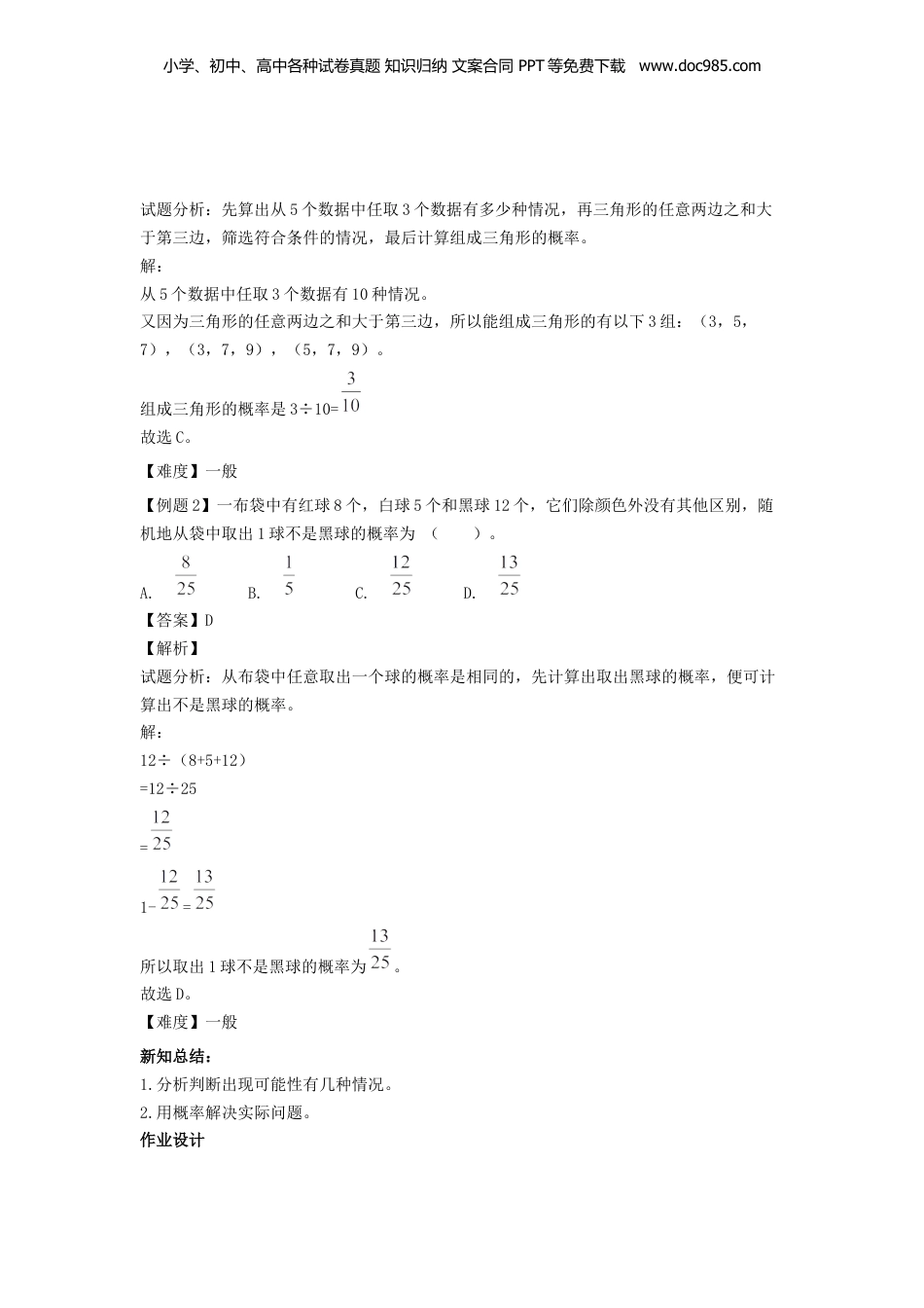 小学、初中、高中各种试卷真题知识归纳文案合同PPT等免费下载www.doc985.com专题练习统计与概率第二课时开心回顾1.“人用左手拿筷子吃饭”这个事件发生的可能性是()。A.不可能B.可能C.不可能【答案】B【解析】试题分析:根据生活常识。即可判断。解:大多数人用右手拿筷子吃饭,也有人用左手拿筷子吃饭,因此“人用左手拿筷子吃饭”是可能的。故选B。【难度】容易2.王帅和李明下跳棋,用掷骰子的方式决定每一次走几步,骰子各面分别是1、2、3、4、5、6,掷骰子出现每个数字的可能是()。【答案】【解析】试题分析:骰子各面分别是1、2、3、4、5、6,每次掷出后每个数字都有可能出现。解:1÷6=[来源:学科网ZXXK]所以答案是:。【难度】容易3.如果甲邀请乙玩一个同时抛掷两枚硬币的游戏,游戏的规则如下:同时抛出两个正面,乙得1分;抛出其他结果,甲得1分.谁先累积到10分,谁就获胜.你认为()获胜的可能性更大。【答案】甲【解析】试题分析:同时抛掷两枚硬币有(正面,正面)、(正面,反面)、(反面,反面)3种情况,分别计算出抛出两个正面和其他情况的概率,根据各自的概率情况进行解答。解:小学、初中、高中各种试卷真题知识归纳文案合同PPT等免费下载www.doc985.com同时抛出两个正面的概率是,其他情况的概率是,>,所以抛出其他结果的概率大,甲得分的概率大,甲获胜的可能性大。故答案为:甲。【难度】容易4.三(1)班有男生26人,女生14人,每次抽一人做游戏,抽到()的可能性大。A.男生B.女生C.无法确定【答案】A【解析】解:男生比女生多,所以抽到男生的可能性大。[来源:Zxxk.Com]故答案为:A。【难度】容易5.某城市一日的天气预报为:多云转小雨,29℃~~18℃,降水概率80%,这一天一定会下雨。()【答案】×【解析】试题分析:正确理解概率的性质,即可解答。解:降水概率80%,表示有可能下雨,但不一定下雨,所以说法错误。所以答案是×。【难度】一般课前导学学习目标:1.熟练掌握概率的定义性质。2.通过可能性,转化为事物发生的概率。知识讲解:[来源:学科网]【例题1】从长度分别为1,3,5,7,9个单位的5条线段中任取3条作边,能组成三角形的概率为()。A.B.C.D.【答案】C【解析】小学、初中、高中各种试卷真题知识归纳文案合同PPT等免费下载www.doc985.com试题分析:先算出从5个数据中任取3个数据有多少种情况,再三角形的任意两边之和大于第三边,筛选符合条件的情况,最后计算组成三角形的概率。解:从5个数据中任取3个数据有10种情况。又因为三角形的任意两边之和大于第三边,所以能组成三角形的有以下3组:(3,5,7),(3,7,9),(5,7,9)。组成三角形的概率是3÷10=故选C。【难度】一般【例题2】一布袋中有红球8个,白球5个和黑球12个,它们除颜色外没有其他区别,随机地从袋中取出1球不是黑球的概率为()。A.B.C.D.【答案】D【解析】试题分析:从布袋中任意取出一个球的概率是相同的,先计算出取出黑球的概率,便可计算出不是黑球的概率。解:12÷(8+5+12)=12÷25=1-=所以取出1球不是黑球的概率为。故选D。【难度】一般新知总结:1.分析判断出现可能性有几种情况。2.用概率解决实际问题。作业设计小学、初中、高中各种试卷真题知识归纳文案合同PPT等免费下载www.doc985.com1.军军的文具盒中有两支蜡笔,一支红色的、一支绿色的;三支水彩笔,分别是黄色、黑色、红色,任意拿出一支蜡笔和一支水彩笔,正好都是红色的概率为()。A.B.C.D.[来源:学_科_网Z_X_X_K]【答案】D【解析】试题分析:先算出任意拿出一支蜡笔和一支水彩笔一共有几种情况,再看看都是红色的概率是多少。解:任意拿出一支蜡笔和一支水彩笔一共有(红、黄),(红、黑),(红、红),(绿、黄),(绿、黑),(绿、红)6种情况,6种情况种只有一种情况是(红、红)。所以正好都是红色的概率是:1÷6=故选D。【难度】一般2.用6个球(除颜色外没有区别)设计满足以下条件的游戏:摸到白球的概率为,摸到红球的概率为,摸到黄球的概率为,则应设()个白球,()个红球,()个黄球。【答案】3,2,1【解析】试题分析:根据每种球出现的概率和球的总数,依次计...