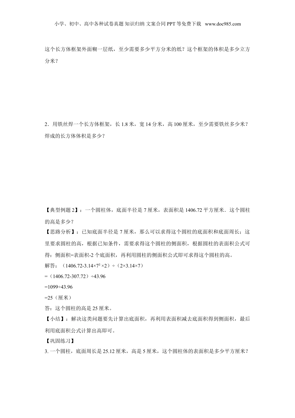 小学、初中、高中各种试卷真题知识归纳文案合同PPT等免费下载www.doc985.com第五讲立体图形应用题【基础概念】:在小学阶段学过的立体图形有长方体、正方体、圆柱、圆锥,与这些图形有关的问题叫作立体图形应用题;有关的公式:长方体:表面积公式:S=(ab+ah+bh)×2,体积公式:V=abh=Sh;正方体:表面积公式:S=6a²,体积公式:V=a³;圆柱:侧面积:S侧=Ch=2πrh=πdh,表面积:S=S侧+2S底,体积:V=S底h;圆锥:体积:V=S底h。【典型例题1】:李力爱好手工制作,用一根长48分米的铁丝做了一个长方体框架,使它的长、宽、高的比是5:4:3.在这个长方体框架外面糊了一层彩色的纸,至少需要多少平方分米的彩纸?它的体积是多少立方分米?【思路分析】:用一根长48分米的铁丝做了一个长方体框架也就是长方体的棱长总和是48分米,首先用棱长总和除以4求出长、宽、高的和,再利用按比例分配的方法分别求出长、宽、高,然后根据长方体的表面积公式:s=(ab+ah+bh)×2,体积公式:v=abh,把数据代入公式解答即可。解答:长:48÷4×=12×=5(分米)宽:48÷4×=12×=4(分米)高:48÷4×=12×=3(分米);(5×4+5×3+4×3)×2=(20+15+12)×2=47×2=94(平方分米)5×4×3=60(立方分米)答:至少需要94平方分米的彩纸,它的体积是60立方分米。【小结】:解决这类问题要先计算出棱长,再利用表面积公式与体积公式计算。【巩固练习】1.用一根长48分米的铁丝做一个长方体框架,长和宽的比是4:1,宽和高长度相等,在小学、初中、高中各种试卷真题知识归纳文案合同PPT等免费下载www.doc985.com这个长方体框架外面糊一层纸,至少需要多少平方分米的纸?这个框架的体积是多少立方分米?2.用铁丝焊一个长方体框架,长1.8米,宽14分米,高100厘米,至少需要铁丝多少米?焊成的长方体体积是多少?【典型例题2】:一个圆柱体,底面半径是7厘米,表面积是1406.72平方厘米.这个圆柱的高是多少?【思路分析】:已知底面半径是7厘米,那么可以求得这个圆柱的底面积和底面周长;这里要求圆柱的高,根据已知条件,需要求得这个圆柱的侧面积,根据圆柱的表面积公式可得:侧面积=表面积-2个底面积,再利用圆柱的侧面积公式即可求得这个圆柱的高。解答:(1406.72-3.14×7²×2)÷(2×3.14×7)=(1406.72-307.72)÷43.96=1099÷43.96=25(厘米)答:这个圆柱的高是25厘米。【小结】:解决这类问题要先计算出底面积,再利用表面积减去底面积得到侧面积,最后利用底面积公式计算出高即可。【巩固练习】3.一个圆柱,底面周长是25.12厘米,高是5厘米,这个圆柱体的表面积是多少平方厘米?小学、初中、高中各种试卷真题知识归纳文案合同PPT等免费下载www.doc985.com4.一个圆柱体沿底面直径和高切开后,切面是一个边长为6厘米的正方形,这个圆柱体的表面积是多少平方厘米?答案及解析:1.【解析】长方体的12条棱分为互相平行的3组,每组4条棱的长度相等,已知棱长总和是48分米,先求出长、宽、高的和,再利用按比例分配分别求出它的长、宽、高;再根据长方体的表面积和体积公式解答即可。【答案】:(1)长、宽、高的和是:小学、初中、高中各种试卷真题知识归纳文案合同PPT等免费下载www.doc985.com48÷4=12(分米)总份数是:4+1+1=6(份)12×=8(分米)12×=2(分米)表面积是:(8×2+2×2+2×8)×2=(16+4+16)×2=36×2=72(平方分米);答:至少需要72平方分米的纸。(2)8×2×2=32(立方分米)答:这个框架的体积是32立方分米。2.【解析】(1)铁丝的长度,就是这个长方体的棱长总和,由此利用棱长总和公式即可解答;(2)长方体的体积=长×宽×高,代入数据即可解答。【答案】14分米=1.4米,100厘米=1米,所以棱长总和是:(1.8+1.4+1)×4=4.2×4=16.8(米)体积是:1.8×1.4×1=2.52(立方米)答:至少需要铁丝16.8米,焊成的长方体体积是2.52立方米。3.【解析】圆柱的侧面积=底面周长×高,由此可求出圆柱的侧面积,再根据底面周长求出圆柱的底面半径,进而求出底面积,最后利用圆柱的表面积公式计算即可。【答案】:侧面积是:25.12×5=125.6(平方厘米)底面半径是:25.12÷3.1...