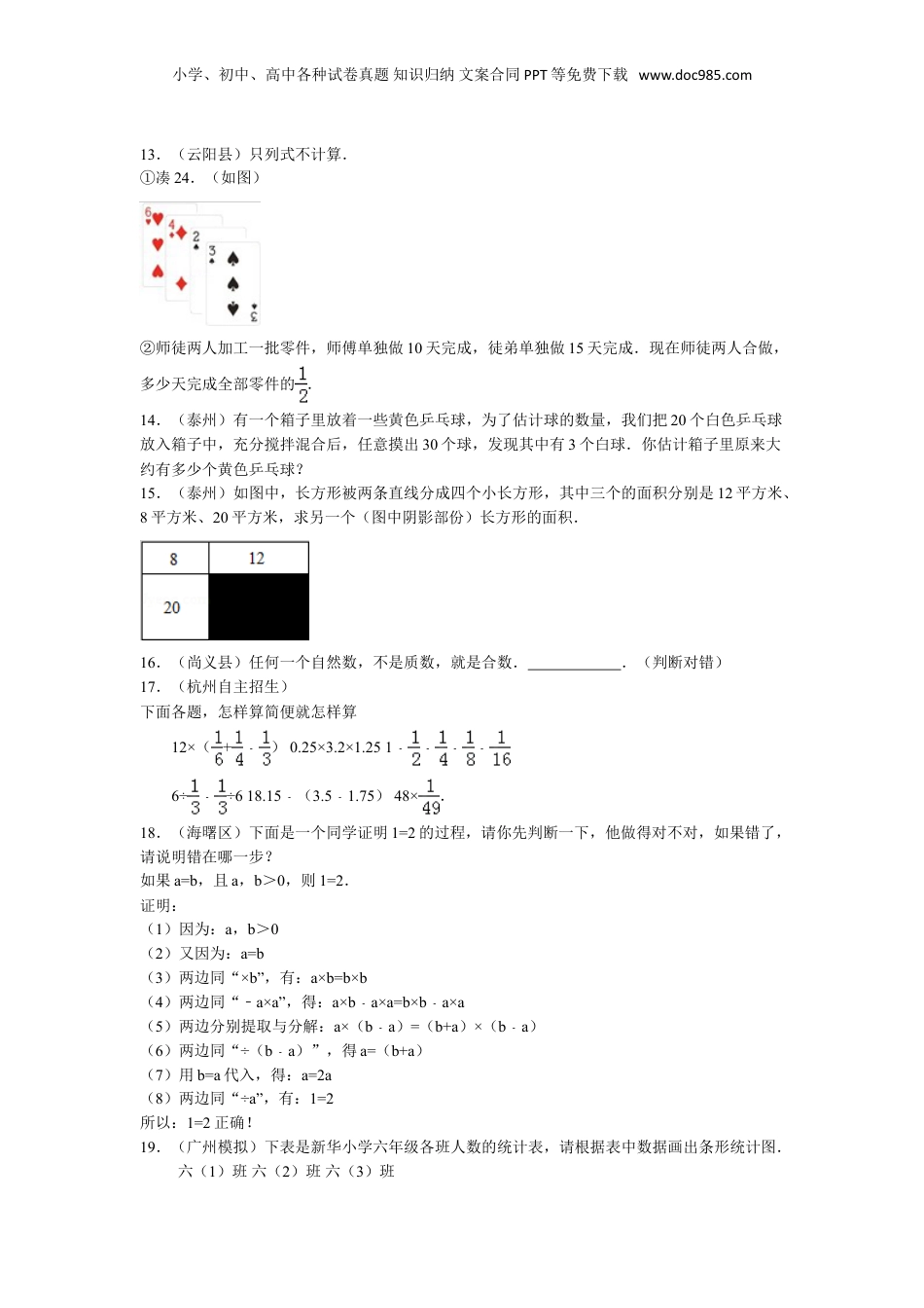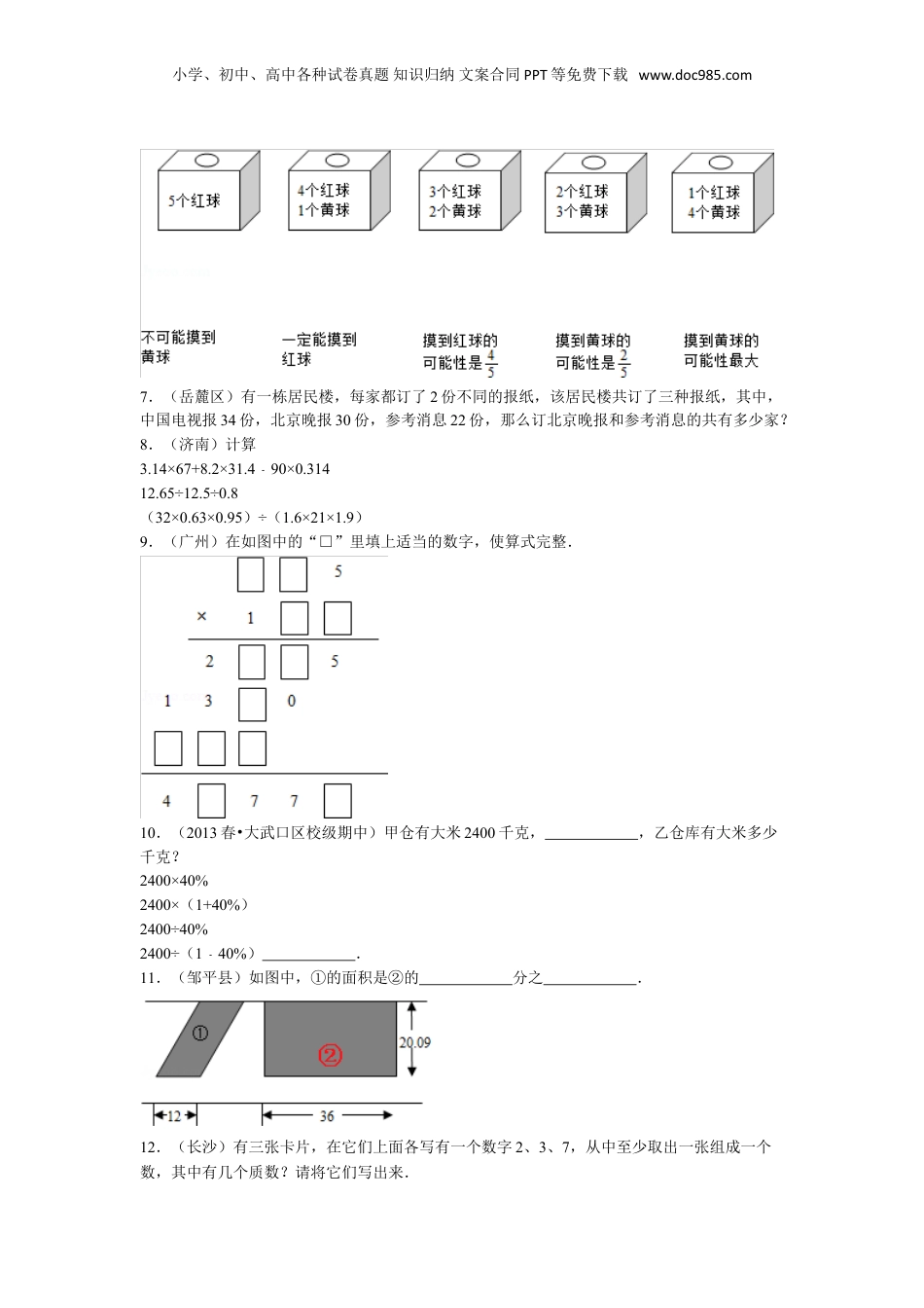 小学、初中、高中各种试卷真题知识归纳文案合同PPT等免费下载www.doc985.com【精品】小升初数学试题精粹100例及解析-全国常考题1.(长沙)五位裁判员给一名体操运动员评分后,去掉一个最高分和一个最低分,平均得9.58分;只去掉一个最高分,平均得9.46分;只去掉一个最低分,平均得9.66分.这个运动员的最高分与最低分相差多少?2.(长沙)上午8时8分,小明骑自行车从家里出发,8分后,爸爸骑摩托车去追他,在离家4千米的地方追上了他,然后爸爸立刻回家.到家后又立刻回头去追小明,再追上他的时候,离家恰好是8千米,问这时是几时几分?3.(长沙)有一个电动玩具,它有一个8.28×5.14的长方形盘(单位:厘米)和一个半径为1厘米的小圆盘(盘中画有娃娃脸)它们的连接点为A、B(如图)如果小圆盘沿着长方形内壁,从A点出发,不停的滚动(无滑动),最后回到原来位置,请你计算一下,小圆盘(娃娃脸)在B、C、D位置是怎样的,并请画出示意图?小圆盘共自转了几圈?4.(长沙)修一条路,第一天修了全长的,第二天修了全长的,还剩全长的几分之几没有修?5.(长沙)六(1)班共有40人,下面是他们一些最喜欢的饮料的统计图,请问每种饮料各有多少人喜欢?6.(云阳县)连线小学、初中、高中各种试卷真题知识归纳文案合同PPT等免费下载www.doc985.com7.(岳麓区)有一栋居民楼,每家都订了2份不同的报纸,该居民楼共订了三种报纸,其中,中国电视报34份,北京晚报30份,参考消息22份,那么订北京晚报和参考消息的共有多少家?8.(济南)计算3.14×67+8.2×31.490×0.314﹣12.65÷12.5÷0.8(32×0.63×0.95)÷(1.6×21×1.9)9.(广州)在如图中的“□”里填上适当的数字,使算式完整.10.(2013春•大武口区校级期中)甲仓有大米2400千克,,乙仓库有大米多少千克?2400×40%2400×(1+40%)2400÷40%2400÷(140%﹣).11.(邹平县)如图中,①的面积是②的分之.12.(长沙)有三张卡片,在它们上面各写有一个数字2、3、7,从中至少取出一张组成一个数,其中有几个质数?请将它们写出来.小学、初中、高中各种试卷真题知识归纳文案合同PPT等免费下载www.doc985.com13.(云阳县)只列式不计算.①凑24.(如图)②师徒两人加工一批零件,师傅单独做10天完成,徒弟单独做15天完成.现在师徒两人合做,多少天完成全部零件的.14.(泰州)有一个箱子里放着一些黄色乒乓球,为了估计球的数量,我们把20个白色乒乓球放入箱子中,充分搅拌混合后,任意摸出30个球,发现其中有3个白球.你估计箱子里原来大约有多少个黄色乒乓球?15.(泰州)如图中,长方形被两条直线分成四个小长方形,其中三个的面积分别是12平方米、8平方米、20平方米,求另一个(图中阴影部份)长方形的面积.16.(尚义县)任何一个自然数,不是质数,就是合数..(判断对错)17.(杭州自主招生)下面各题,怎样算简便就怎样算12×(+﹣)0.25×3.2×1.251﹣﹣﹣﹣6÷﹣÷618.15﹣(3.51.75﹣)48×.18.(海曙区)下面是一个同学证明1=2的过程,请你先判断一下,他做得对不对,如果错了,请说明错在哪一步?如果a=b,且a,b>0,则1=2.证明:(1)因为:a,b>0(2)又因为:a=b(3)两边同“×b”,有:a×b=b×b(4)两边同“﹣a×a”,得:a×ba×a=b×ba×a﹣﹣(5)两边分别提取与分解:a×(ba﹣)=(b+a)×(ba﹣)(6)两边同“÷(ba﹣)”,得a=(b+a)(7)用b=a代入,得:a=2a(8)两边同“÷a”,有:1=2所以:1=2正确!19.(广州模拟)下表是新华小学六年级各班人数的统计表,请根据表中数据画出条形统计图.六(1)班六(2)班六(3)班小学、初中、高中各种试卷真题知识归纳文案合同PPT等免费下载www.doc985.com男生232224女生222526根据数据画统计图回答问题.(1)六班的人数最多,共有人.(2)六(1)班人数相当于六(3)班的%.(3)全年级平均每个班大约有学生人.20.(广州)=15÷=七五折.21.(高台县)折线统计图不但可表示数量的多少,而且能够清楚地表示出数量增减变化的情况.(判断对错)22.(东莞)两个面积相等的三角形一定能拼成一个平行四边形..(判断对...