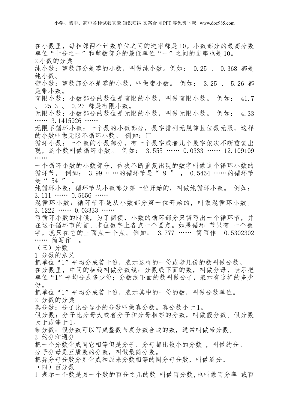 小学、初中、高中各种试卷真题知识归纳文案合同PPT等免费下载www.doc985.com人教版小升初数学总复习资料一、基本概念第一章数和数的运算一概念(一)整数1整数的意义自然数和0都是整数。2自然数我们在数物体的时候,用来表示物体个数的1,2,3……叫做自然数。一个物体也没有,用0表示。0也是自然数。3计数单位一(个)、十、百、千、万、十万、百万、千万、亿……都是计数单位。每相邻两个计数单位之间的进率都是10。这样的计数法叫做十进制计数法。4数位计数单位按照一定的顺序排列起来,它们所占的位置叫做数位。5数的整除整数a除以整数b(b≠0),除得的商是整数而没有余数,我们就说a能被b整除,或者说b能整除a。如果数a能被数b(b≠0)整除,a就叫做b的倍数,b就叫做a的因数(或a的约数)。倍数和因数是相互依存的。因为35能被7整除,所以35是7的倍数,7是35的因数。一个数的因数的个数是有限的,其中最小的因数是1,最大的因数是它本身。例如:10的因数有1、2、5、10,其中最小的因数是1,最大的因数是10。一个数的倍数的个数是无限的,其中最小的倍数是它本身。3的倍数有:3、6、9、12……其中最小的倍数是3,没有最大的倍数。个位上是0、2、4、6、8的数,都能被2整除,例如:202、480、304,都能被2整除。。个位上是0或5的数,都能被5整除,例如:5、30、405都能被5整除。。一个数的各位上的数的和能被3整除,这个数就能被3整除,例如:12、108、204都能被3整除。一个数各位数上的和能被9整除,这个数就能被9整除。能被3整除的数不一定能被9整除,但是能被9整除的数一定能被3整除。一个数的末两位数能被4(或25)整除,这个数就能被4(或25)整除。例如:16、404、1256都能被4整除,50、325、500、1675都能被25整除。一个数的末三位数能被8(或125)整除,这个数就能被8(或125)整除。例如:1168、4600、5000、12344都能被8整除,1125、13375、5000都能被125整除。小学、初中、高中各种试卷真题知识归纳文案合同PPT等免费下载www.doc985.com能被2整除的数叫做偶数。不能被2整除的数叫做奇数。0也是偶数。自然数按能否被2整除的特征可分为奇数和偶数。一个数,如果只有1和它本身两个因数,这样的数叫做质数(或素数),100以内的质数有:2、3、5、7、11、13、17、19、23、29、31、37、41、43、47、53、59、61、67、71、73、79、83、89、97。一个数,如果除了1和它本身还有别的因数,这样的数叫做合数,例如4、6、8、9、12都是合数。1不是质数也不是合数,自然数除了1外,不是质数就是合数。如果把自然数按其因数的个数的不同分类,可分为质数、合数和1。每个合数都可以写成几个质数相乘的形式。其中每个质数都是这个合数的因数,叫做这个合数的质因数,例如15=3×5,3和5叫做15的质因数。把一个合数用质因数相乘的形式表示出来,叫做分解质因数。例如把28分解质因数几个数公有的因数,叫做这几个数的公因数。其中最大的一个,叫做这几个数的最大公因数,例如12的因数有1、2、3、4、6、12;18的因数有1、2、3、6、9、18。其中,1、2、3、6是12和18的公因数,6是它们的最大公因数。公因数只有1的两个数,叫做互质数,成互质关系的两个数,有下列几种情况:1和任何自然数互质。相邻的两个自然数互质。两个不同的质数互质。当合数不是质数的倍数时,这个合数和这个质数互质。两个合数的公因数只有1时,这两个合数互质,如果几个数中任意两个都互质,就说这几个数两两互质。如果较小数是较大数的因数,那么较小数就是这两个数的最大公因数。如果两个数是互质数,它们的最大公因数就是1。几个数公有的倍数,叫做这几个数的公倍数,其中最小的一个,叫做这几个数的最小公倍数,如2的倍数有2、4、6、8、10、12、14、16、18……3的倍数有3、6、9、12、15、18……其中6、12、18……是2、3的公倍数,6是它们的最小公倍数。。如果较大数是较小数的倍数,那么较大数就是这两个数的最小公倍数。如果两个数是互质数,那么这两个数的积就是它们的最小公倍数。几个数的公因数的个数是有限的,而几个数的公倍数的个数是无限的。(二)小数1小数的意义把整数1平均分成10份、100份、1000份……...